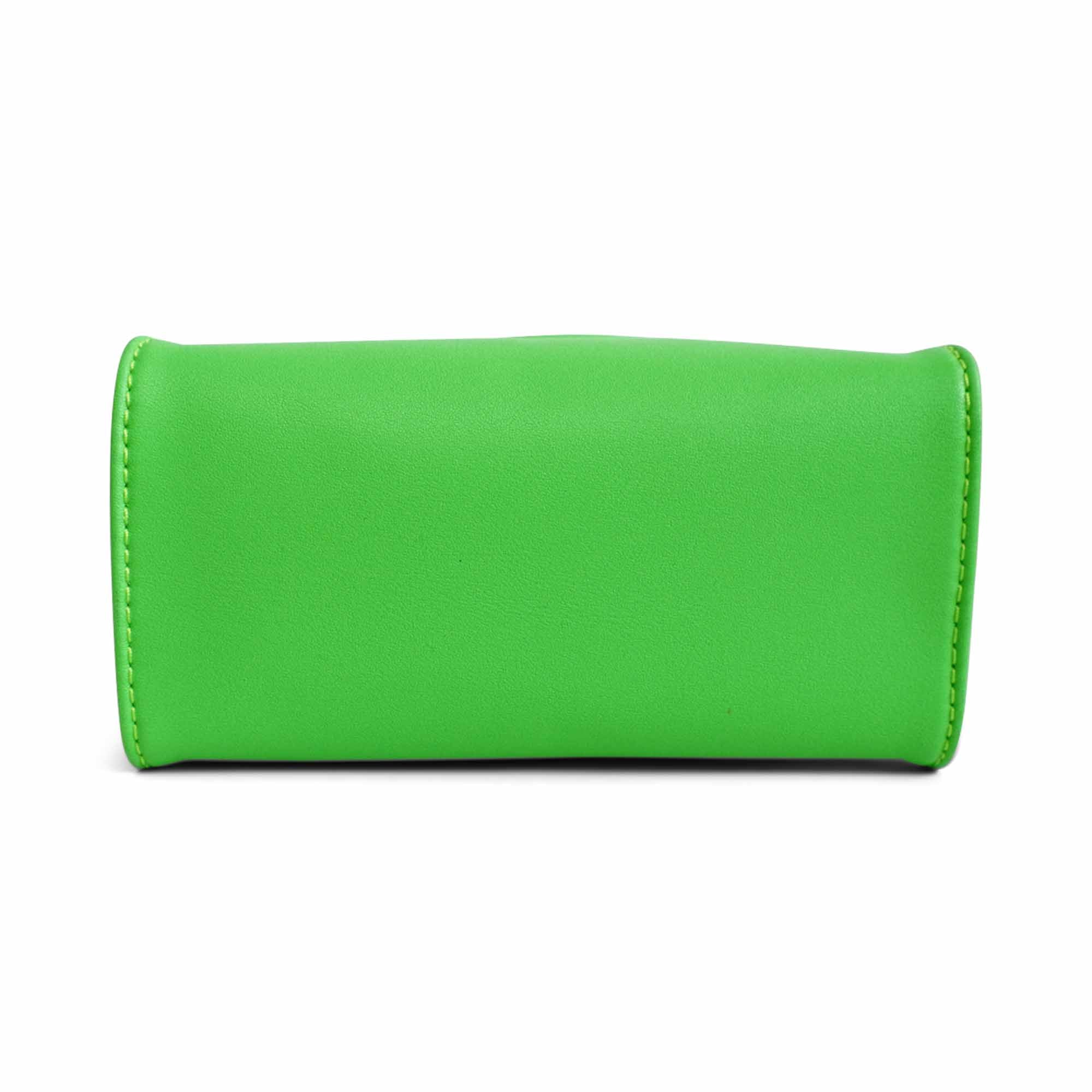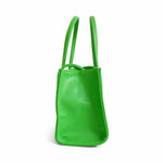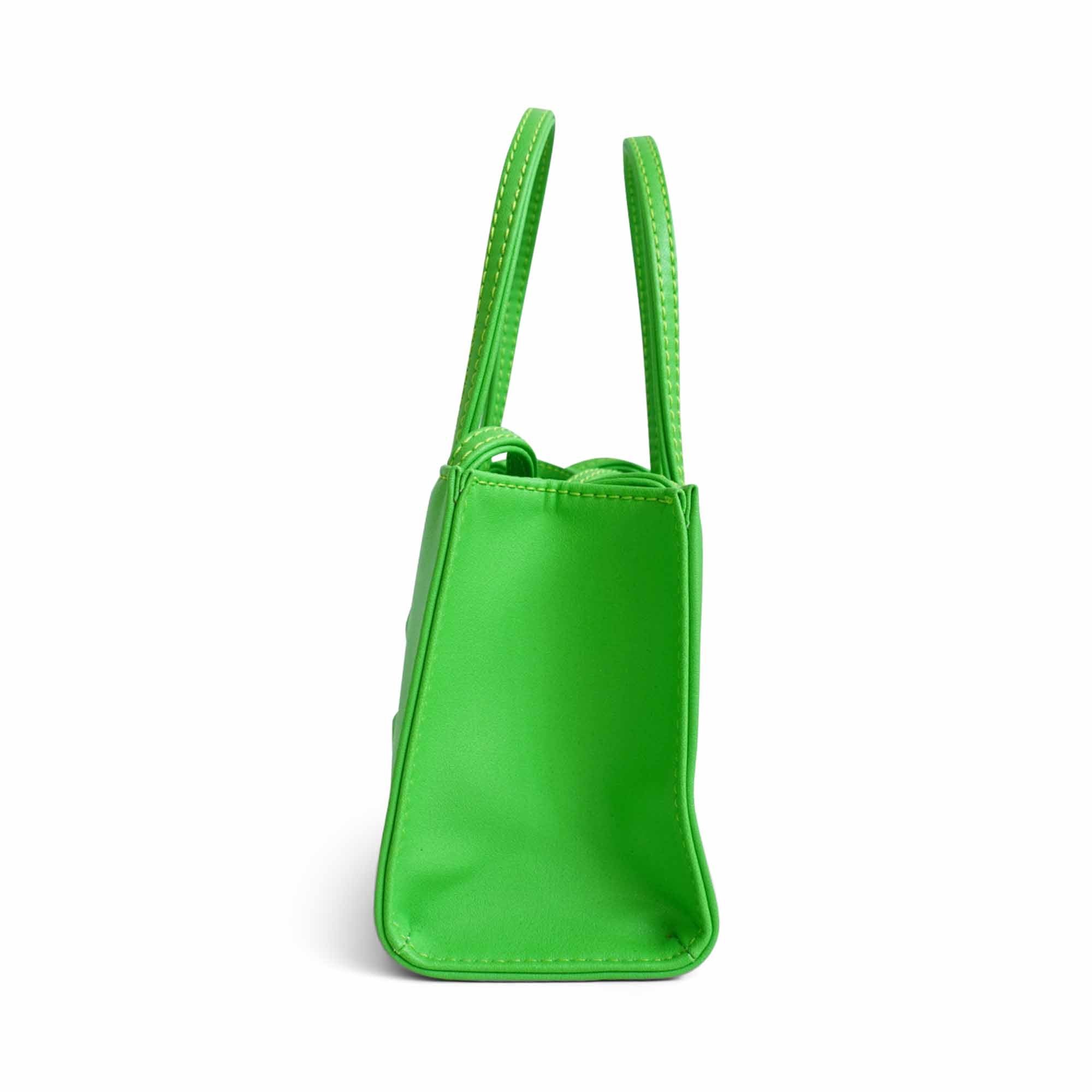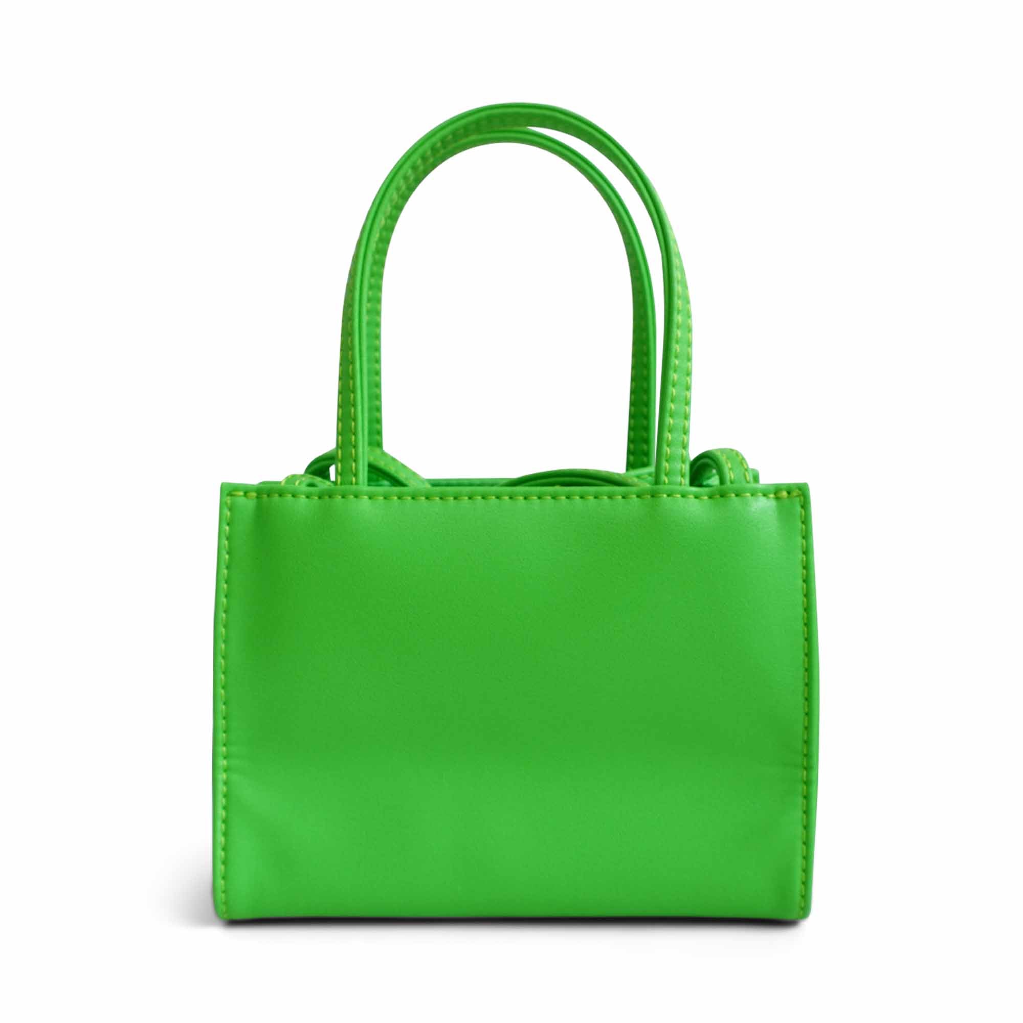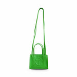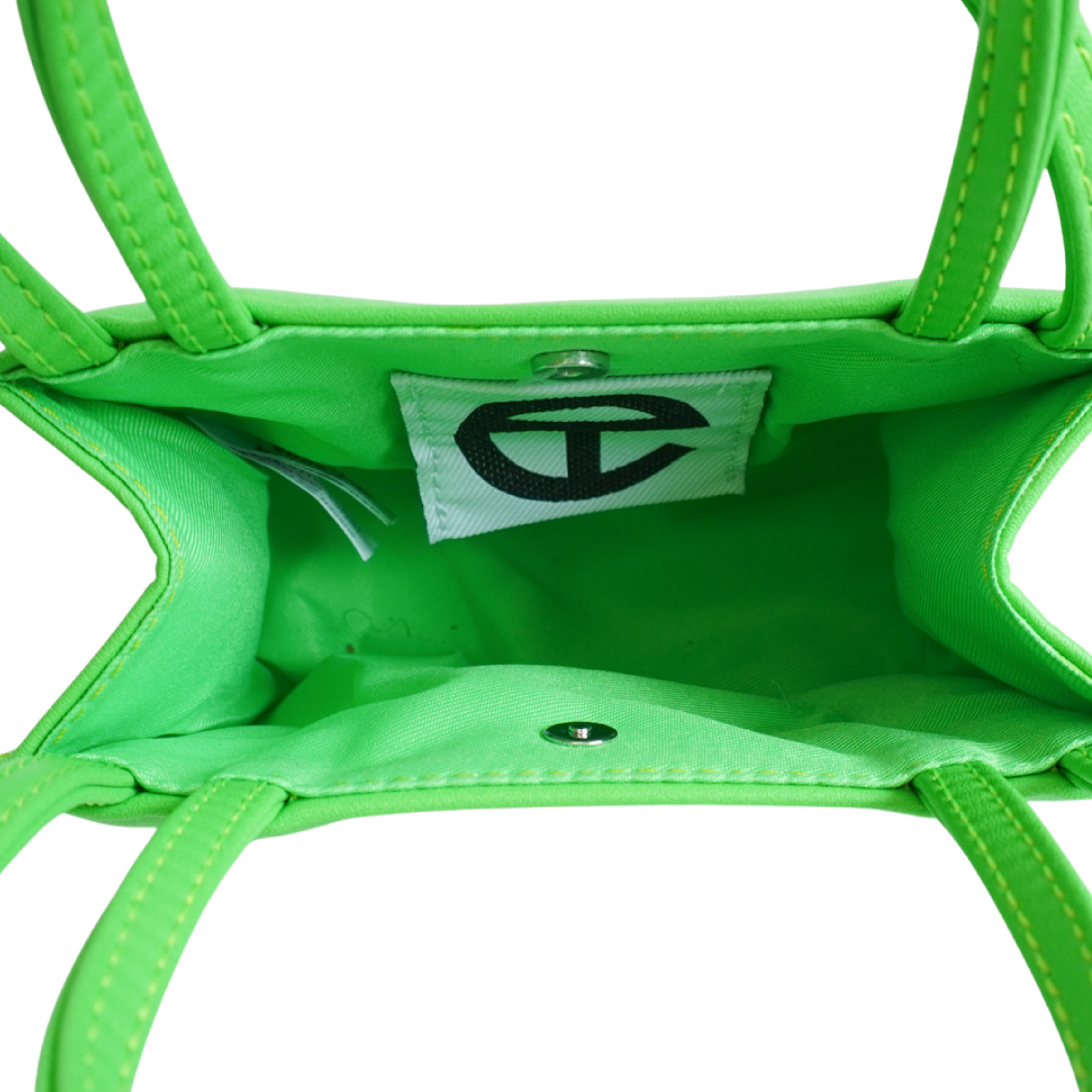 Telfar 'Small Shopping Bag' in neon green vegan leather with dual top handles and crossbody strap. Featuring a green canvas lining and snap button closure.
