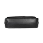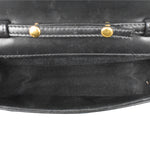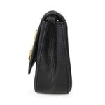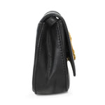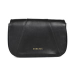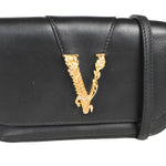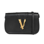 Versace 'Virtus' mini crossbody bag in black leather with an intricate gold 'V' charm on the front, a removable crossbody strap, a top flap opening with a snap closure, and a black canvas inner lining.