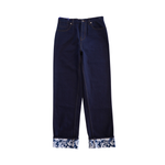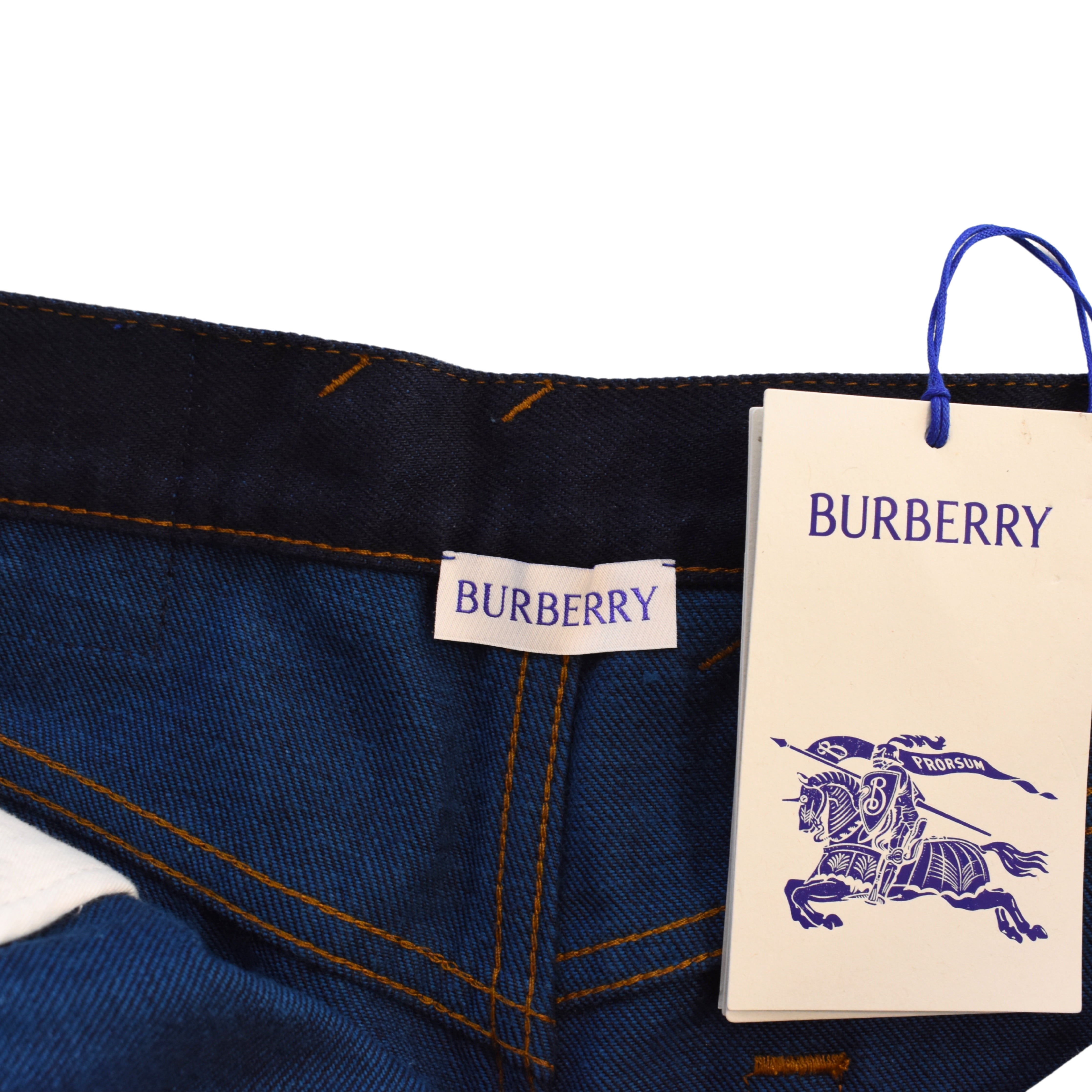 Burberry 'Rose Print' straight leg indigo jeans with white floral print cuffs, a royal blue suede logo patch on the back, and contrasting orange and blue stitching.