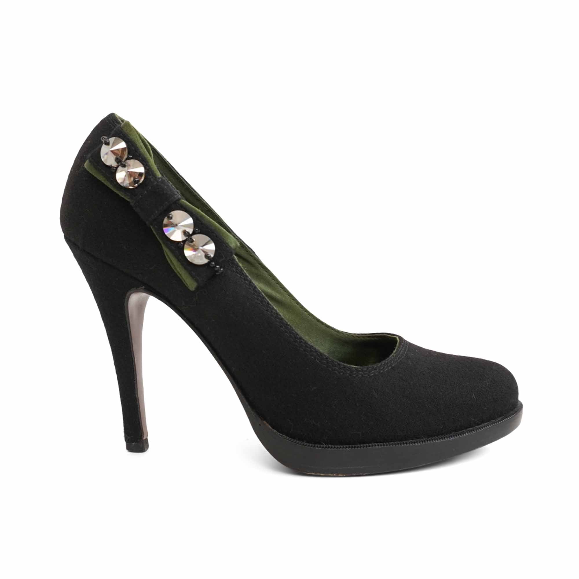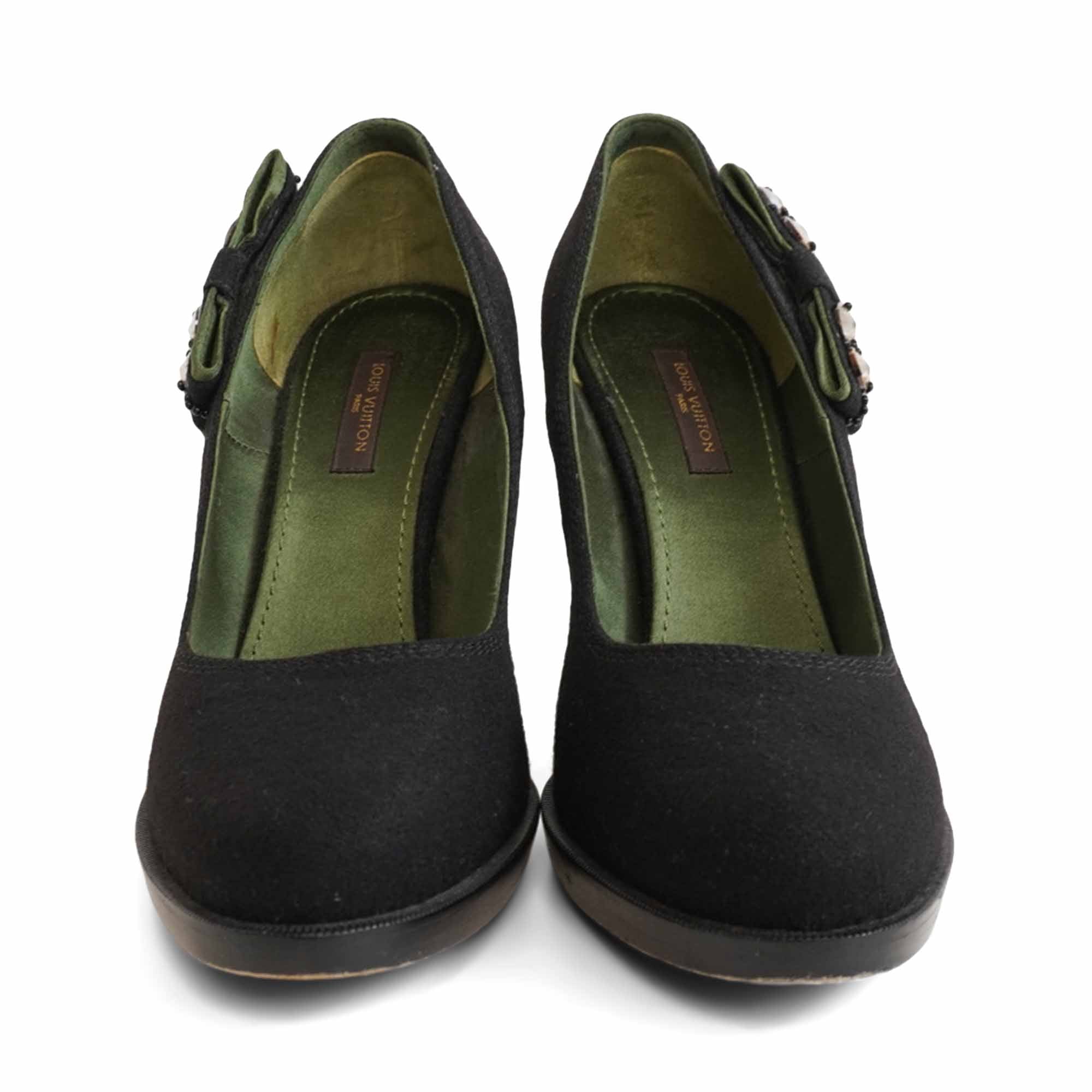 Louis Vuitton pumps in black wool with a crystal bow embellishment on the ankles with green trim, a stiletto heel, and an almond toe.