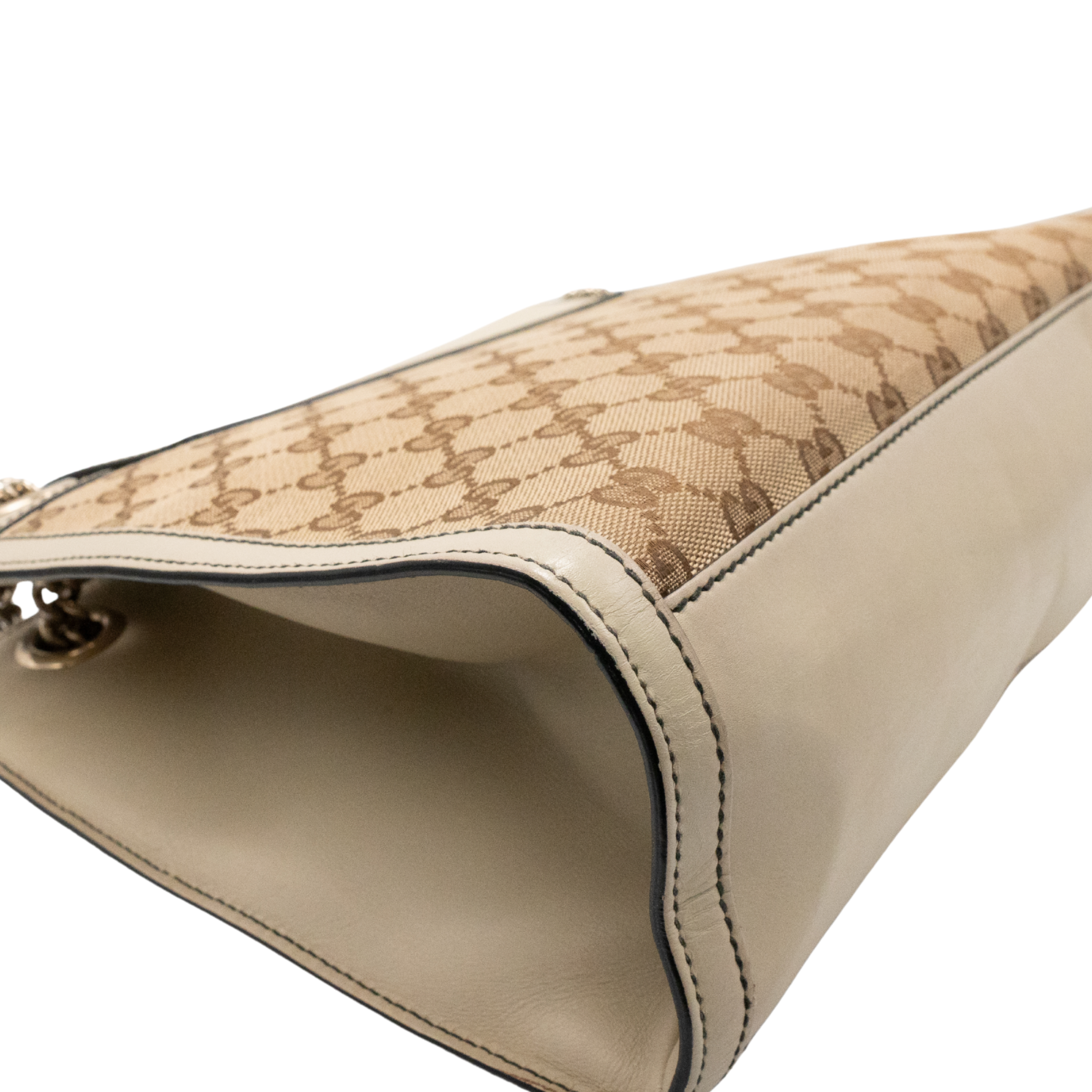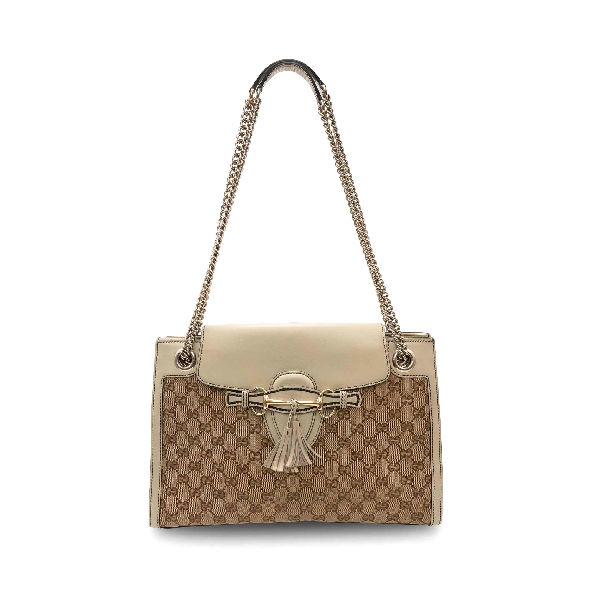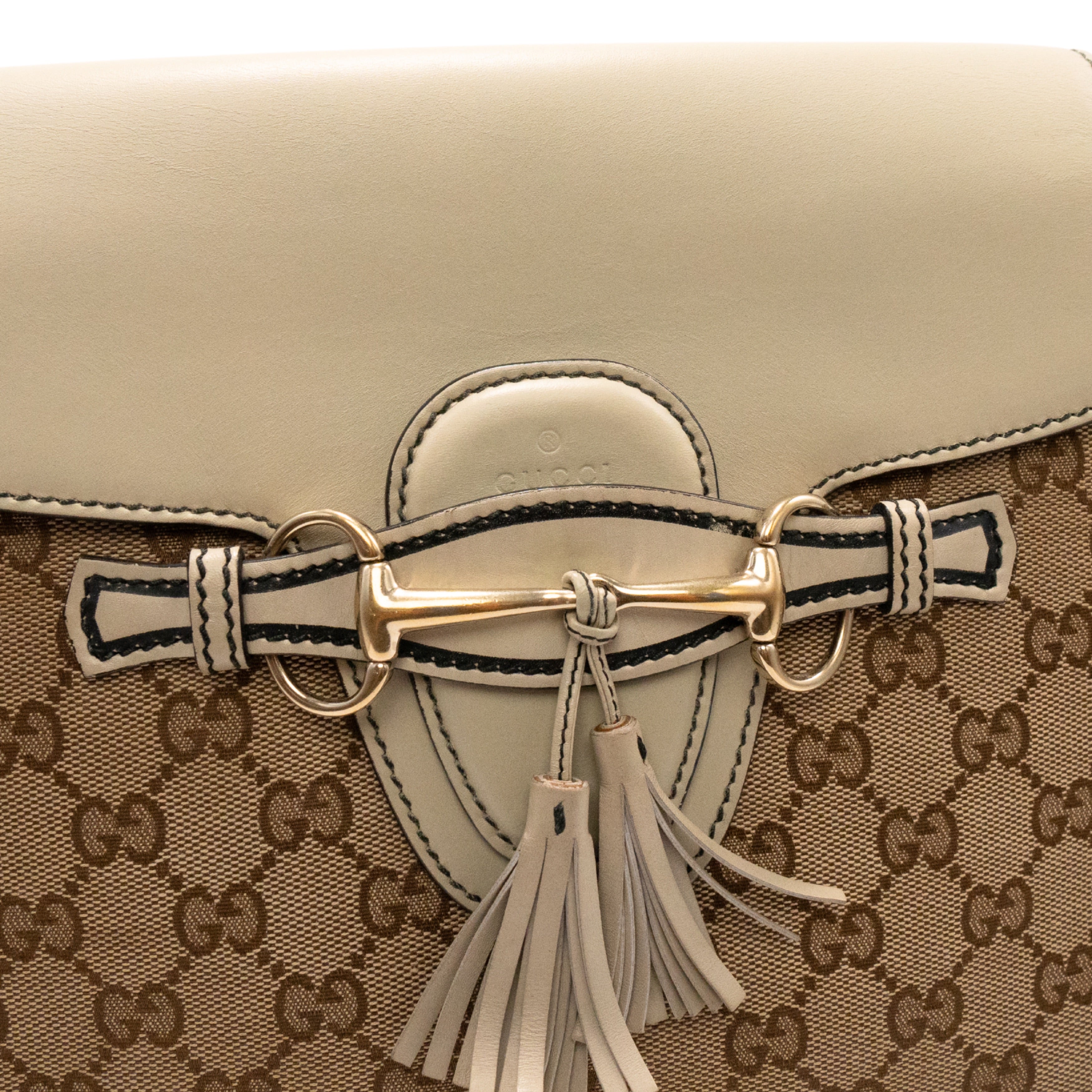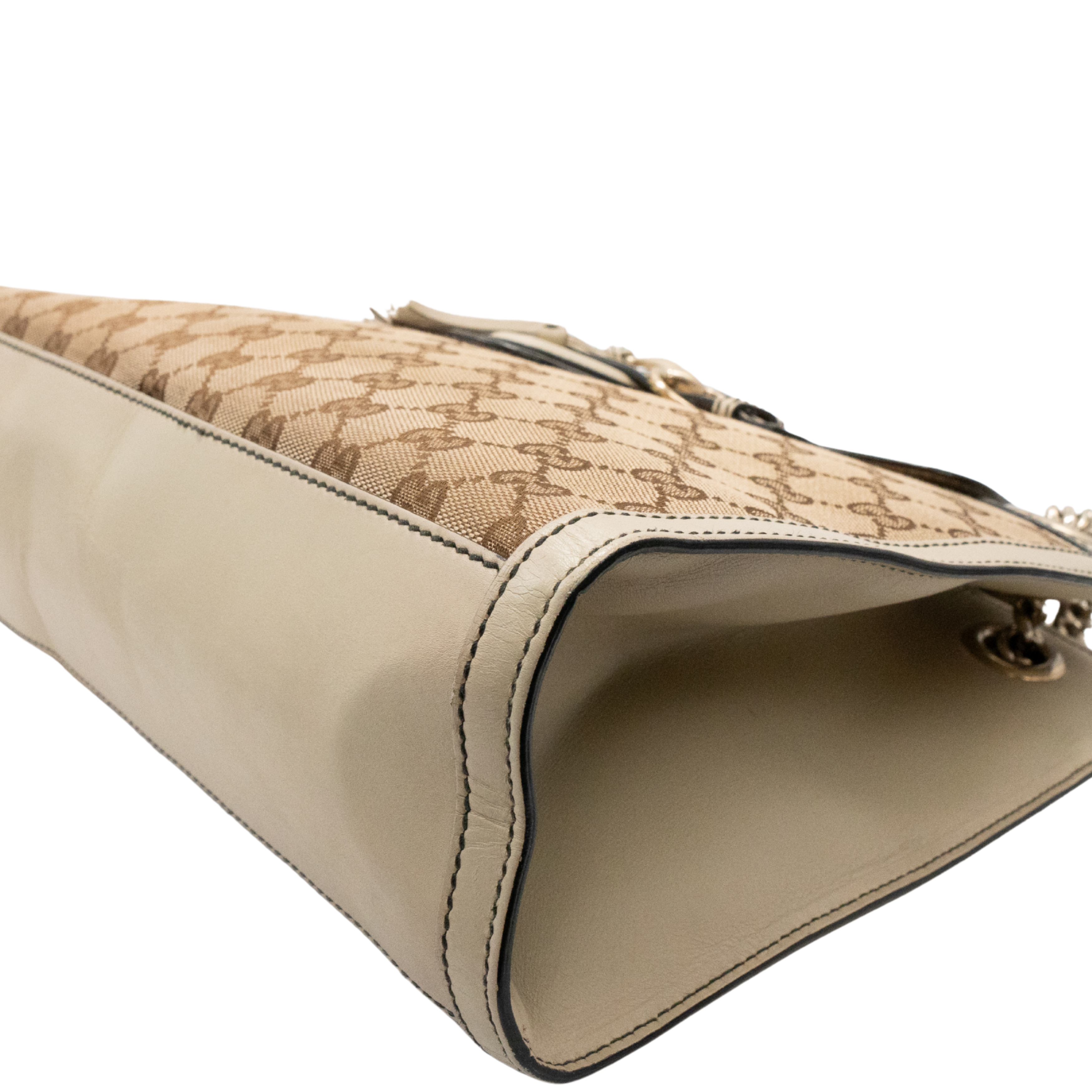 Gucci 'Large Emily' shoulder bag in beige monogram canvas with beige leather trim, signature gold horsebit hardware on the front, and leather tassel details. Features a silver chain strap with beige leather shoulder pads, a leather top flap, and a canvas interior with one zip and two slip pockets.