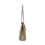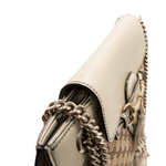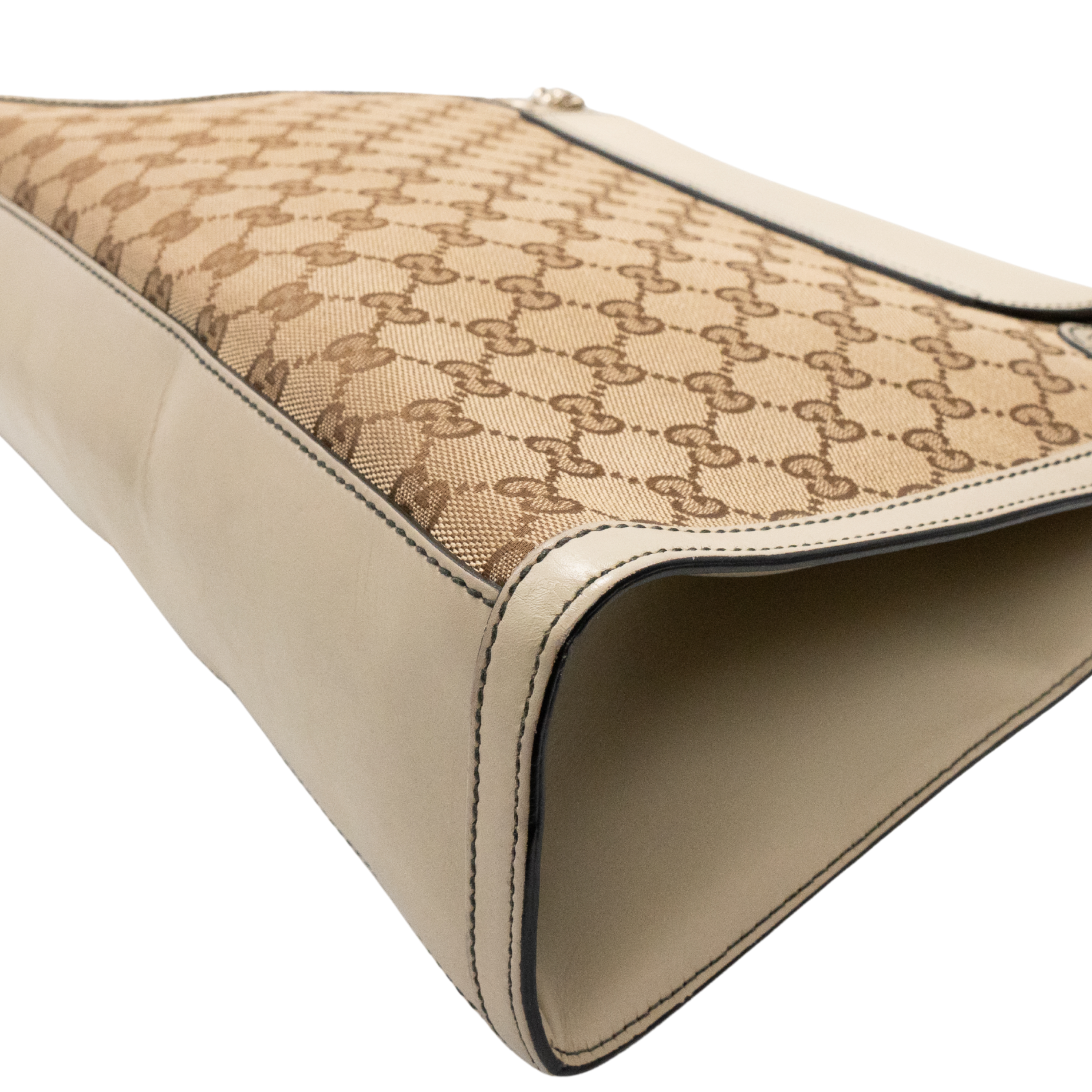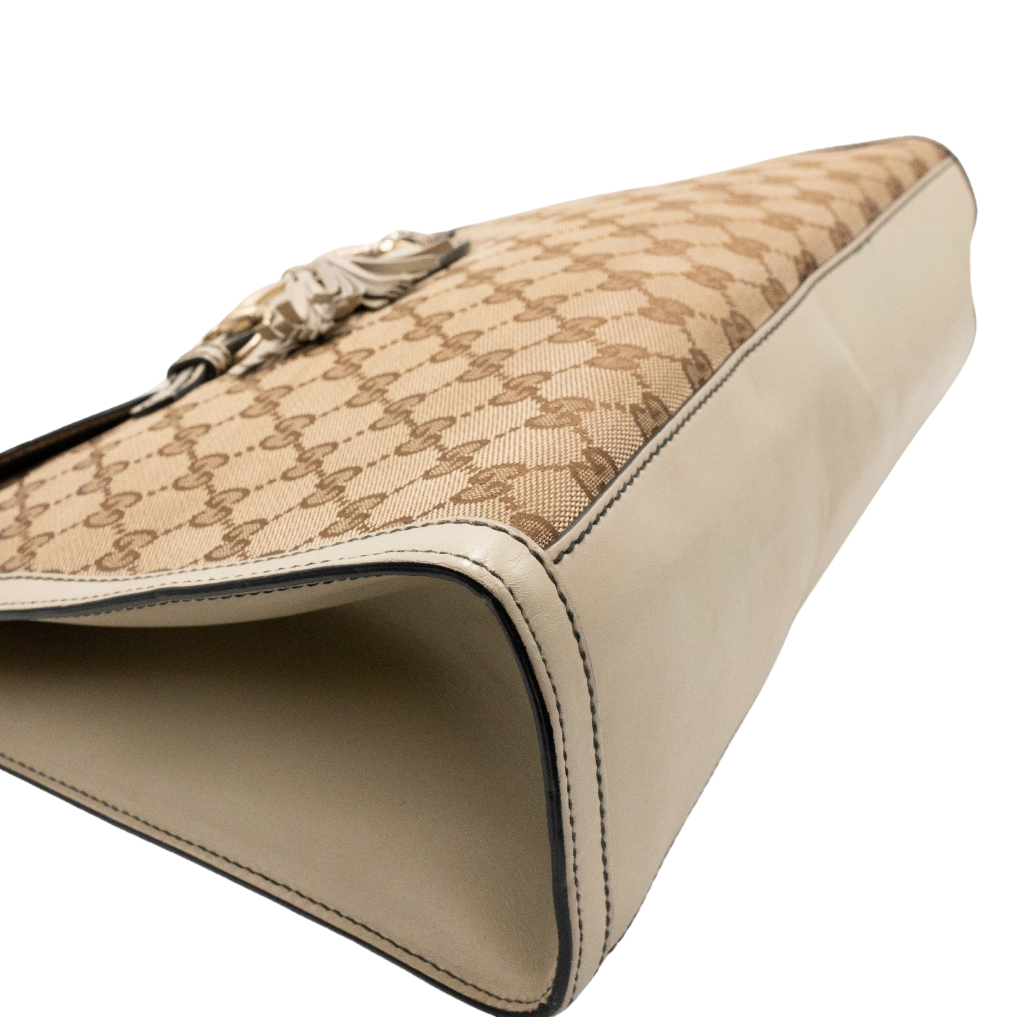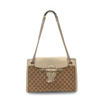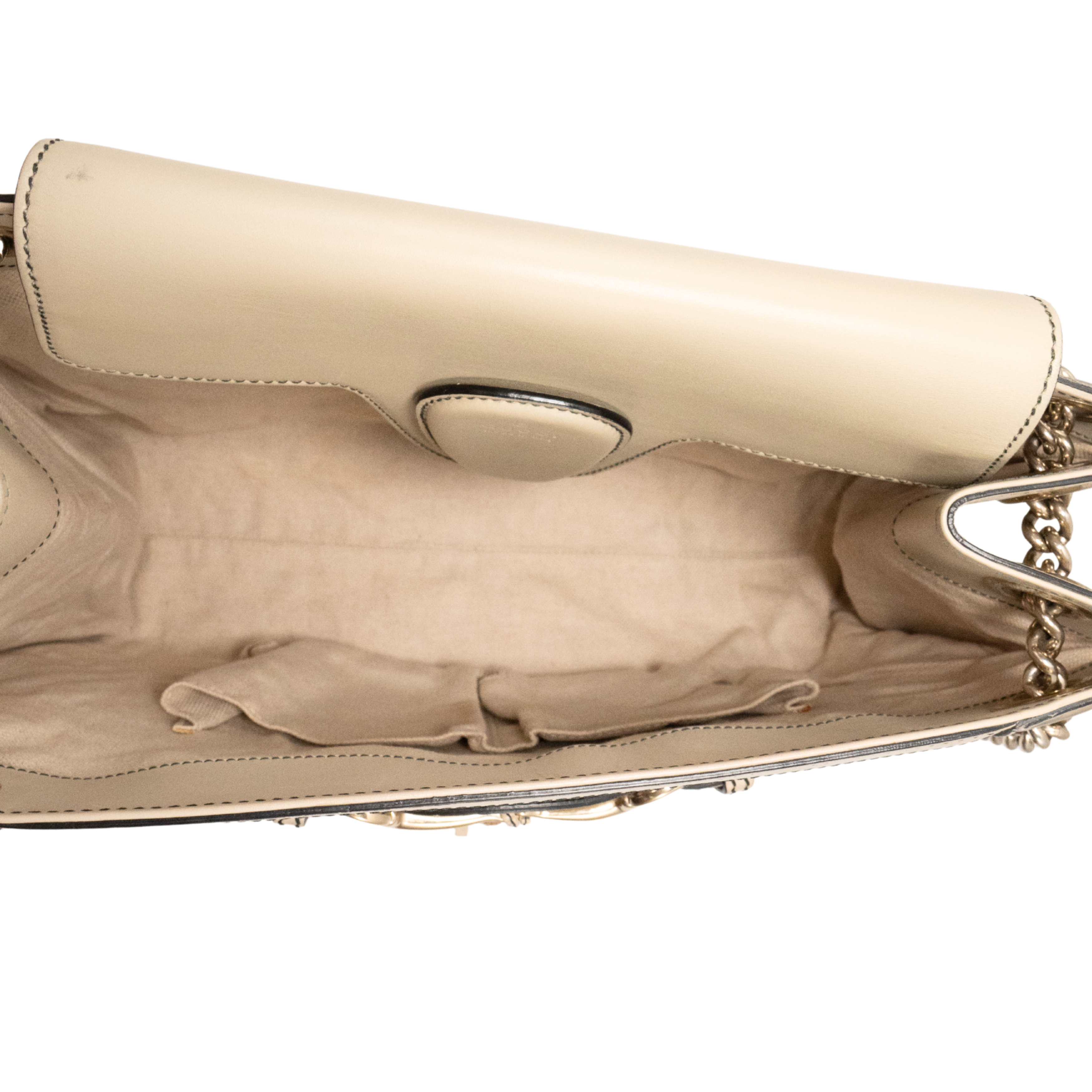 Gucci 'Large Emily' shoulder bag in beige monogram canvas with beige leather trim, signature gold horsebit hardware on the front, and leather tassel details. Features a silver chain strap with beige leather shoulder pads, a leather top flap, and a canvas interior with one zip and two slip pockets.