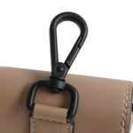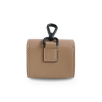Alexander McQueen airpods case in tan leatherf with black clip hardware and a grafitti logo on the front.