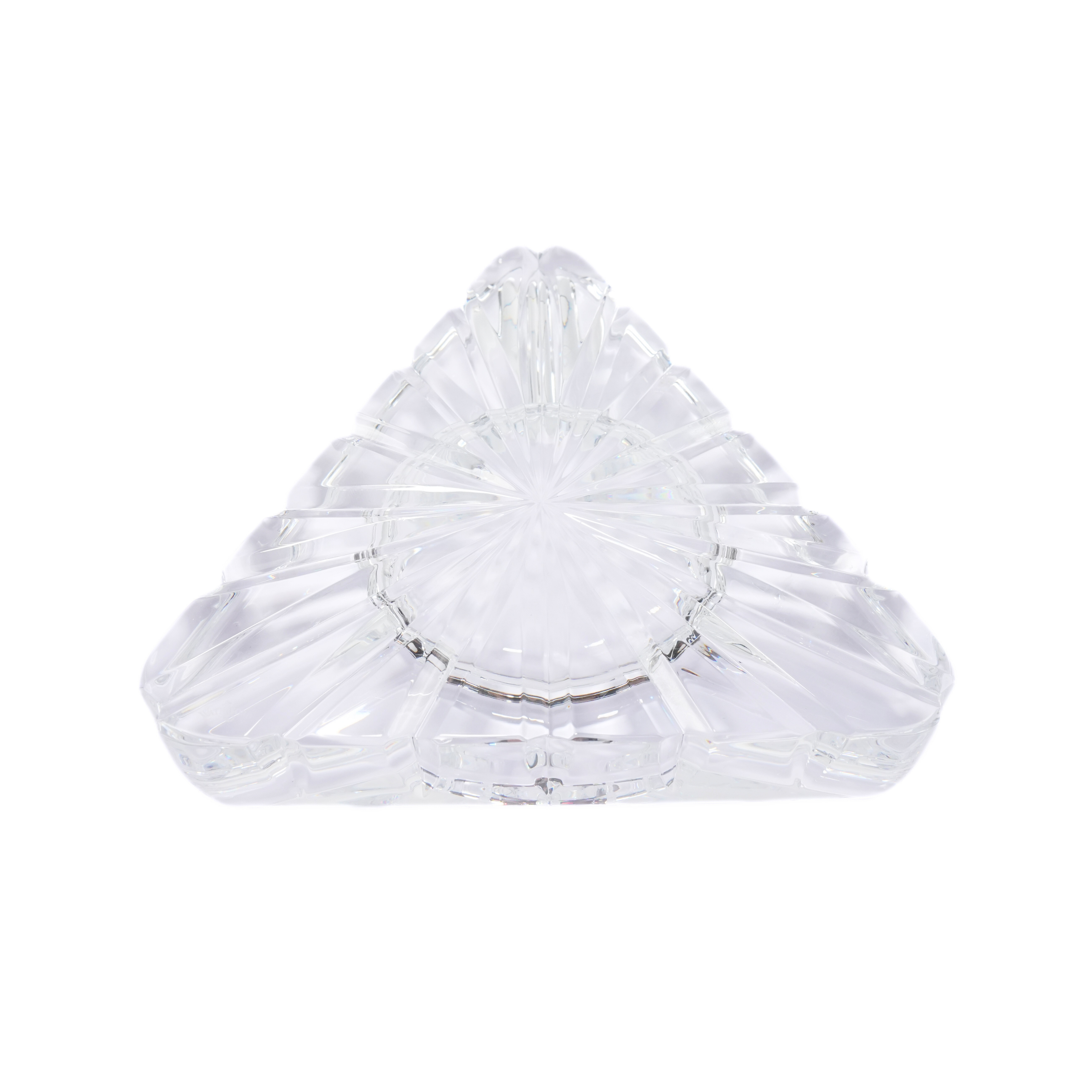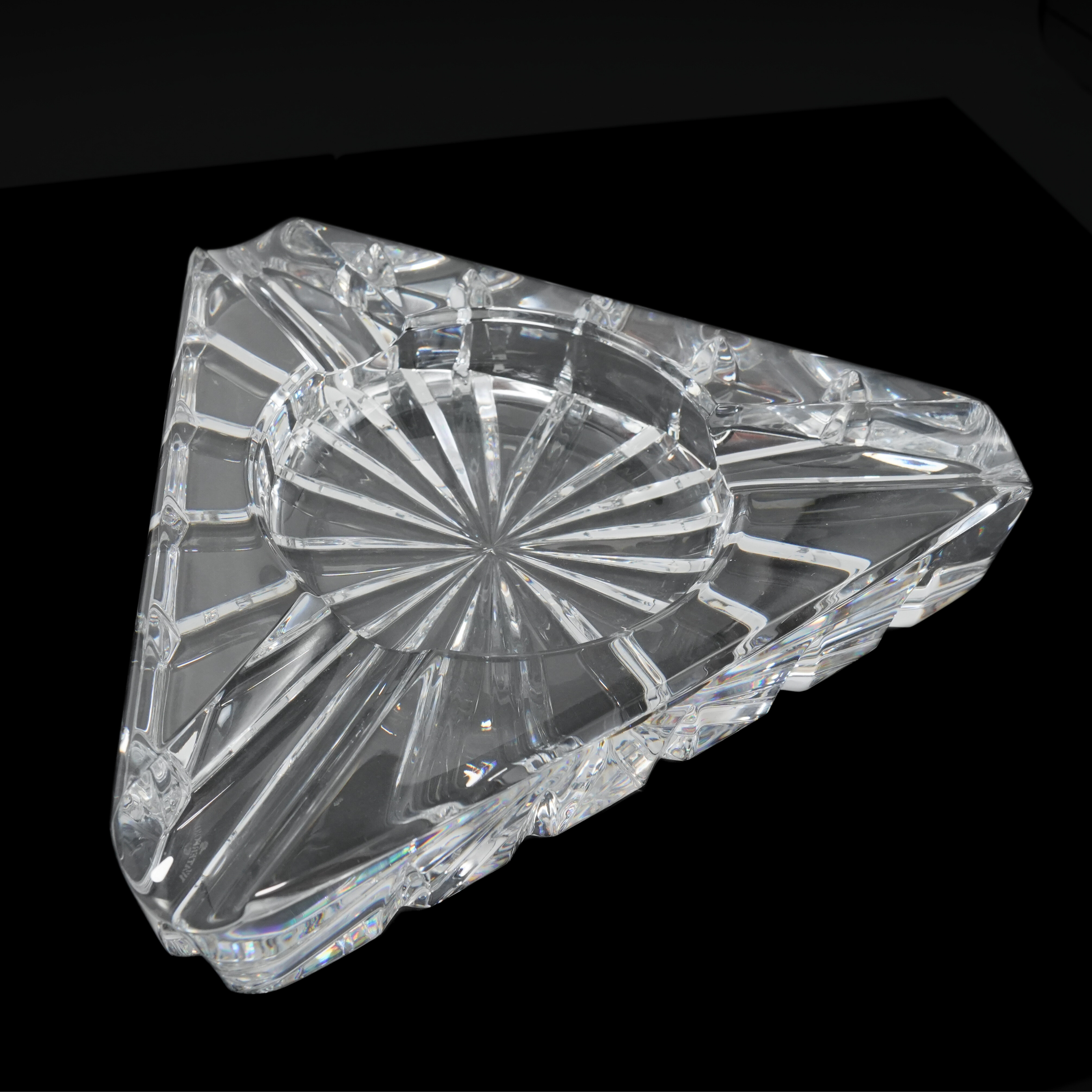 Waterford triangular crystal ashtray with three divets on the sides and a circular cutout at the centre.