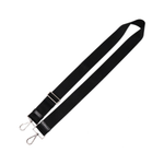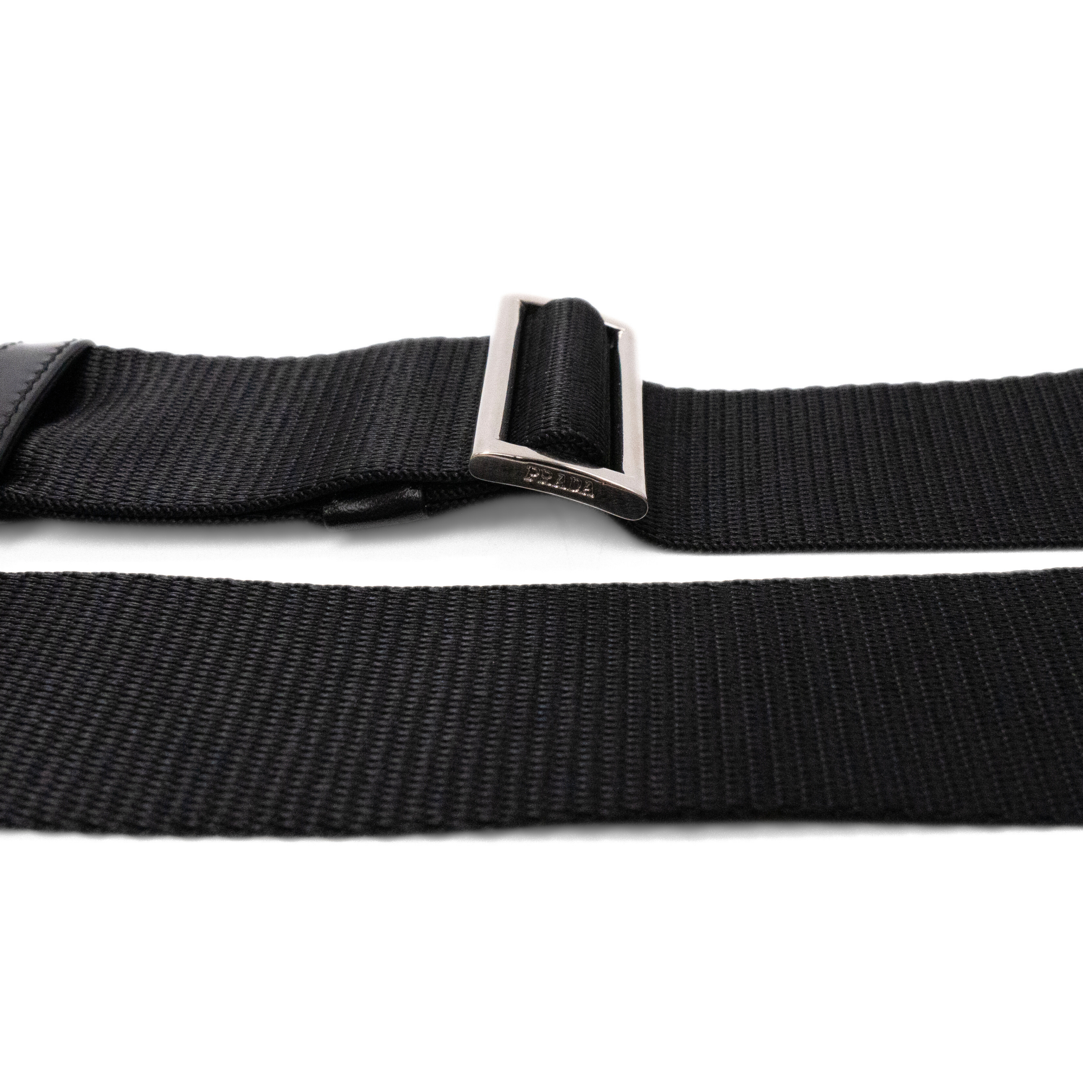 Prada adjustable bag strap in black canvas with smooth leather trim and silver clasp hardware.