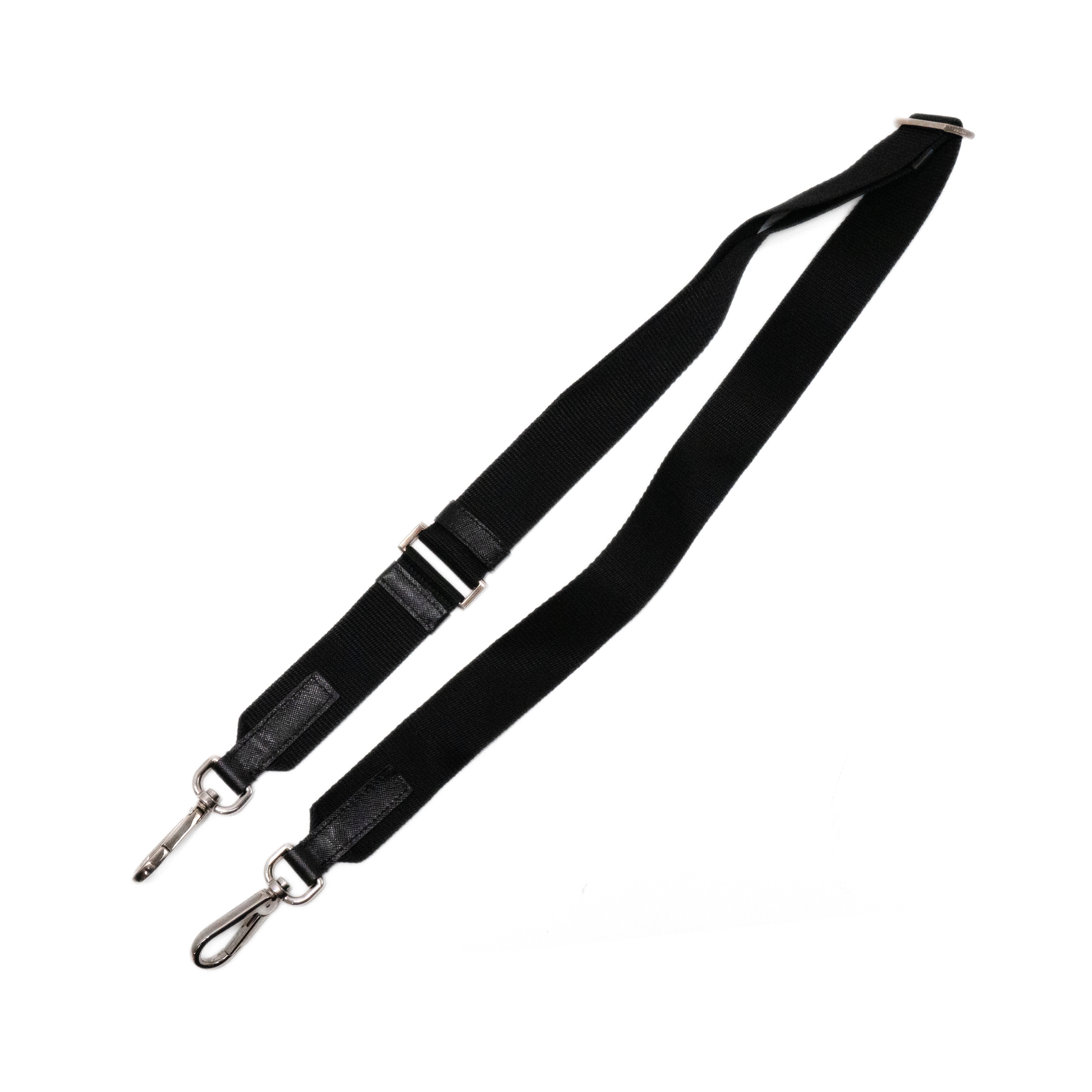 Prada adjustable bag strap in black canvas with saffiano leather trim and silver clasp hardware.