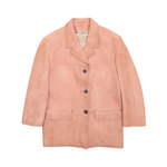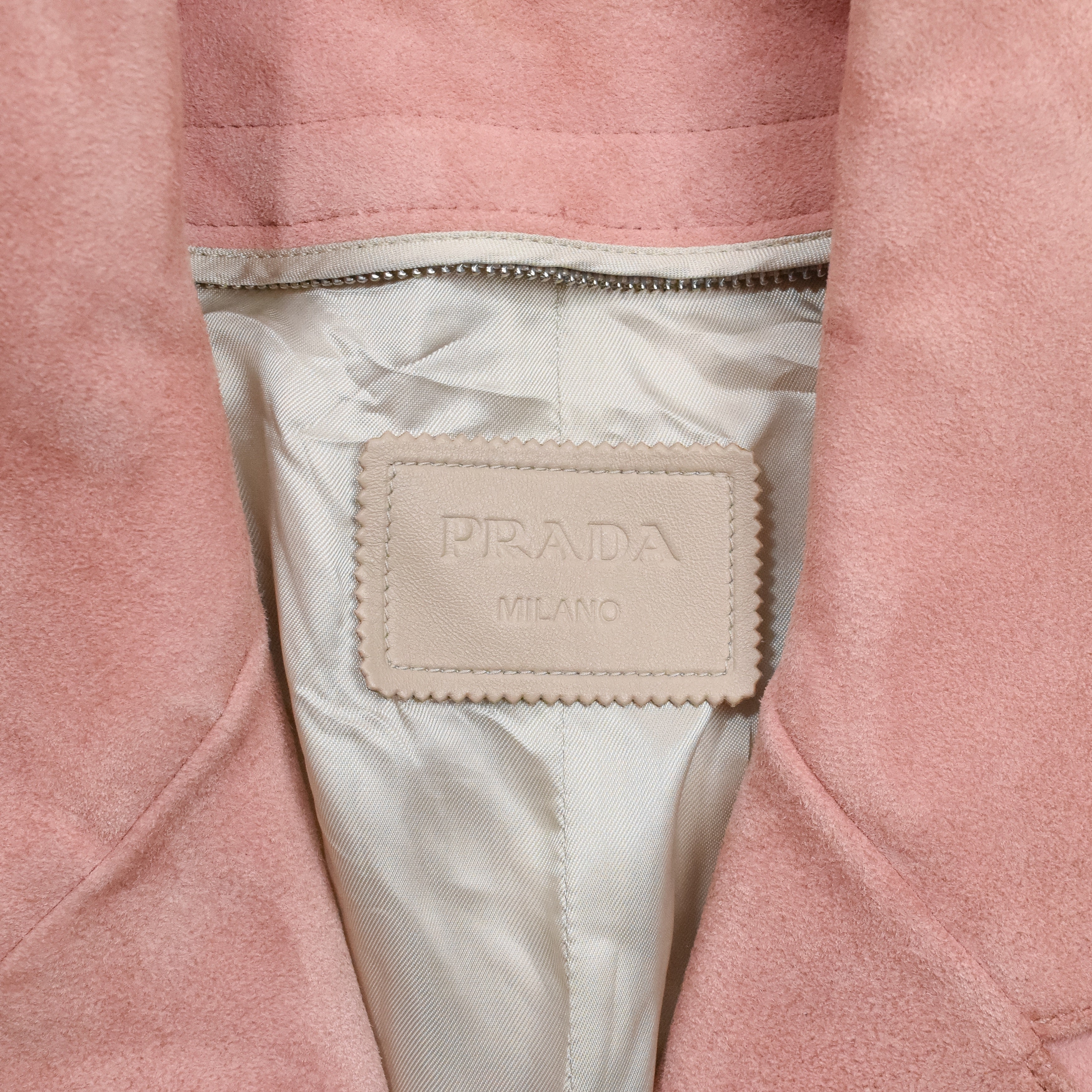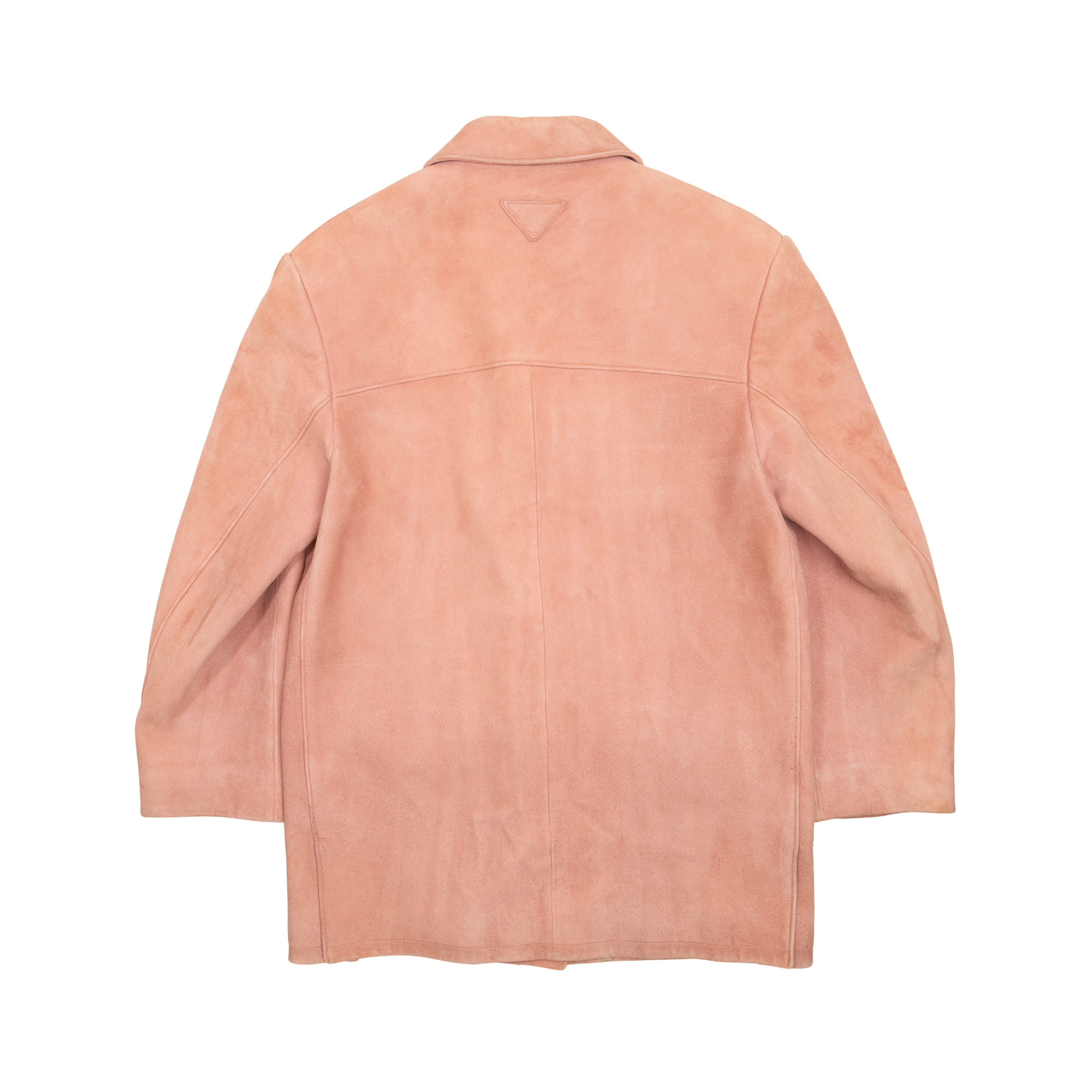 Prada oversized jacket in dusty pink suede with tortoise buttons, front flap pockets, and a notch collar.