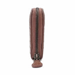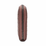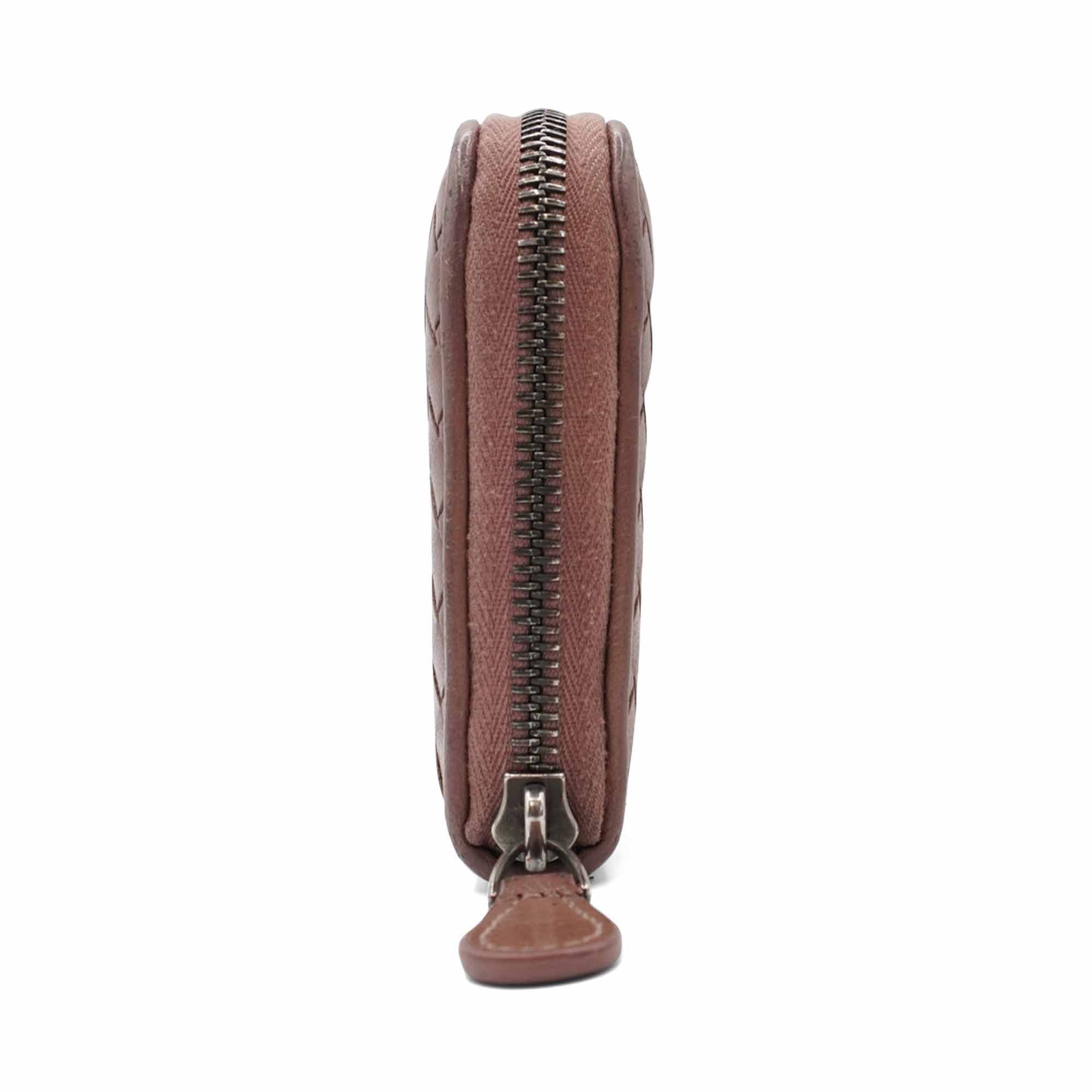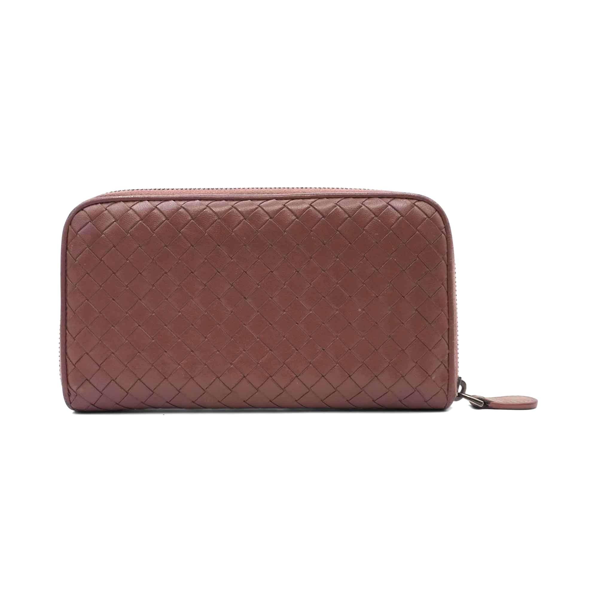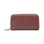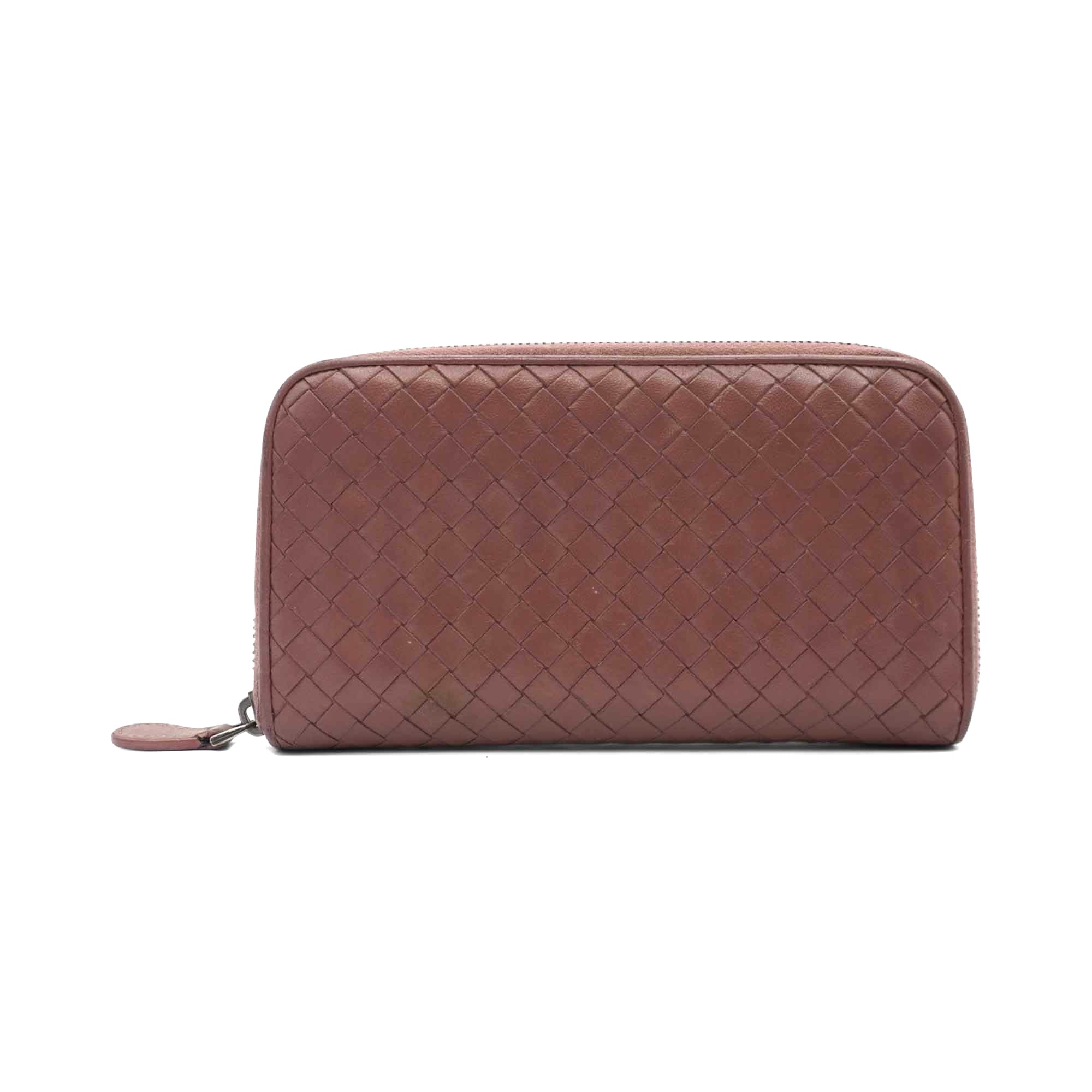 Bottega Veneta continental wallet in mauve intrecciato woven leather. Features a zip-around closure in gunmetal hardware, multiple card slots, a cash pocket and a change zip pocket.