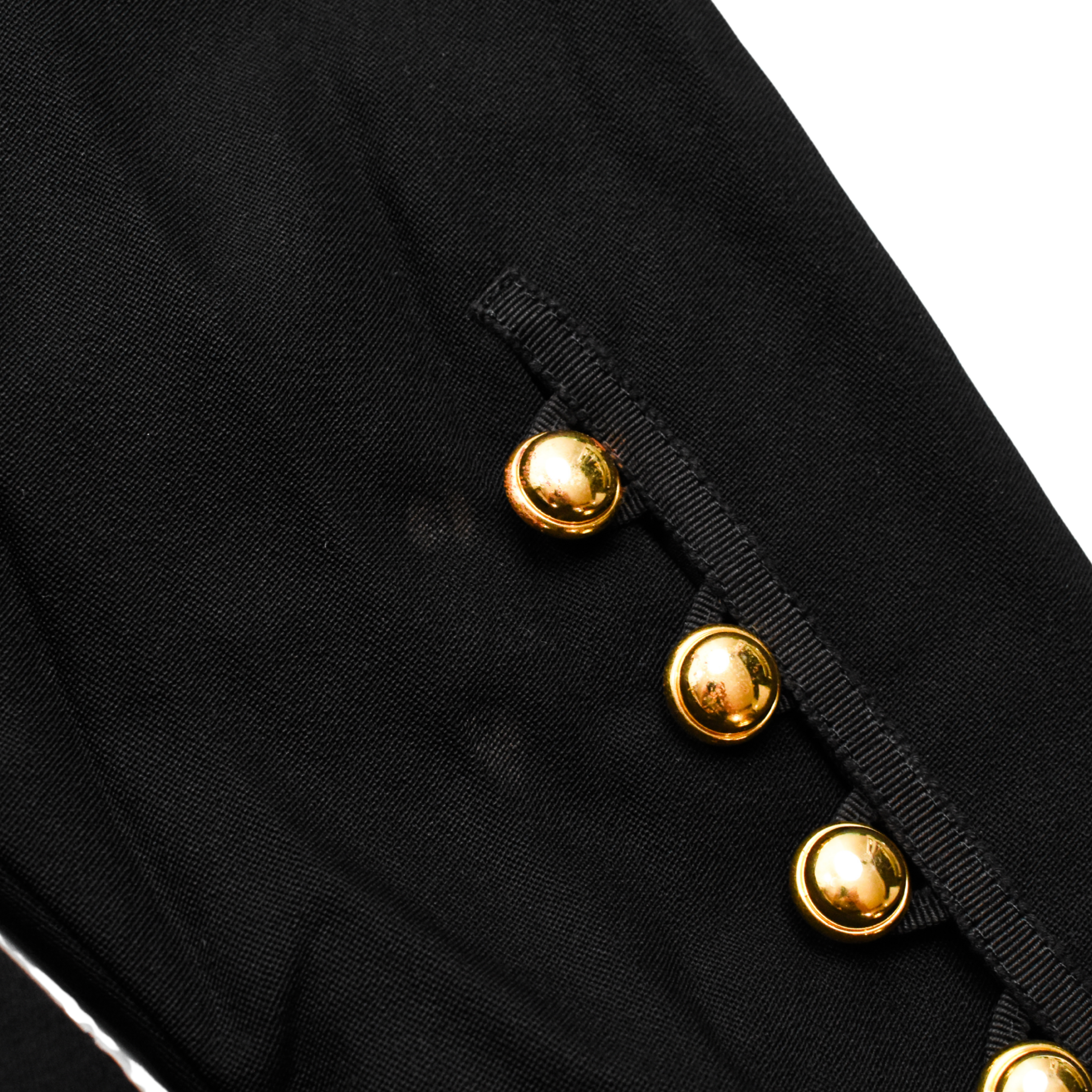 Chanel Boutique vintage blazer jacket in a black with canvas stripe details. Features an asymmetrical closure down front with gold buttons and loops, buttons on sleeve cuffs, four patch pockets on front with canvas stripes, and a spread collar also with canvas stripes.