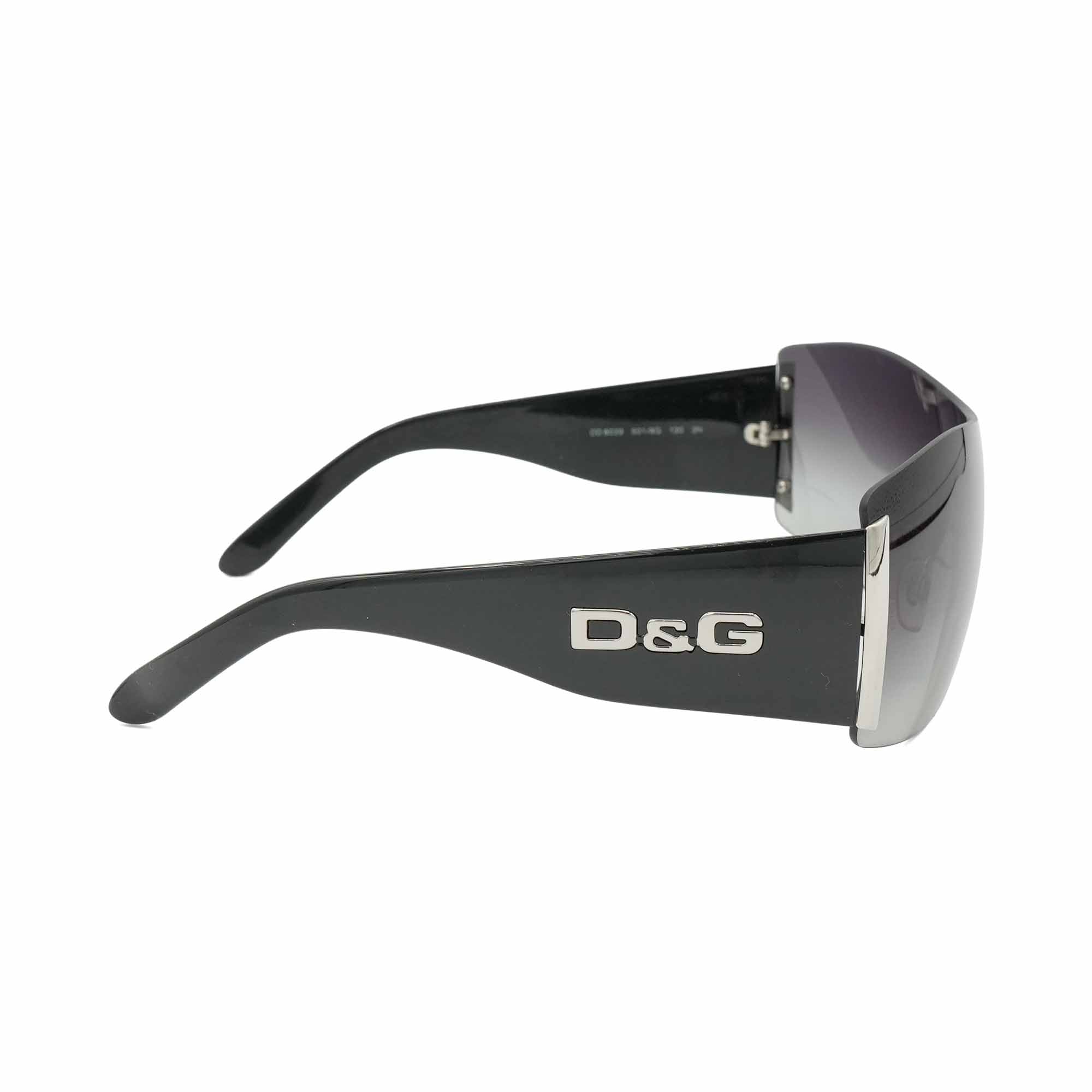 Dolce & Gabbana frameless shield sunglasses with black ombre lenses and black acetate arms with 'D&G' logo in silver.