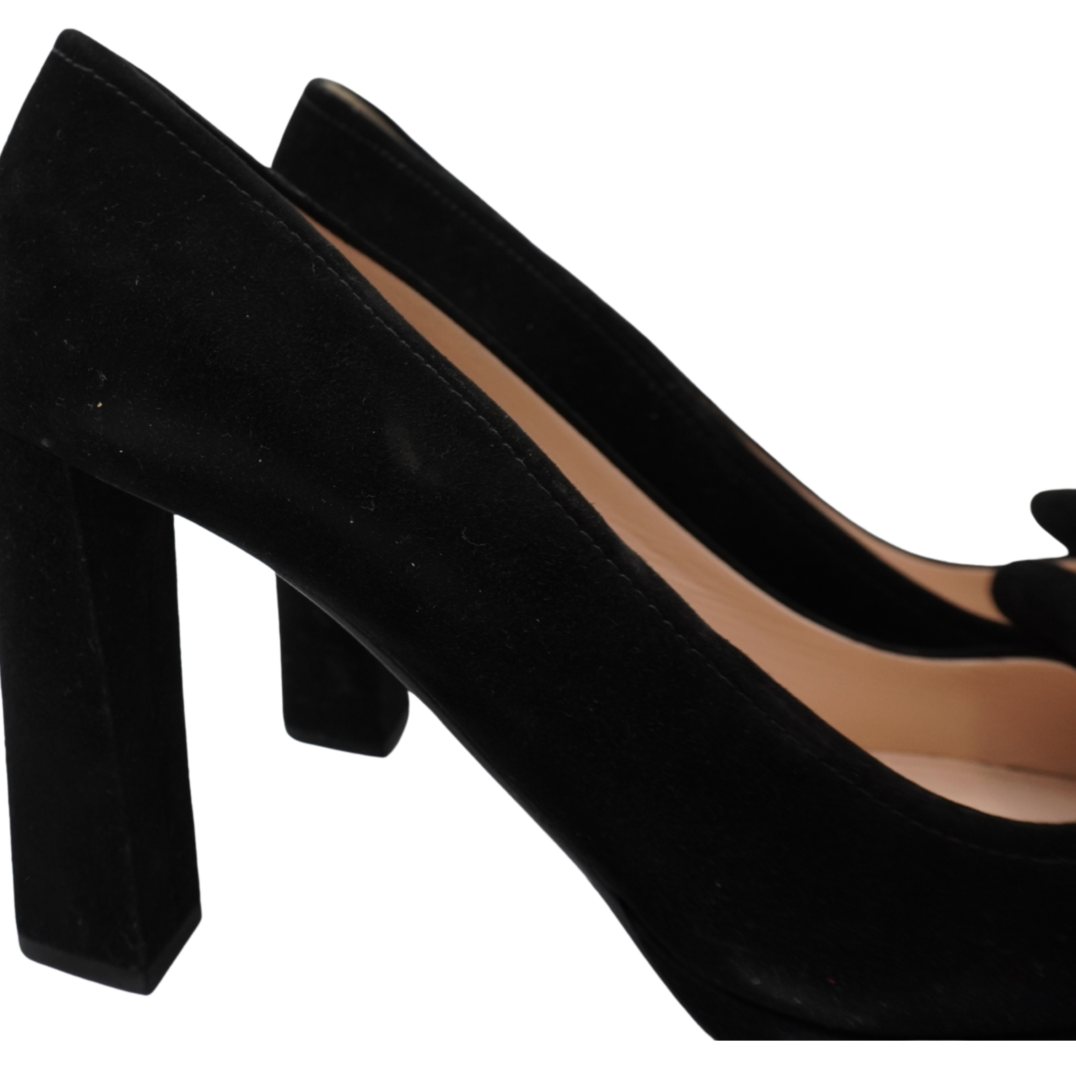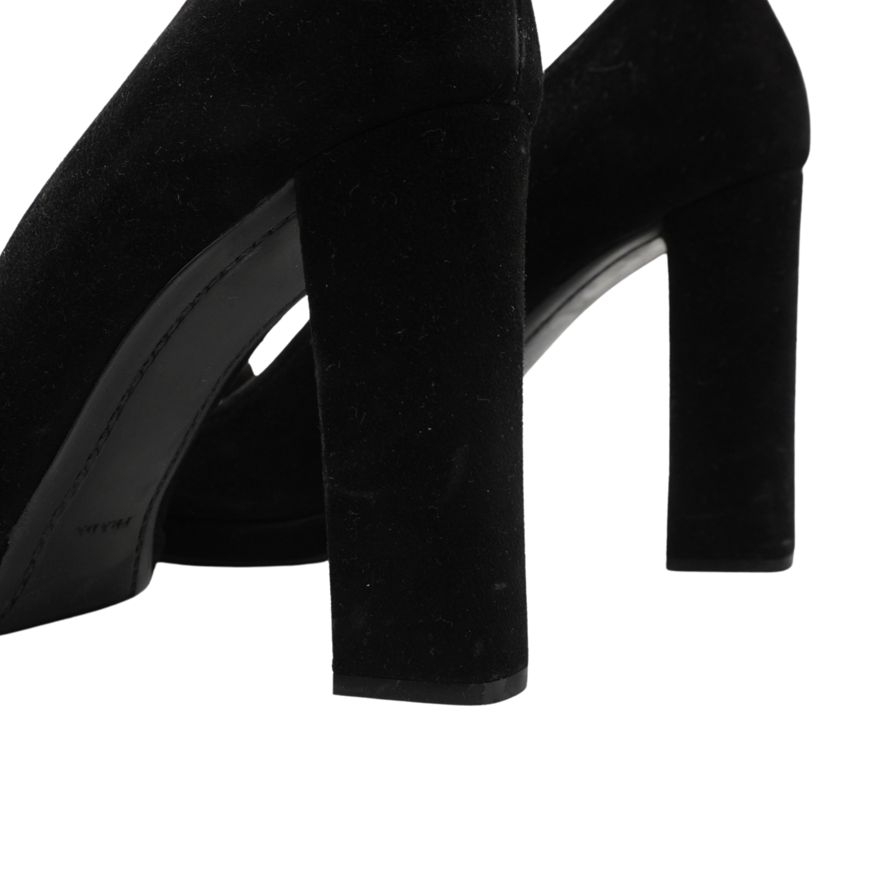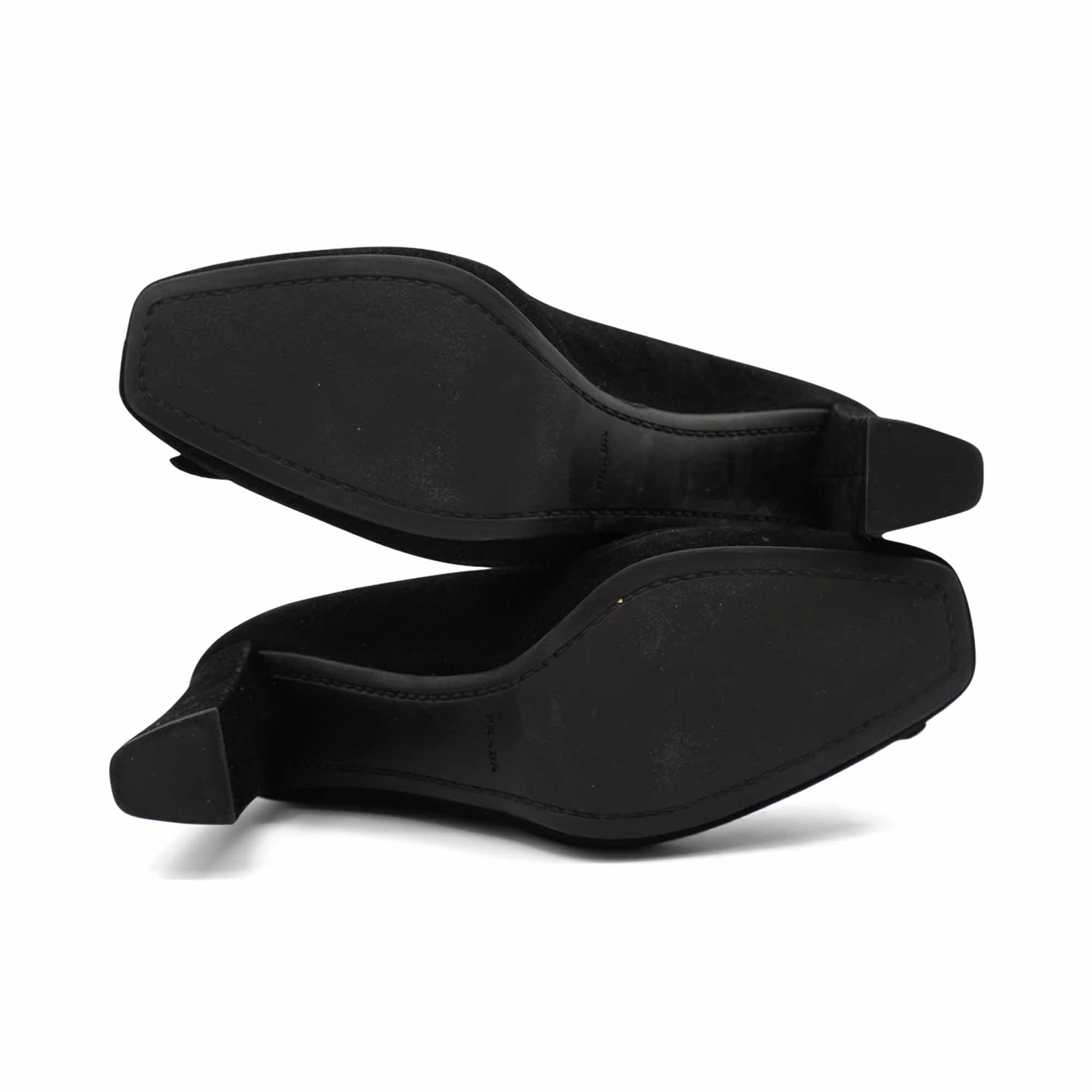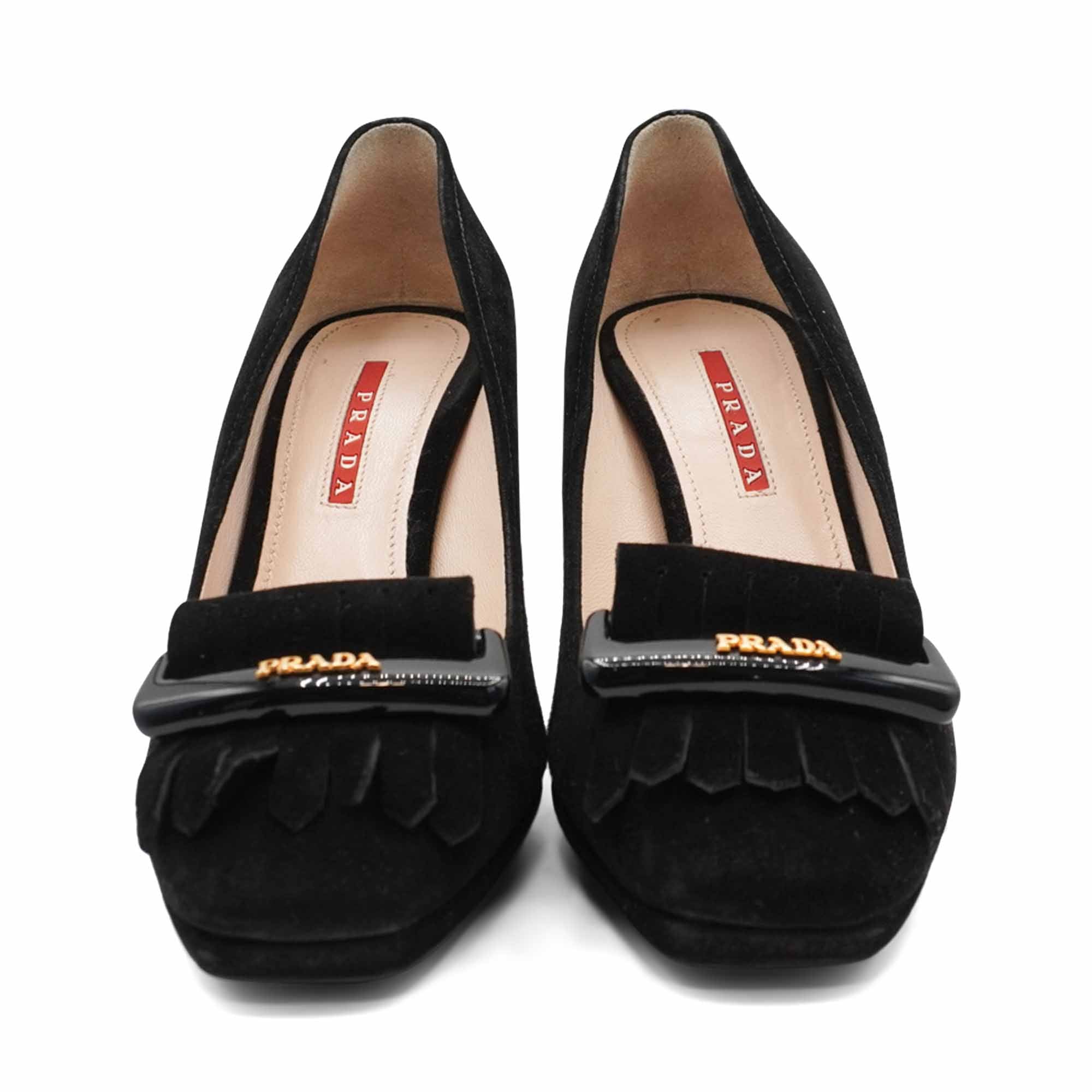 Prada heels in black suede with a tassel detail on the front, a black acetate buckle with gold logo hardware, and a block heel.