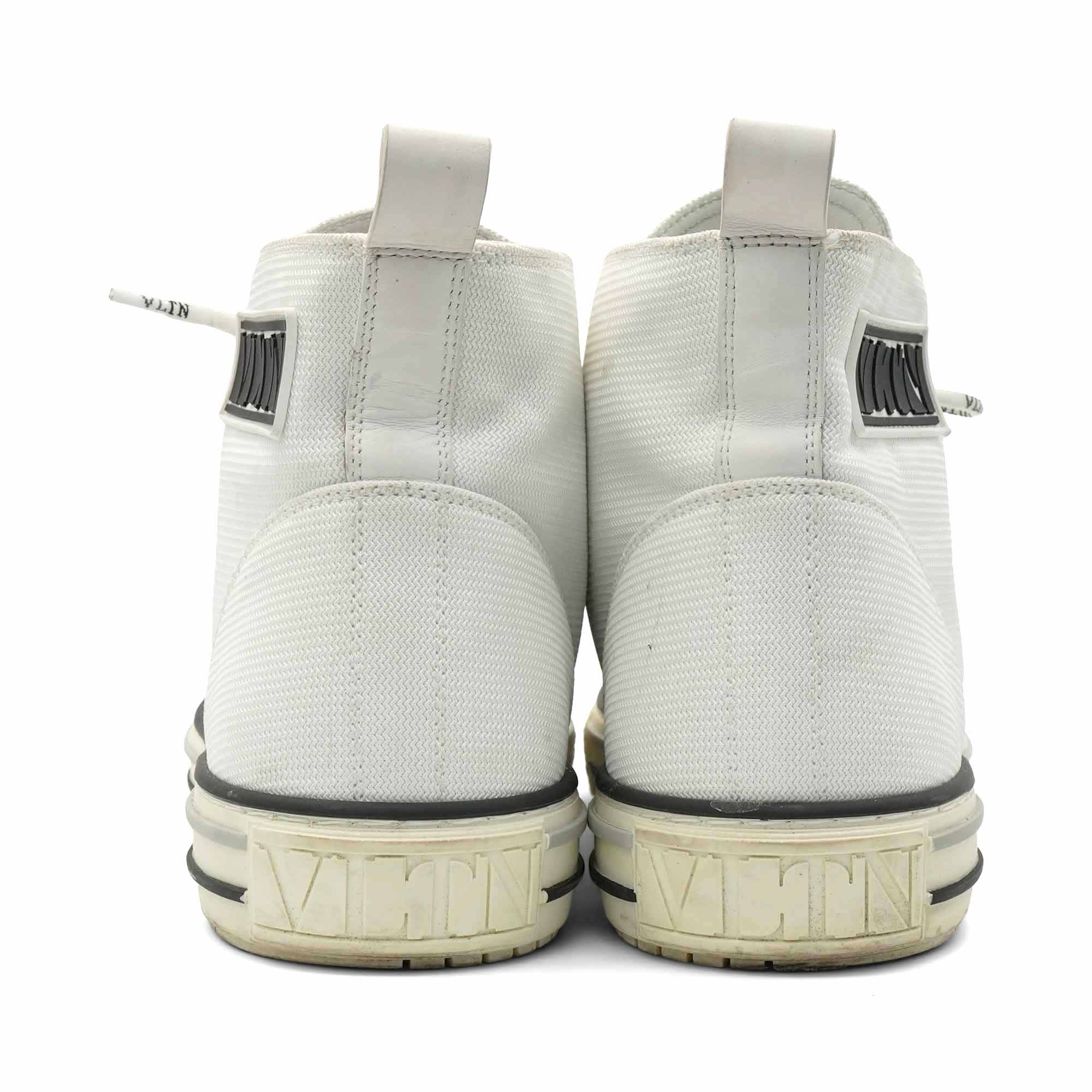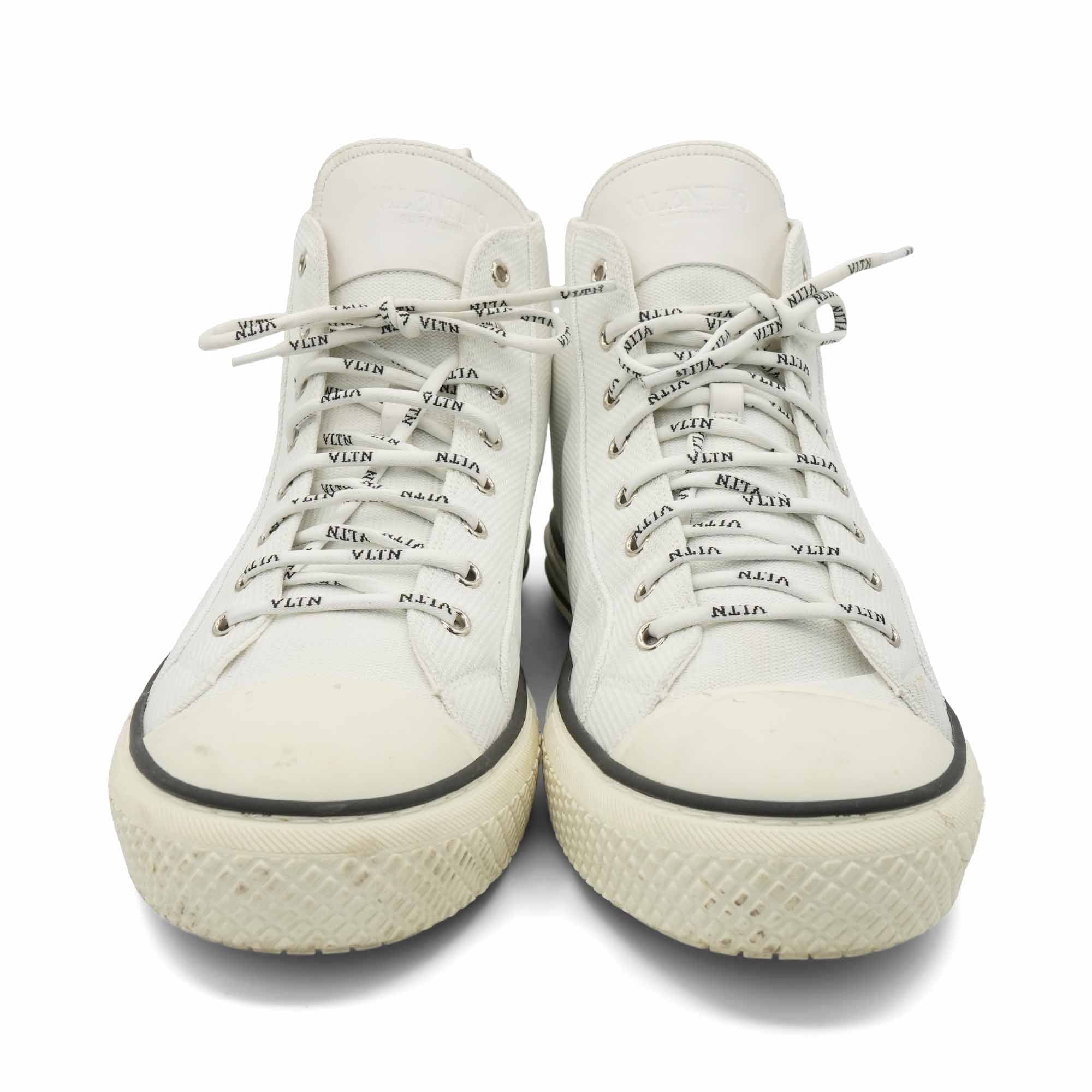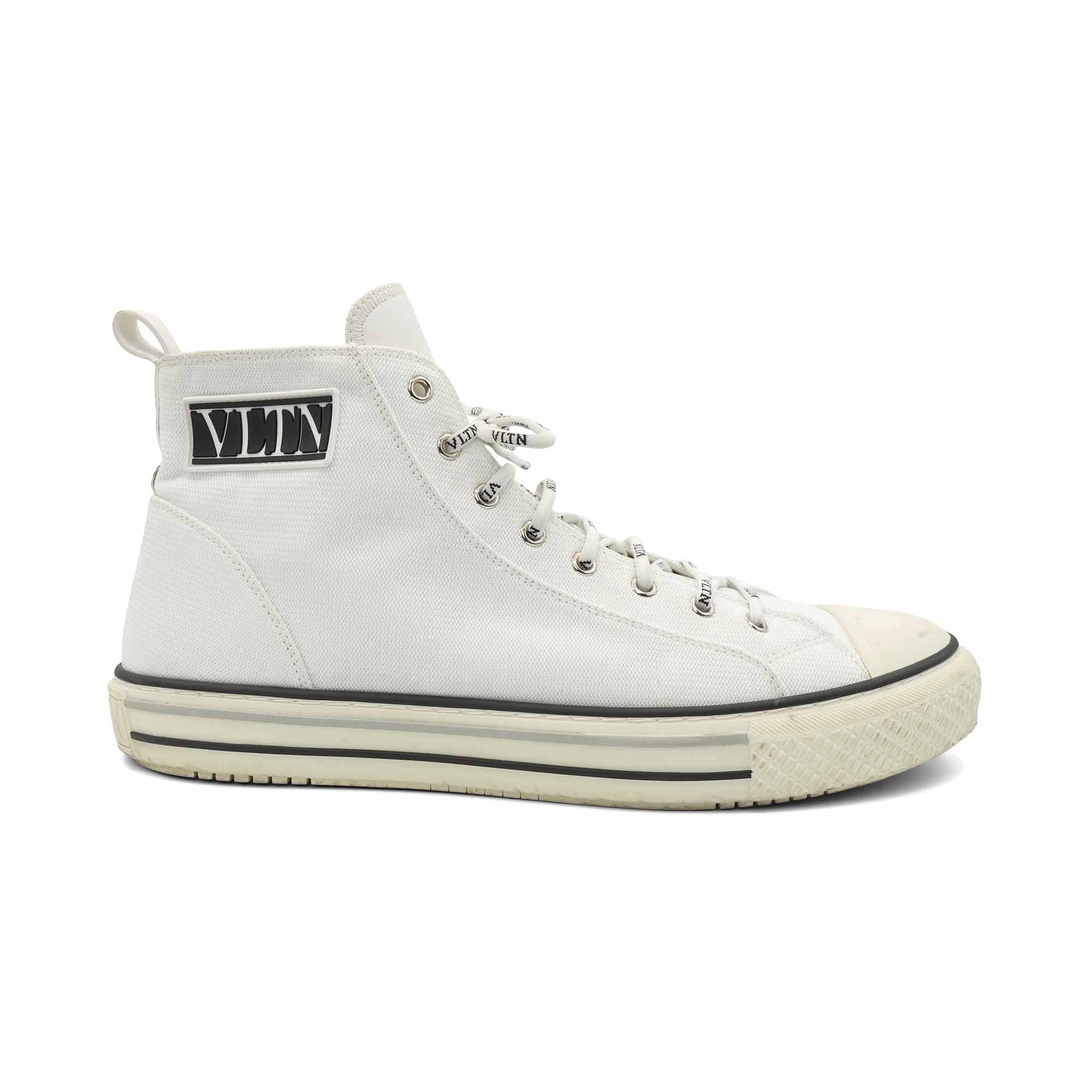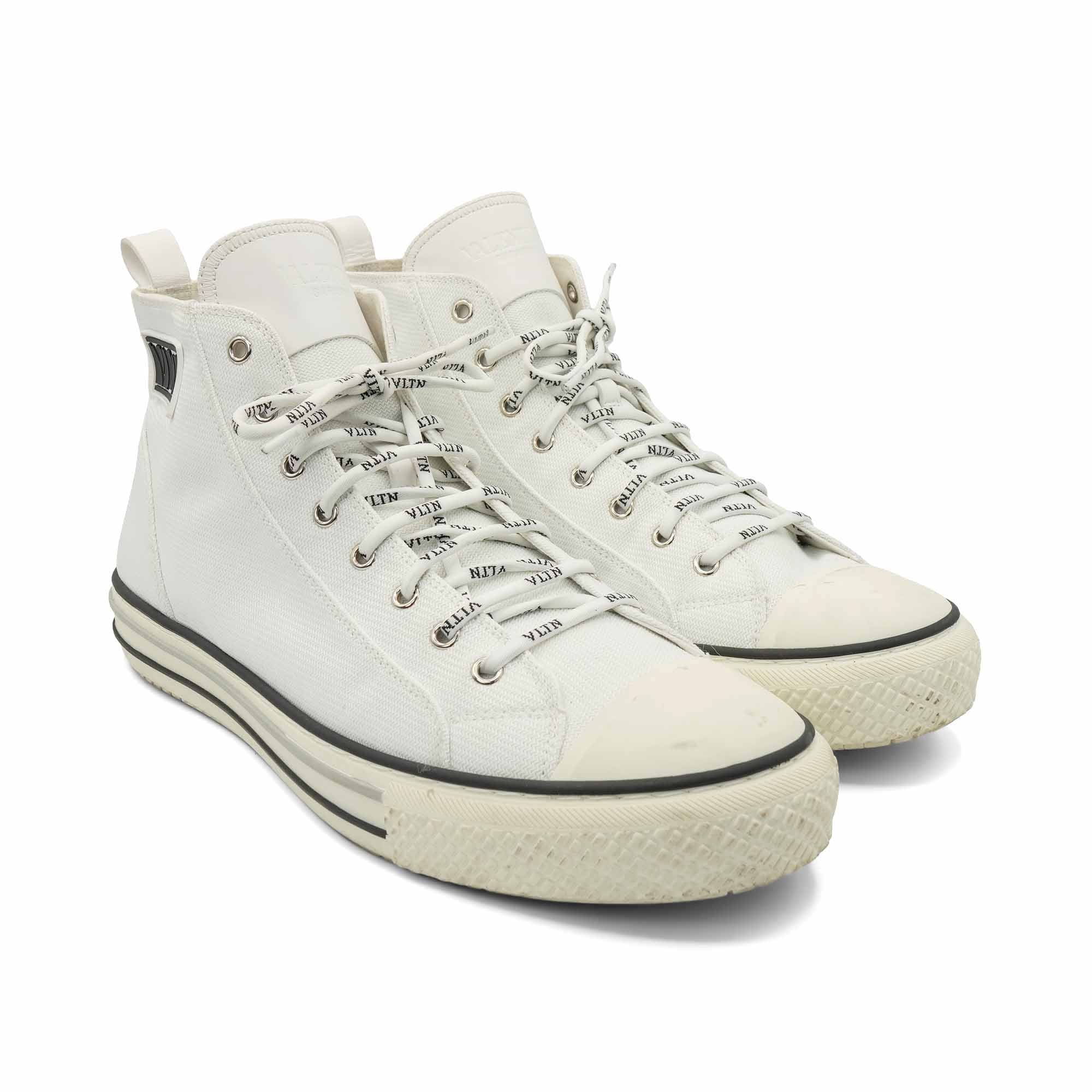 Valentino 'VLTN' logo high-top sneakers in white canvas with black rubber logo on the side, monogram round laces and rubber sole.