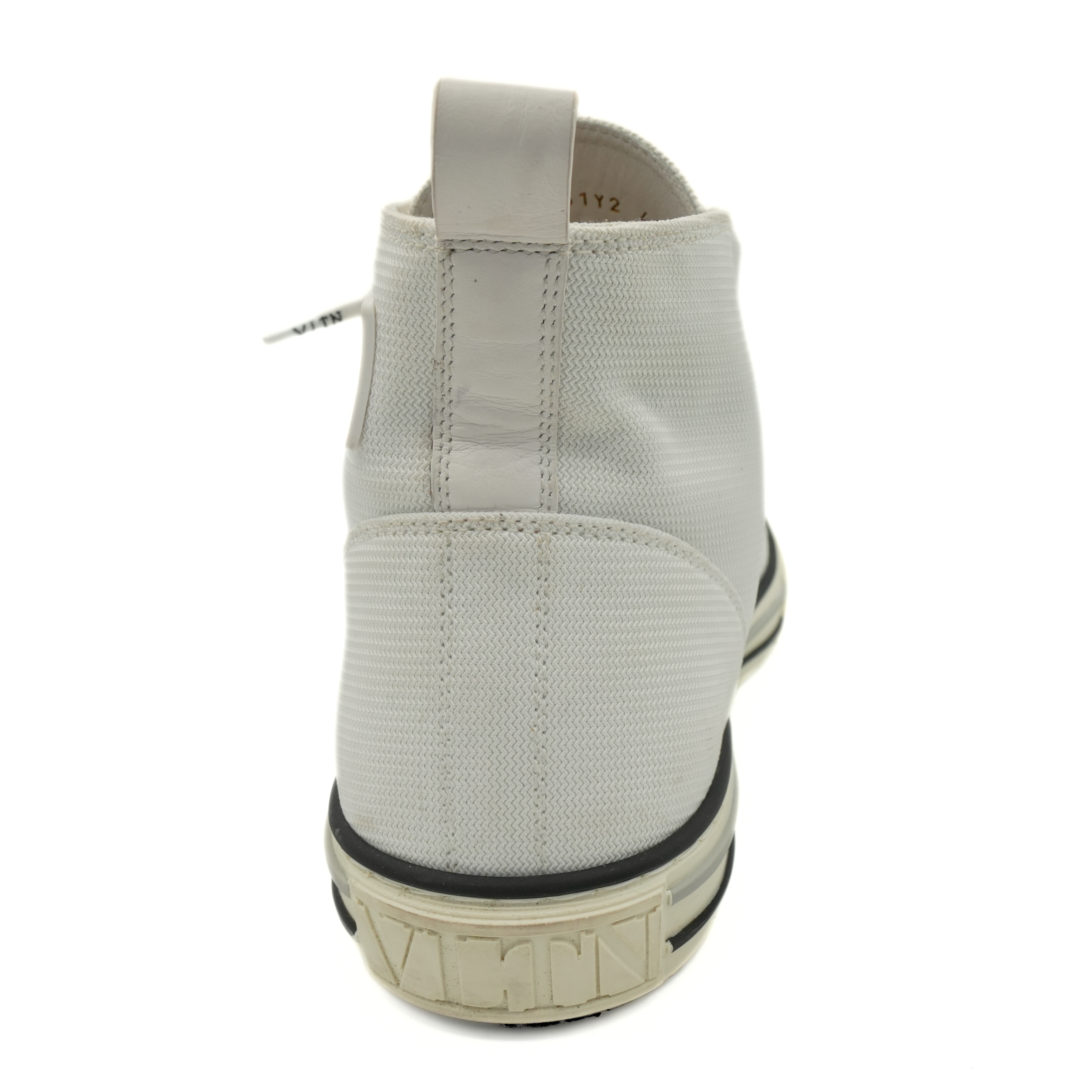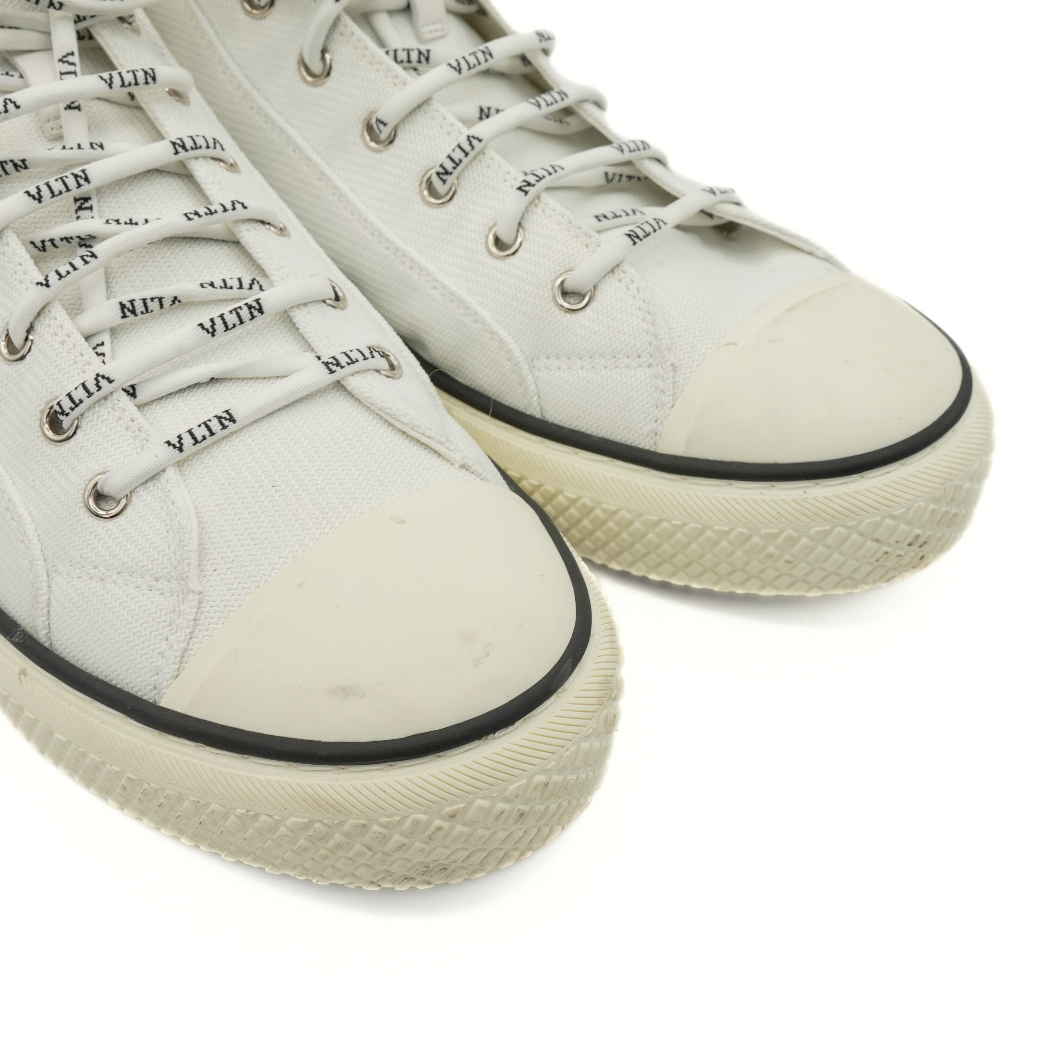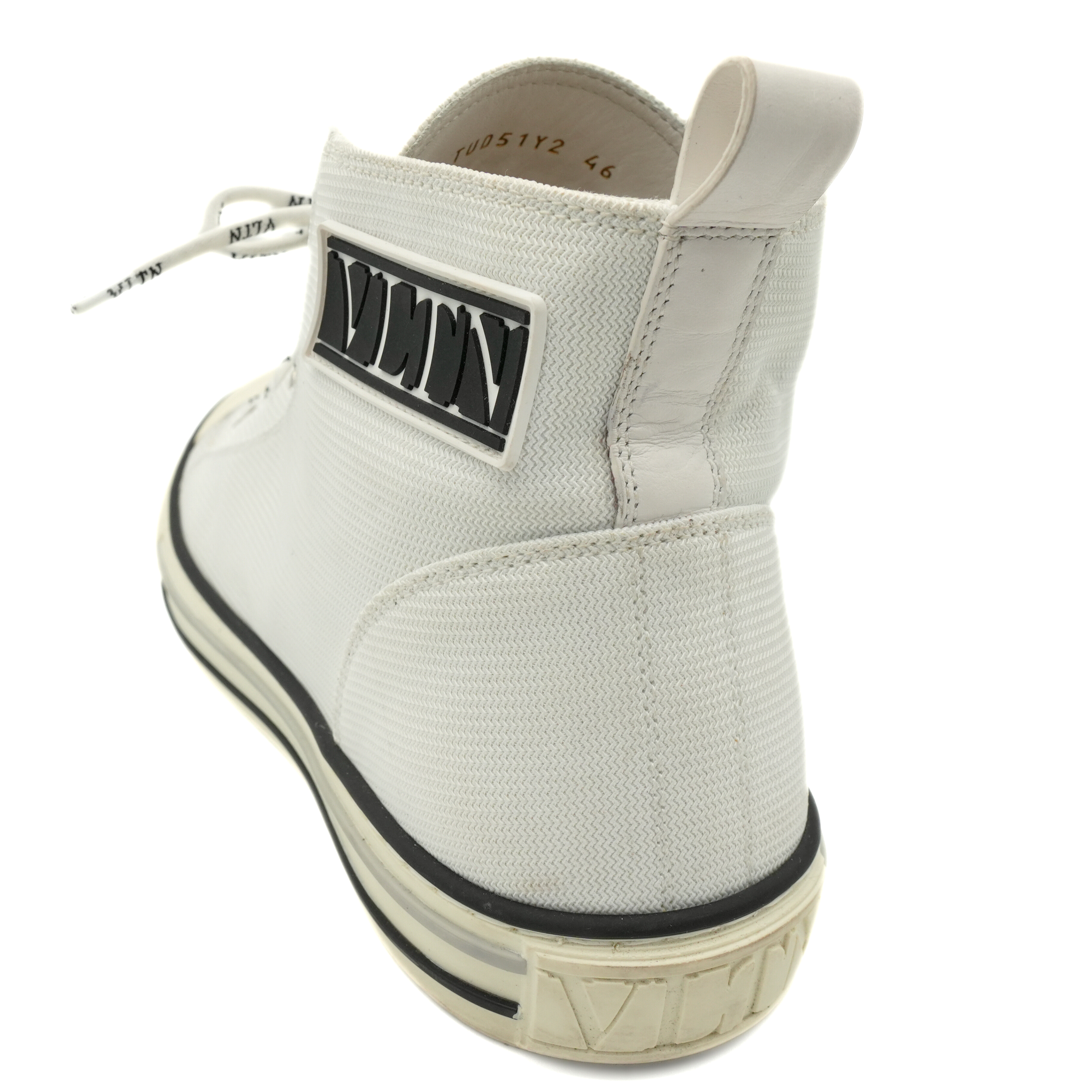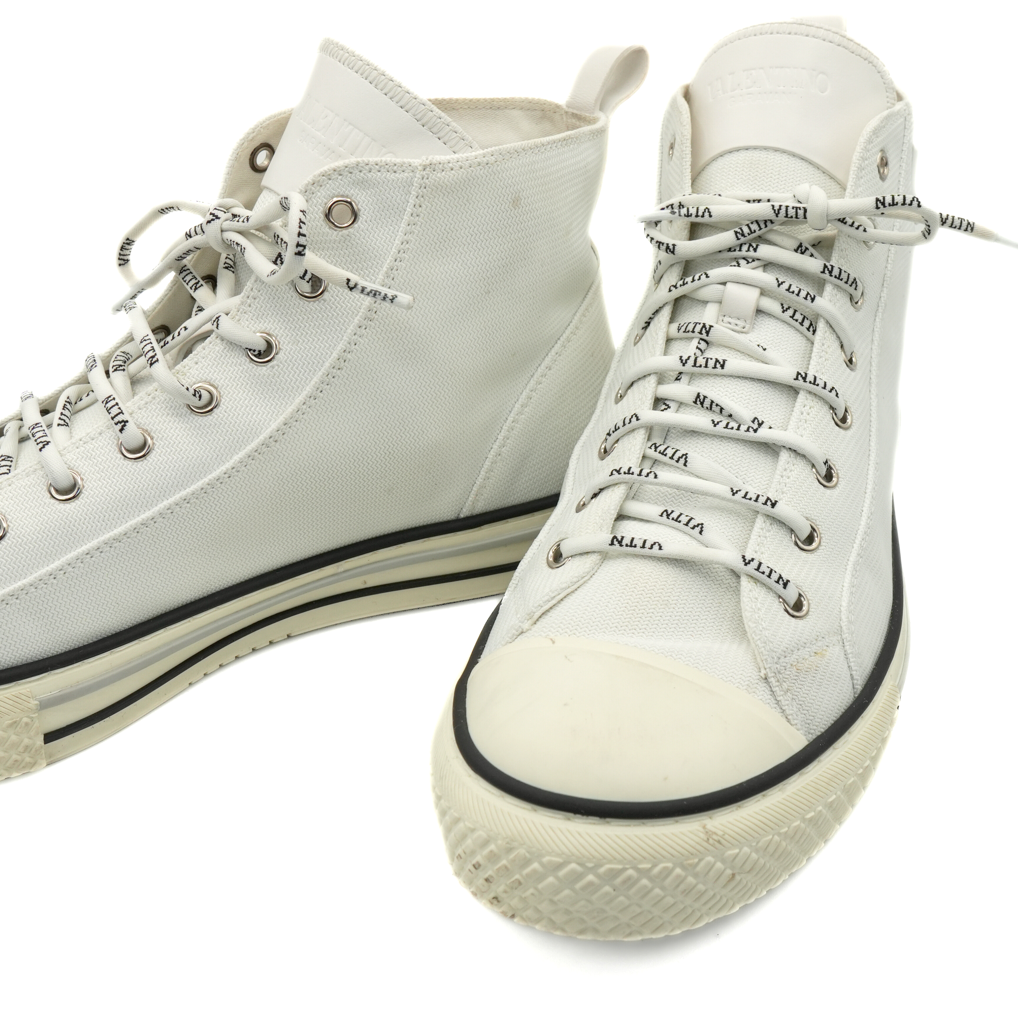 Valentino 'VLTN' logo high-top sneakers in white canvas with black rubber logo on the side, monogram round laces and rubber sole.