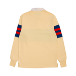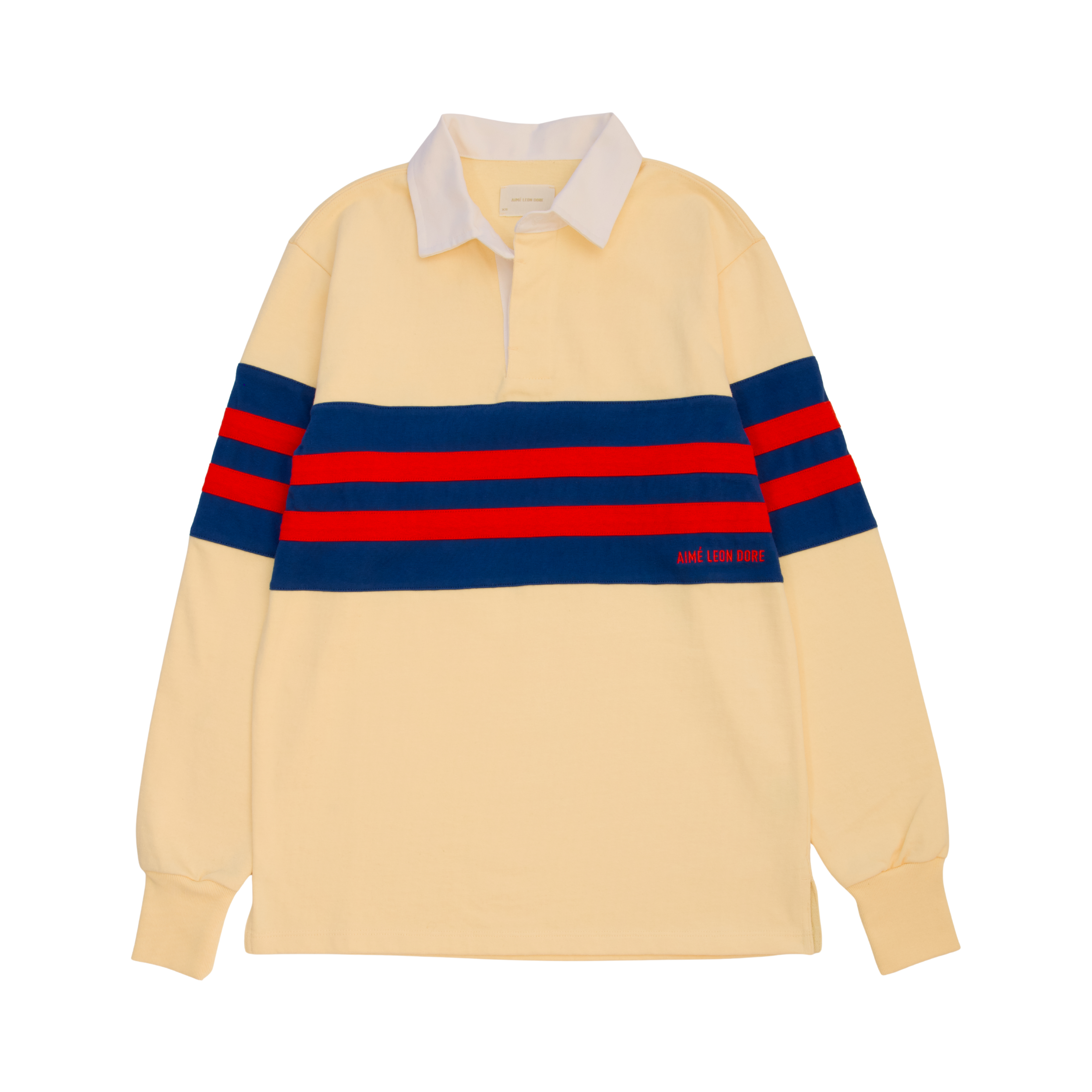 Aime Leon Dore rugby shirt in light yellow cotton with red and blue stripes, an embroidered logo, and a white collar.