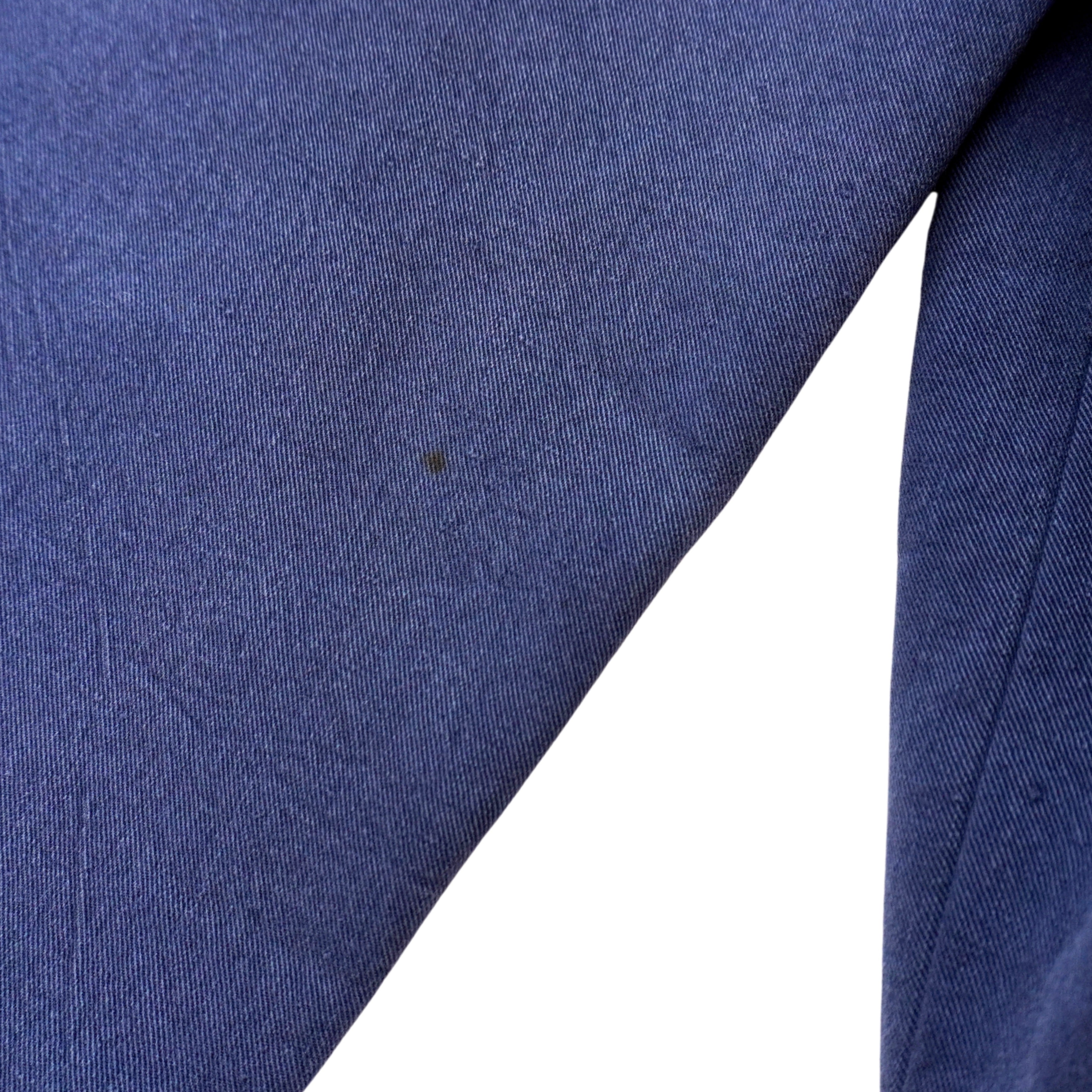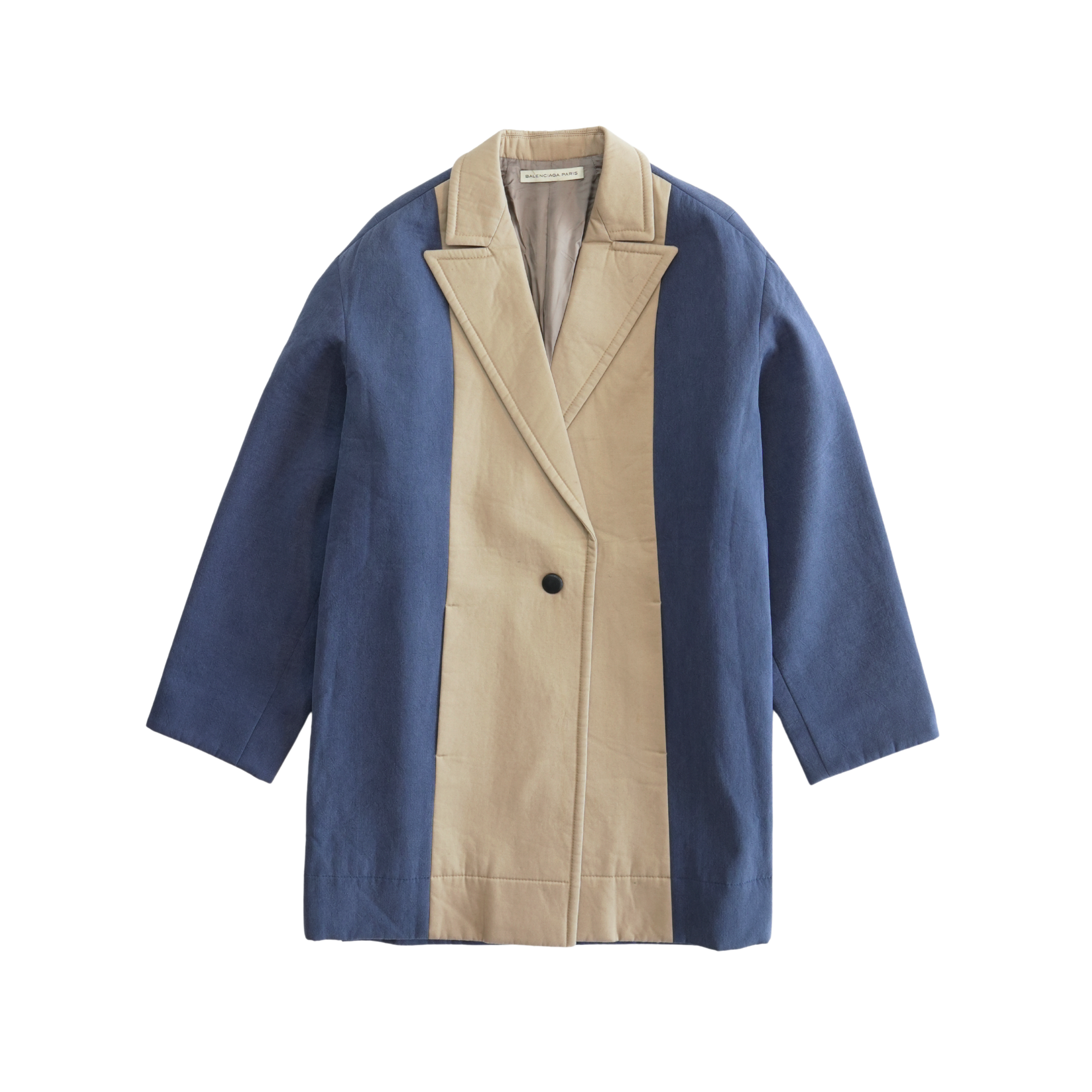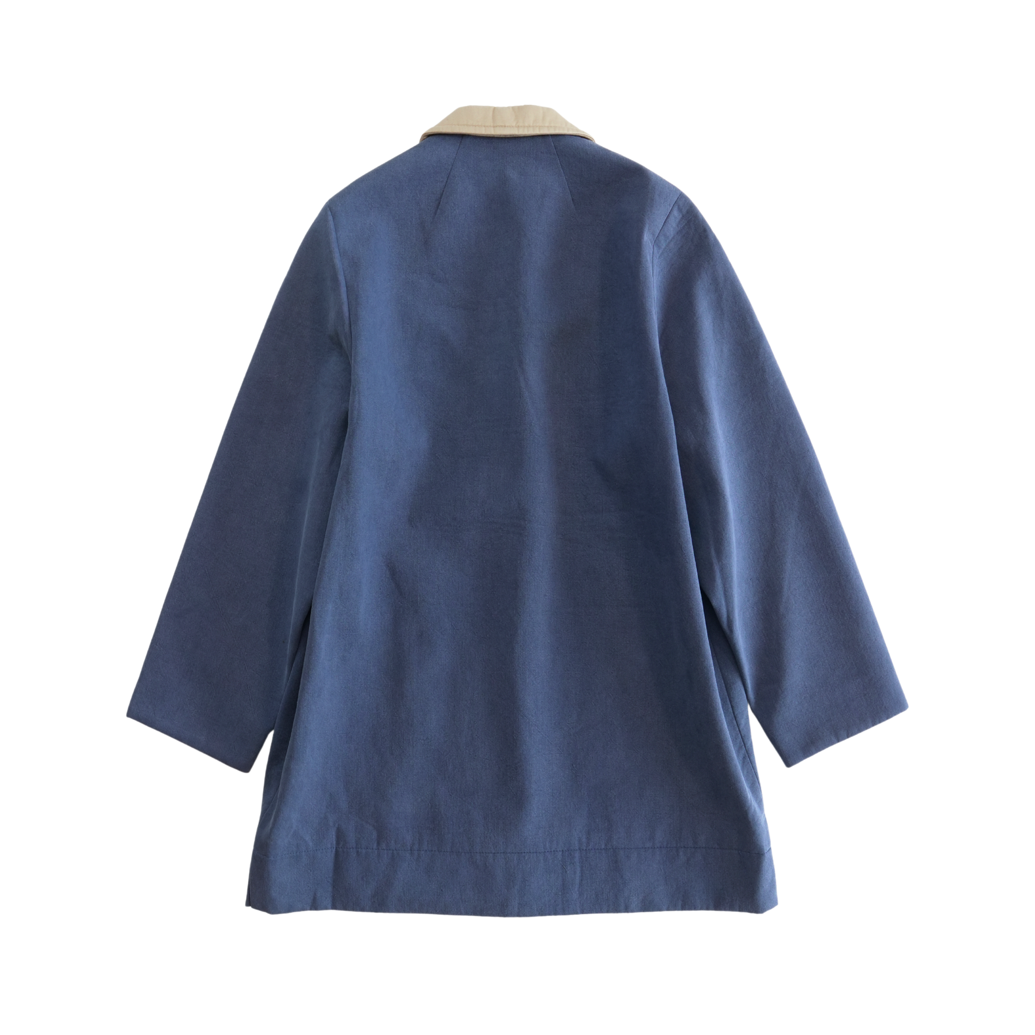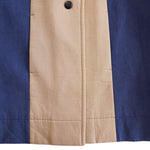 Balenciaga mid-length coat in blue and beige cotton with a single snap button closure, slip pockets, and a notch lapel collar.