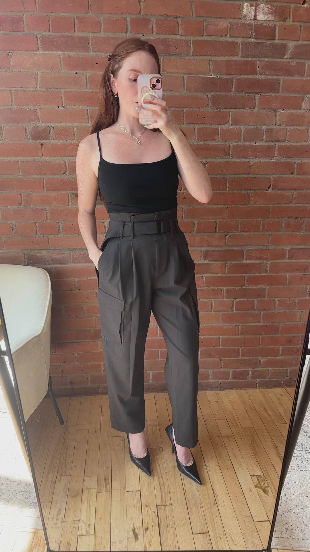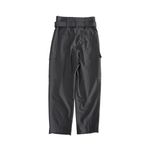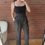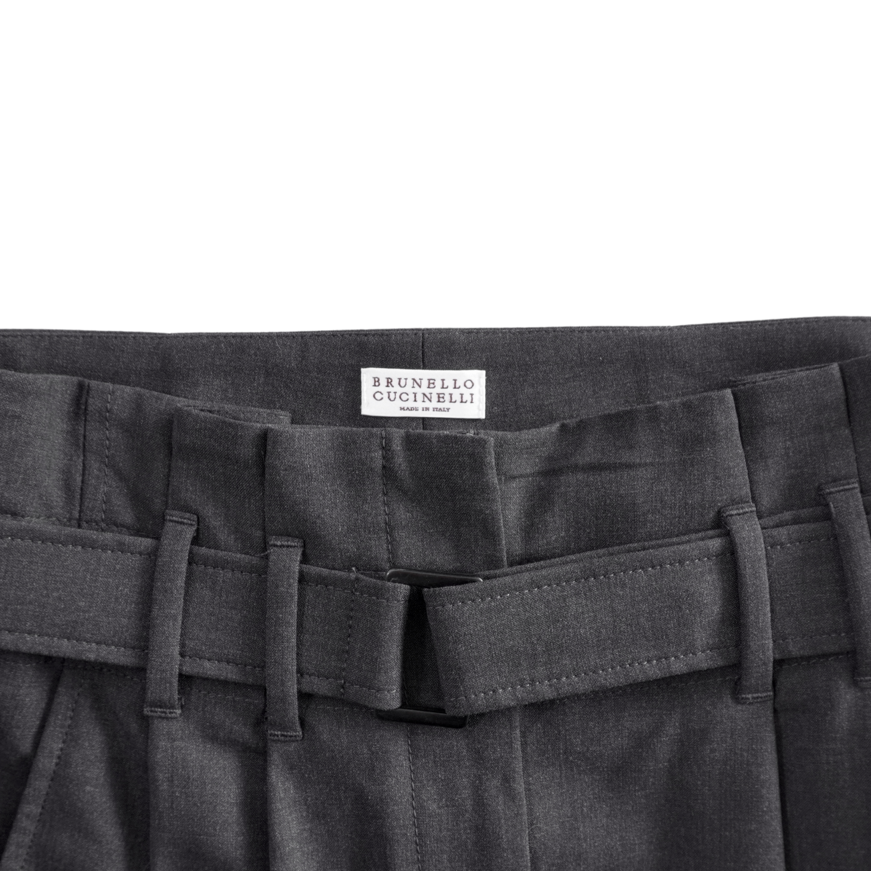 Brunello Cucinelli pleated high waisted trousers in dark grey wool with large cargo pockets and gunmetal beading detail, side slash pockets, back welt pockets and waist belt.