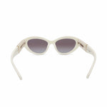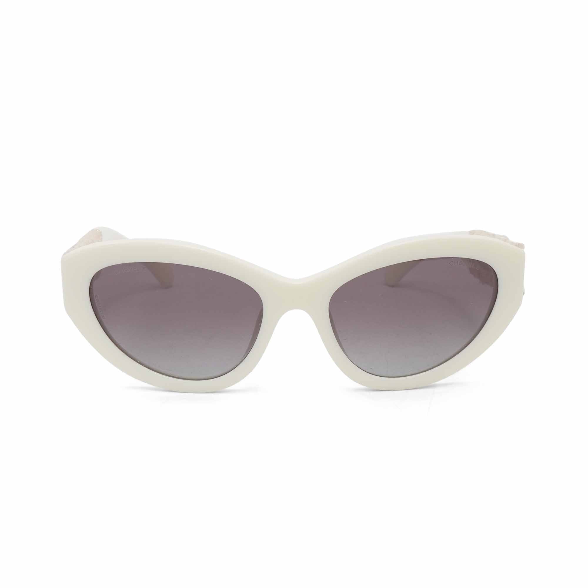 Chanel cat-eye sunglasses in white acetate with black oval lenses, a tweed trim on the arms, and a gold chain 'CC' logo on the sides.