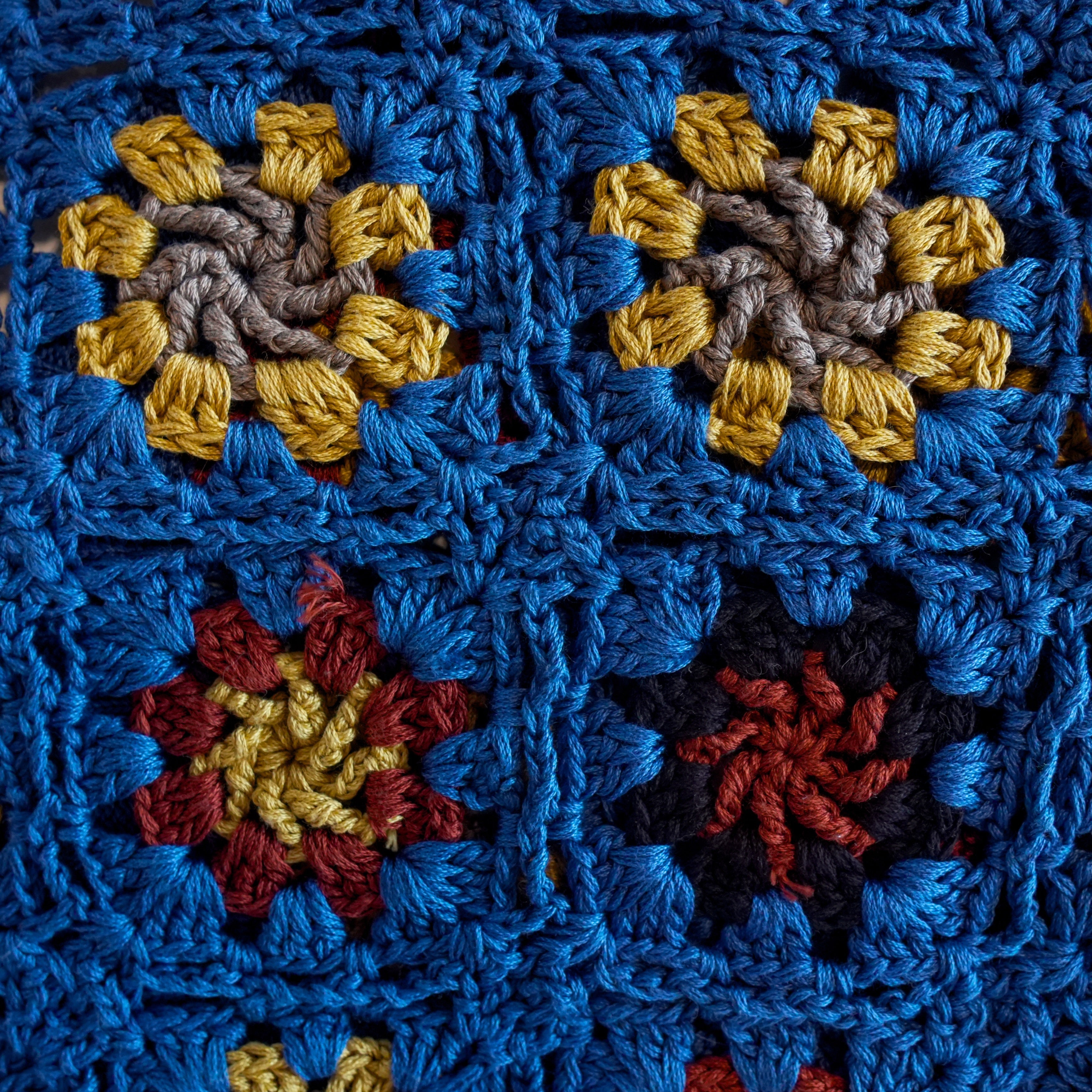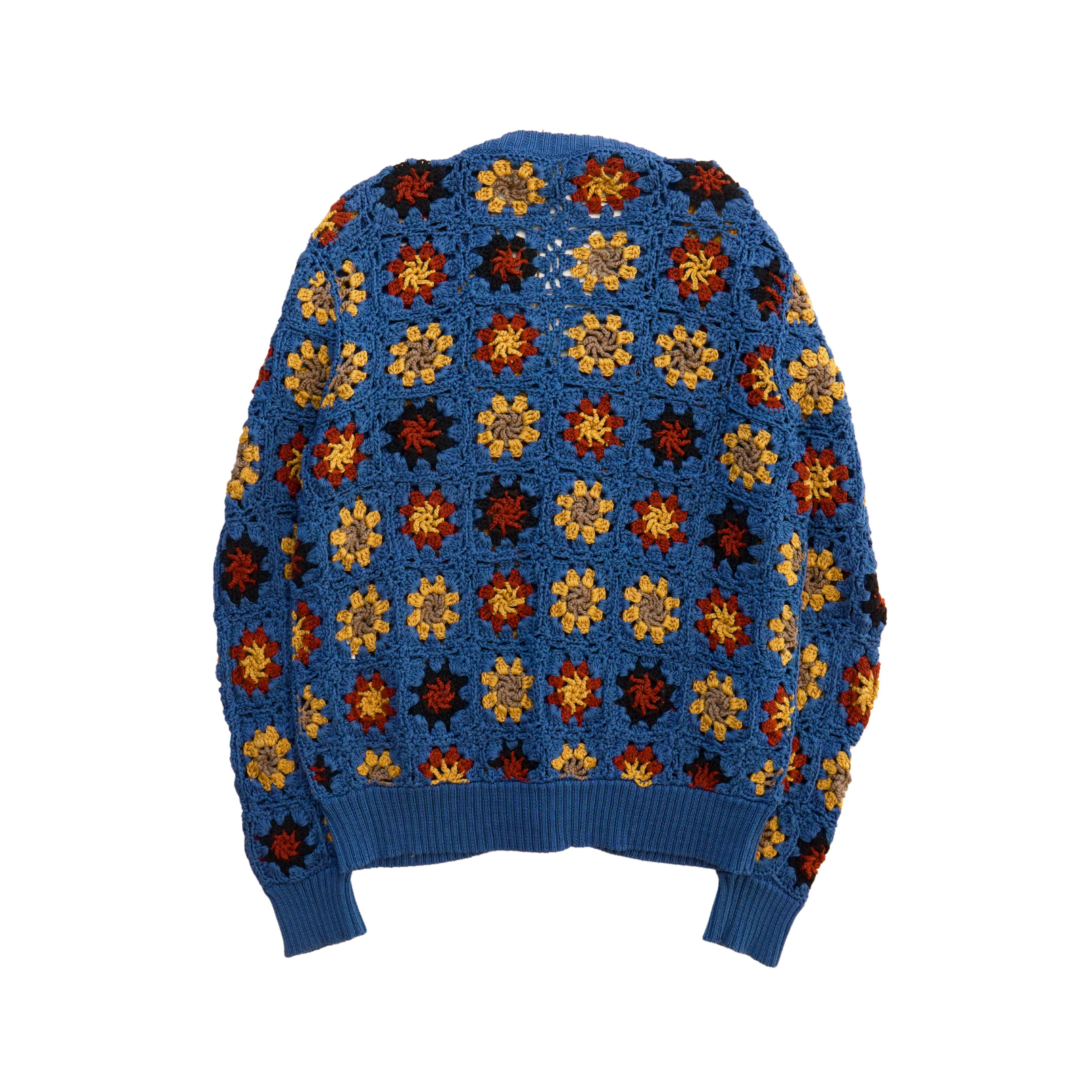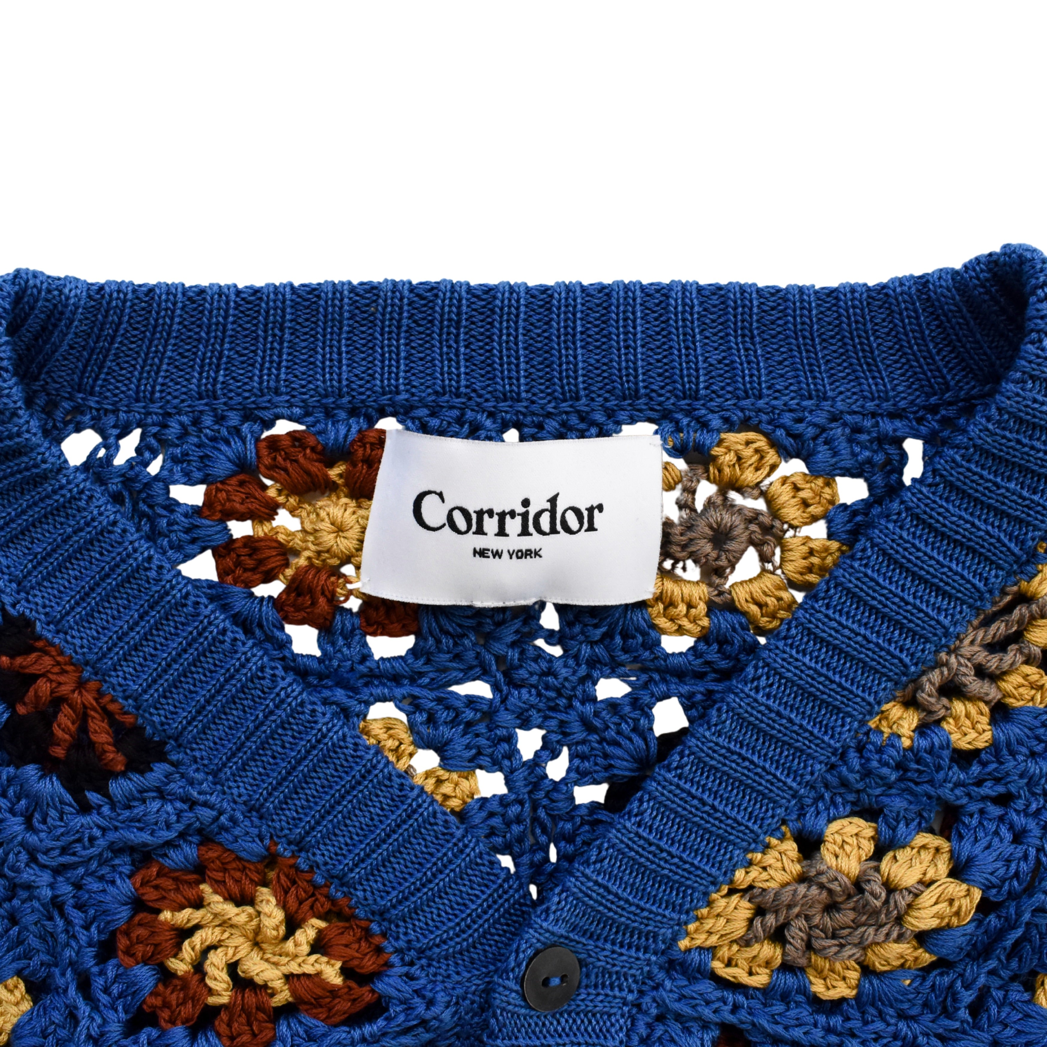 Corridor crochet cardigan sweater in blue cotton with black, rust, and yellow hand crochet flowers throughout, a front button closure, and ribbed knit trim.