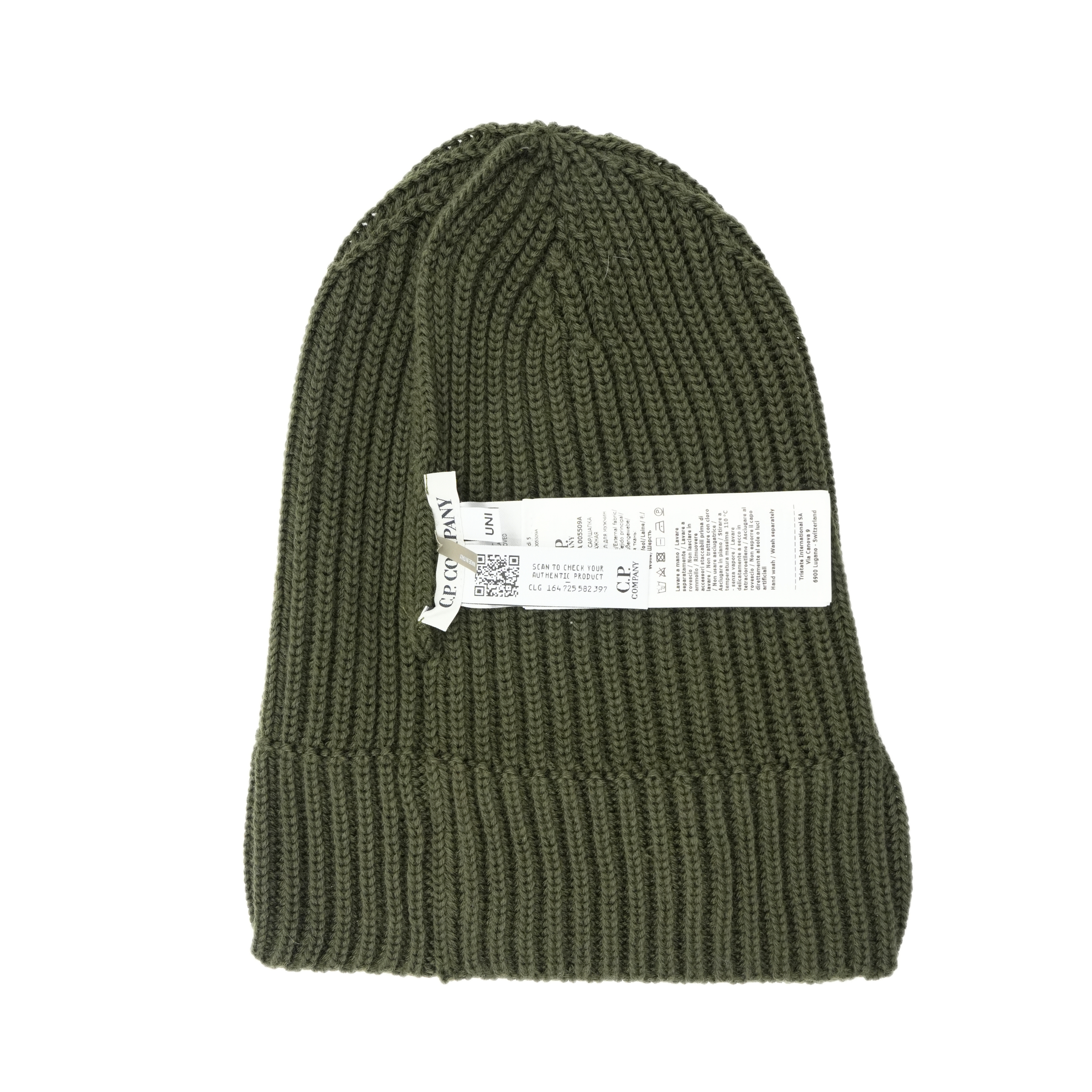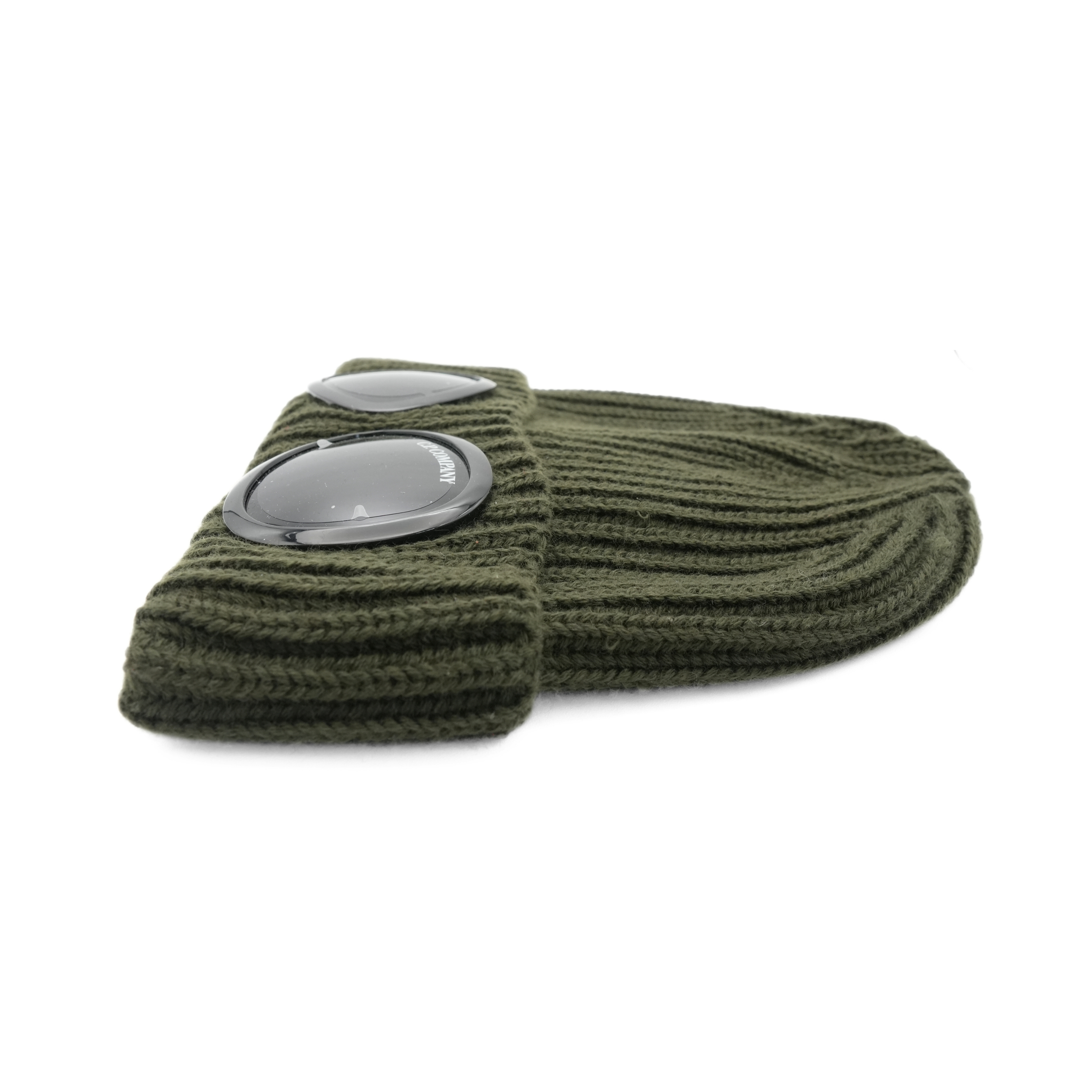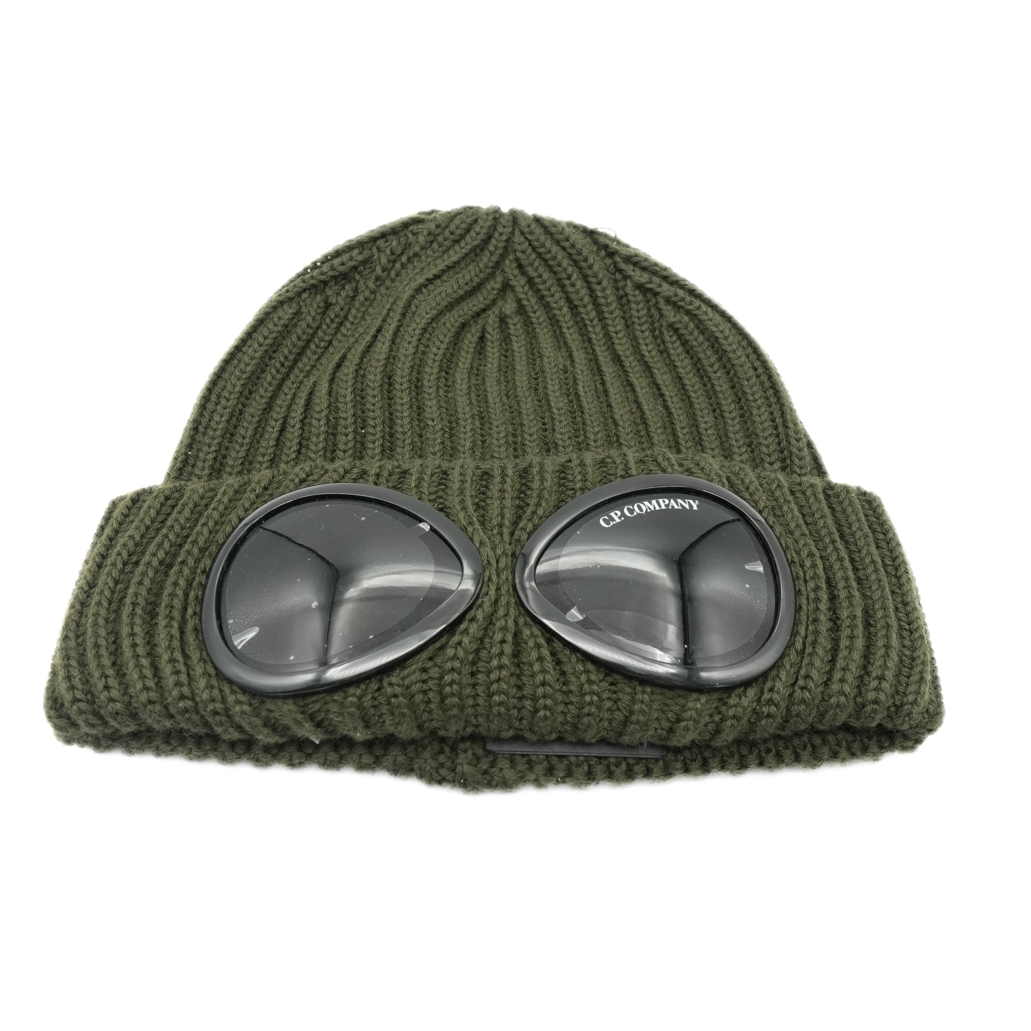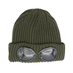 CP Company 'Goggle' knit toque in dark green wool with signature black goggles on the front band.