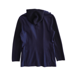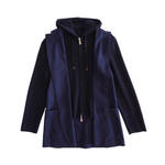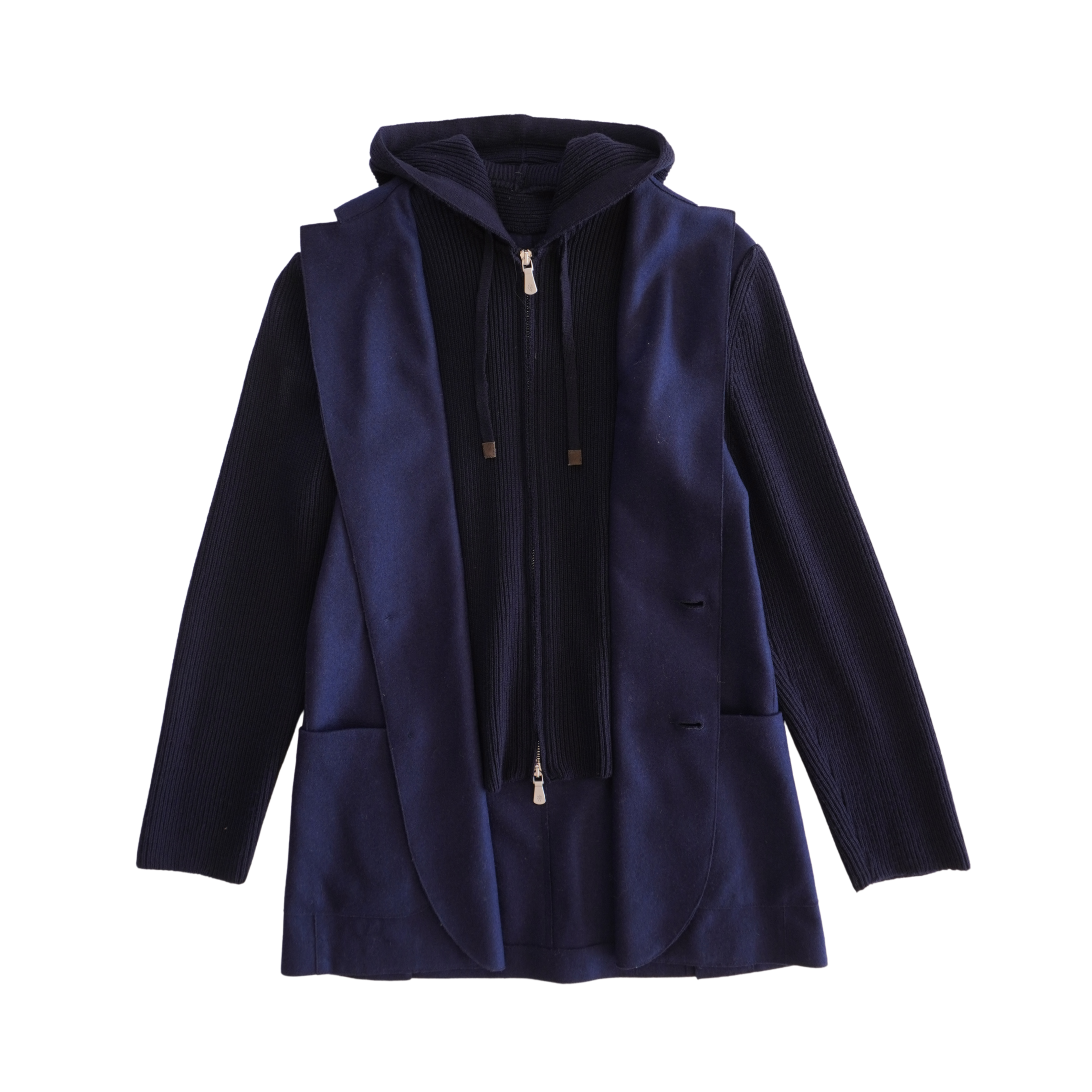Eleventy zip up jacket with front wool vest panels and ribbed knit sleeves, hood and under layer with two-way silver zipper.