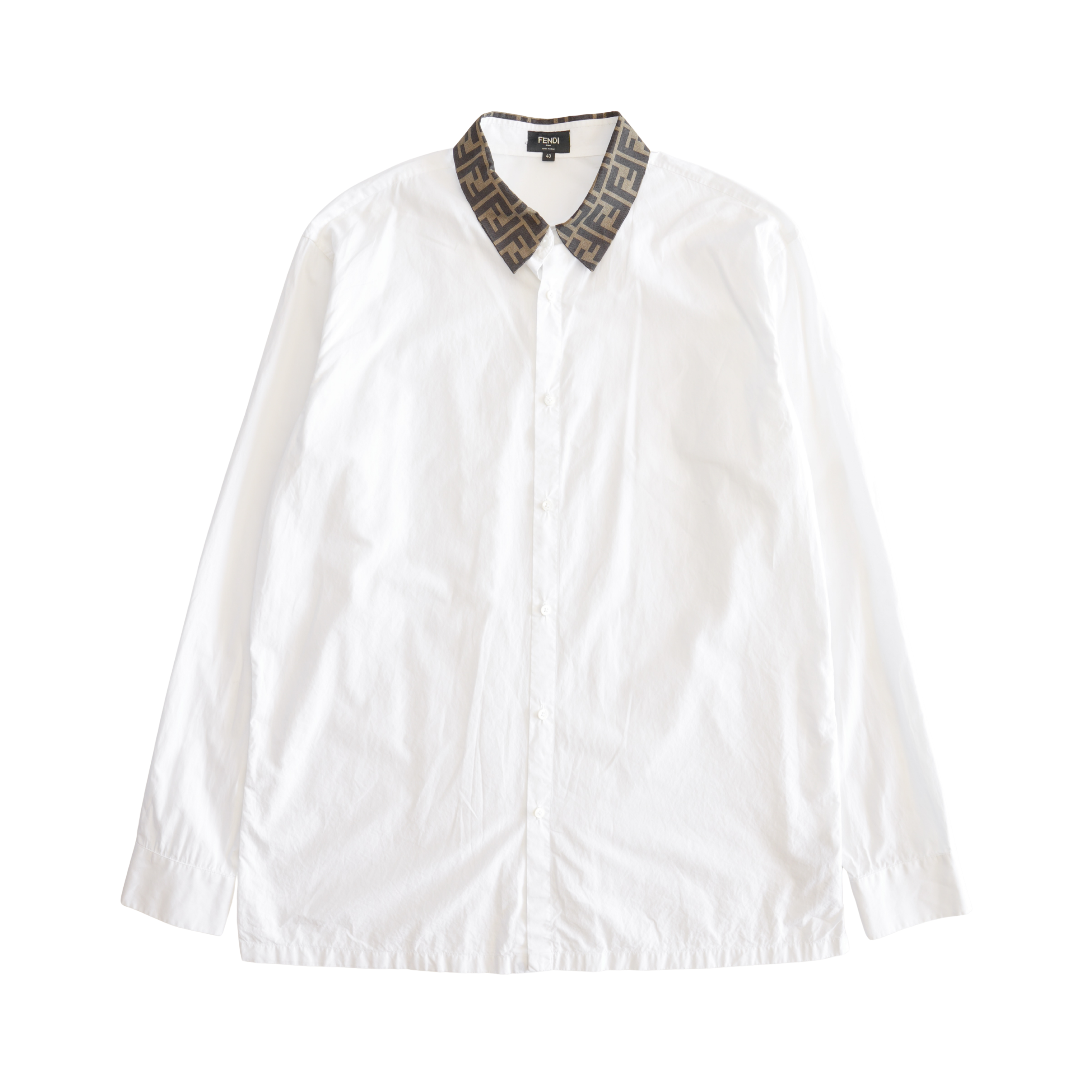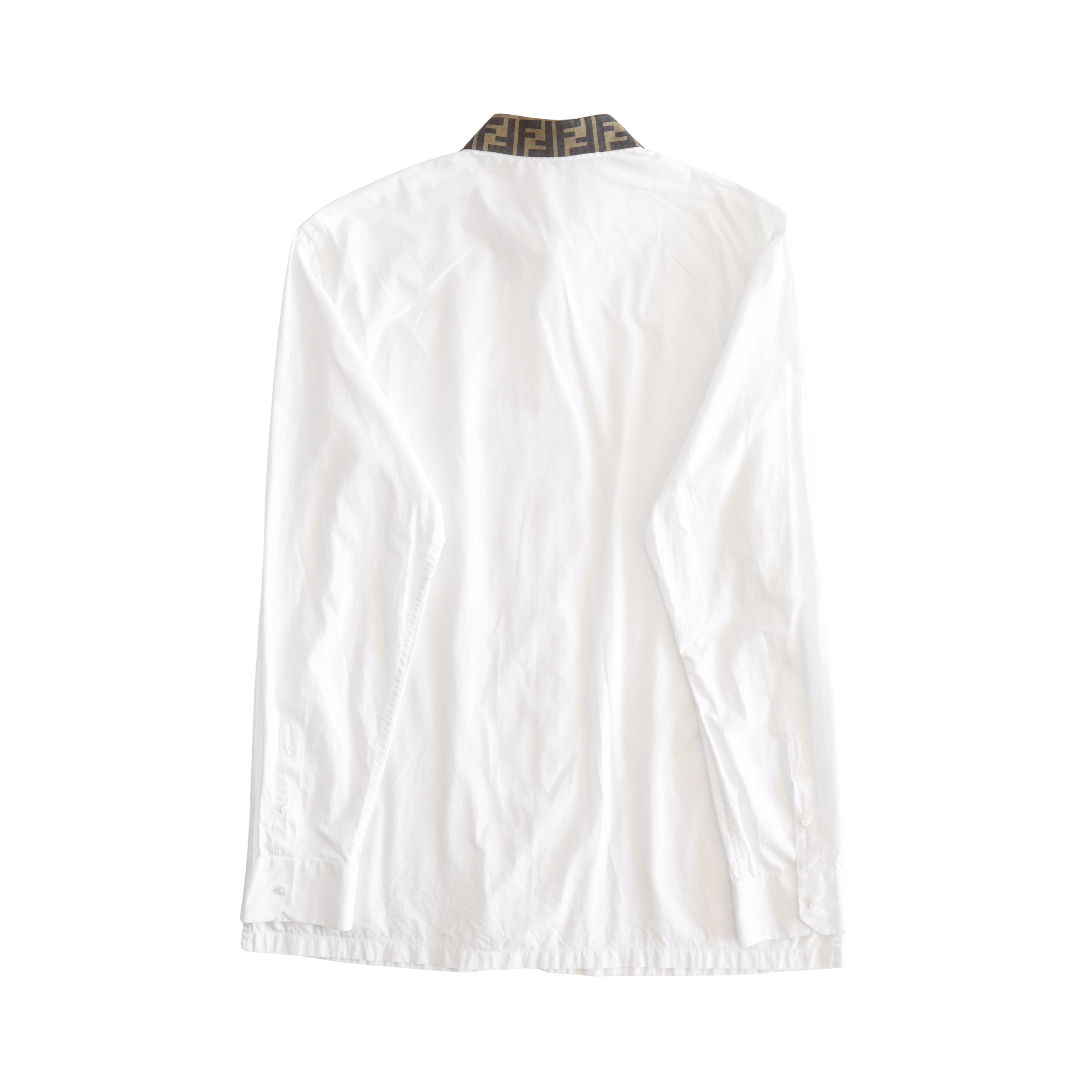 Fendi button-down shirt in white cotton with a brown 'FF Zucca' monogram collar detail.