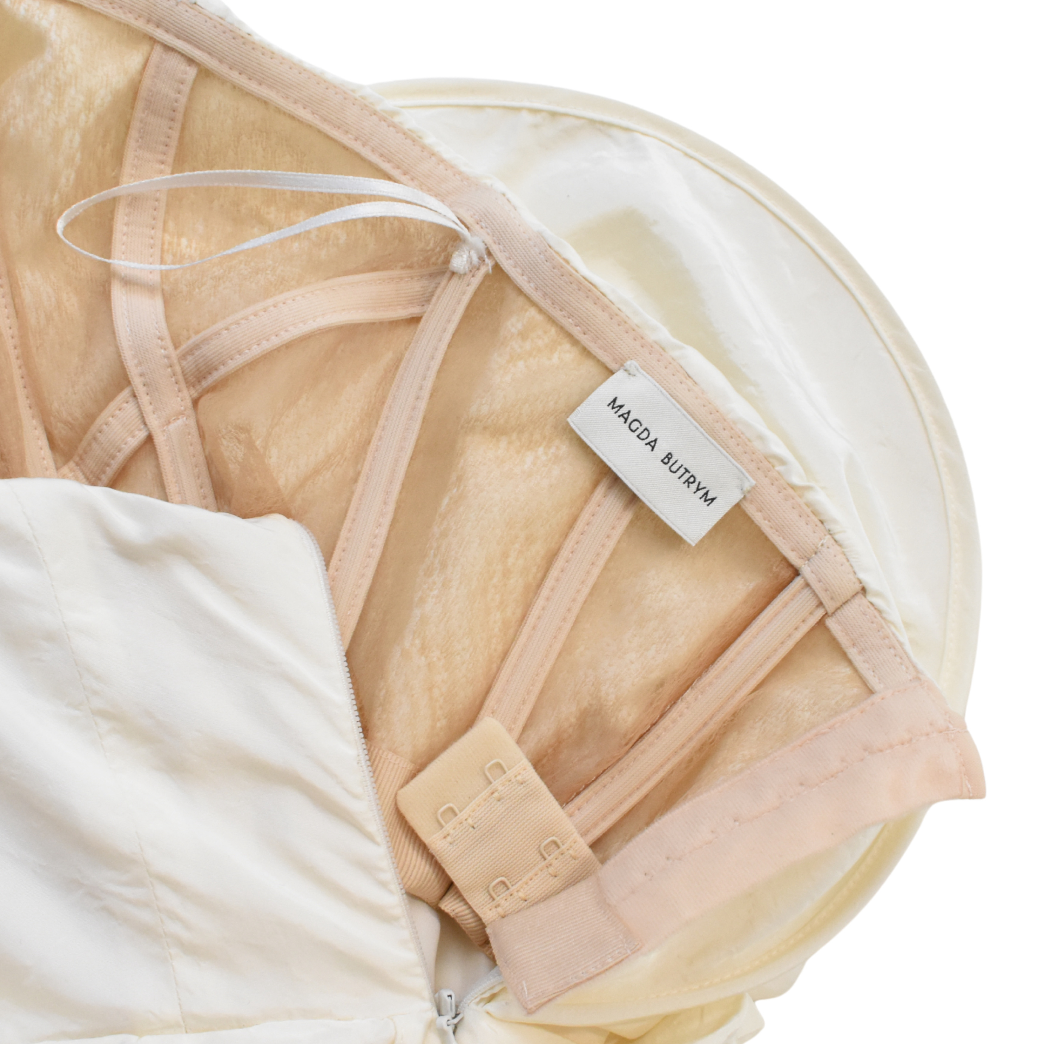 Magda Butrym strapless mini dress in ruched cream tafetta with sculptural paneling at the bust and a built in corset.