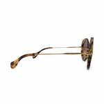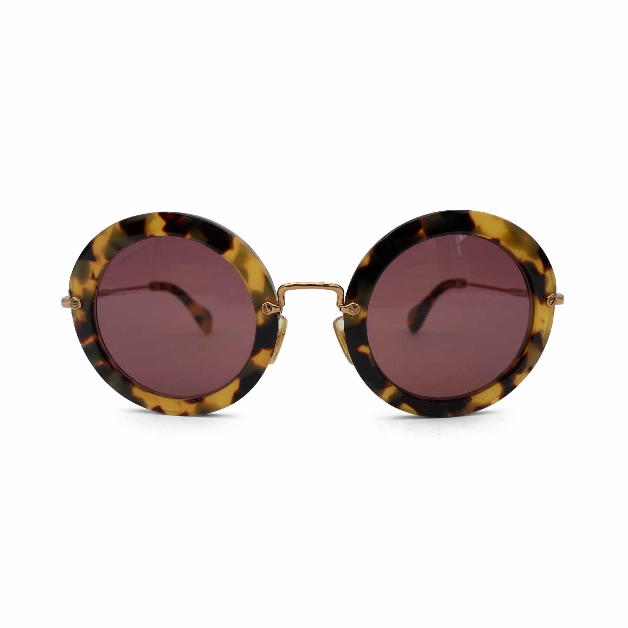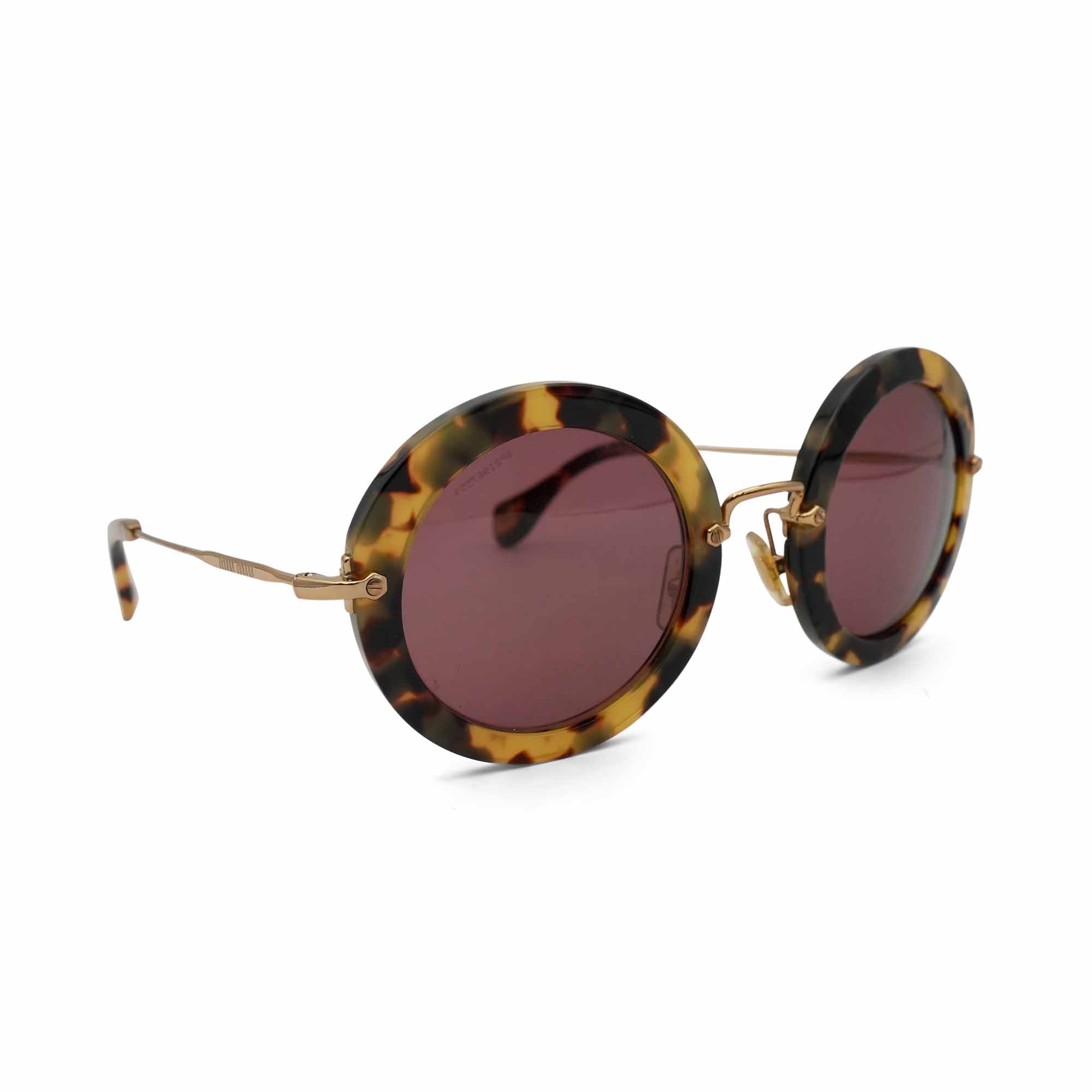 Miu Miu sunglasses in brown and black tortoise acetate with round pink lenses and gold metal arms.