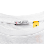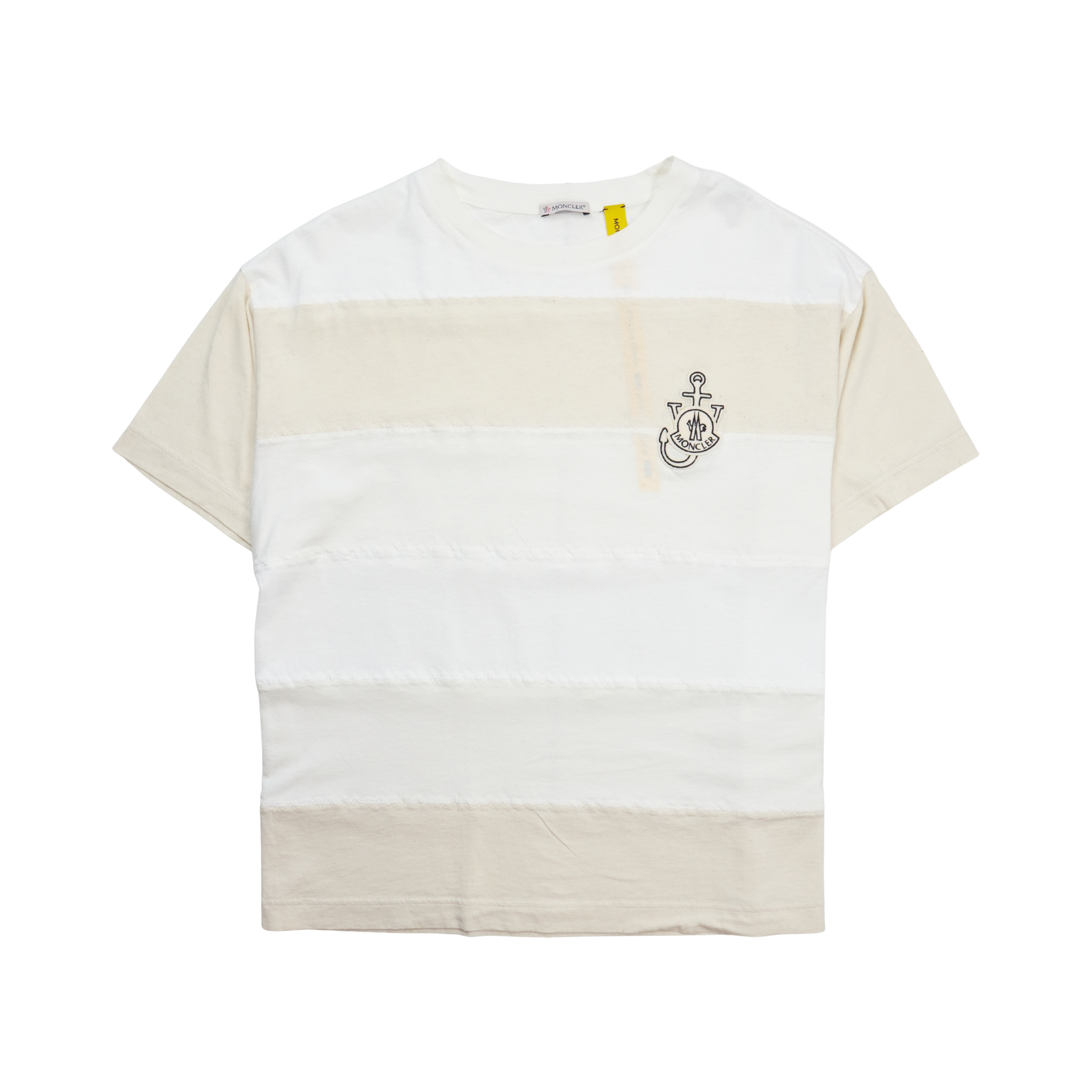 Moncler Genius x JW Anderson t-shirt in white and cream panels with layered logo patches.