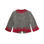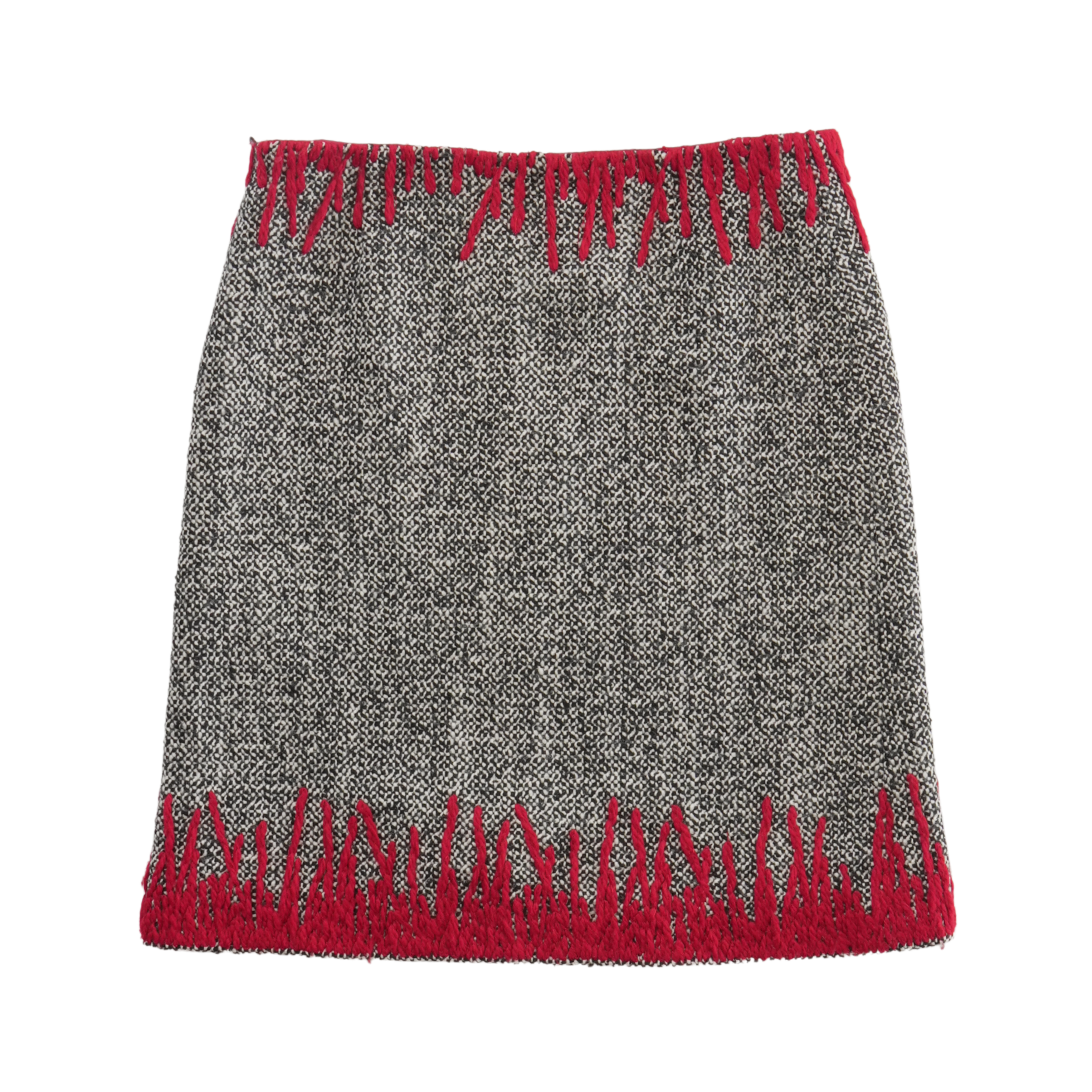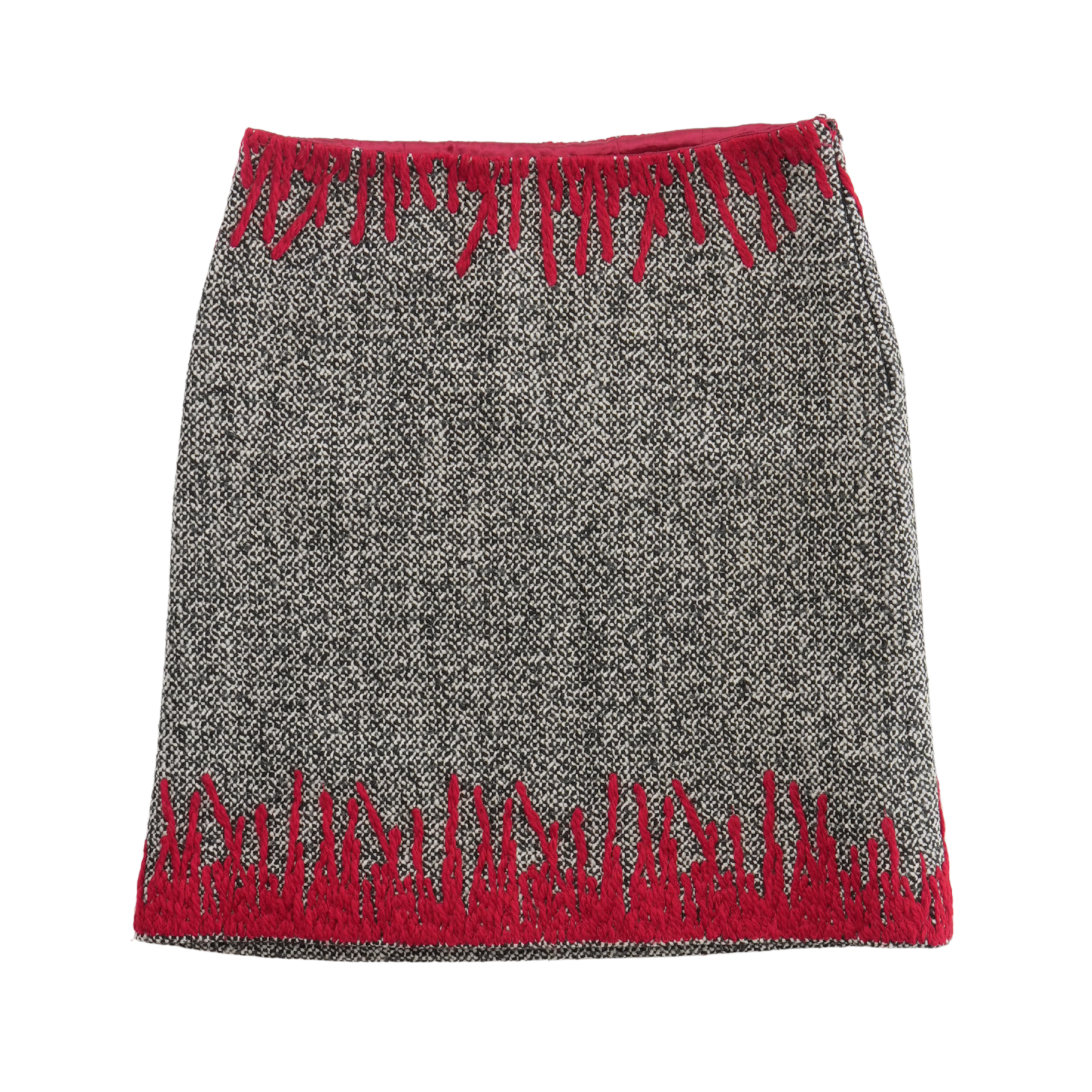 Moschino two-piece jacket and skirt set in grey and white wool tweed with a bright red embroidered trim.