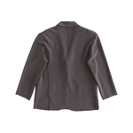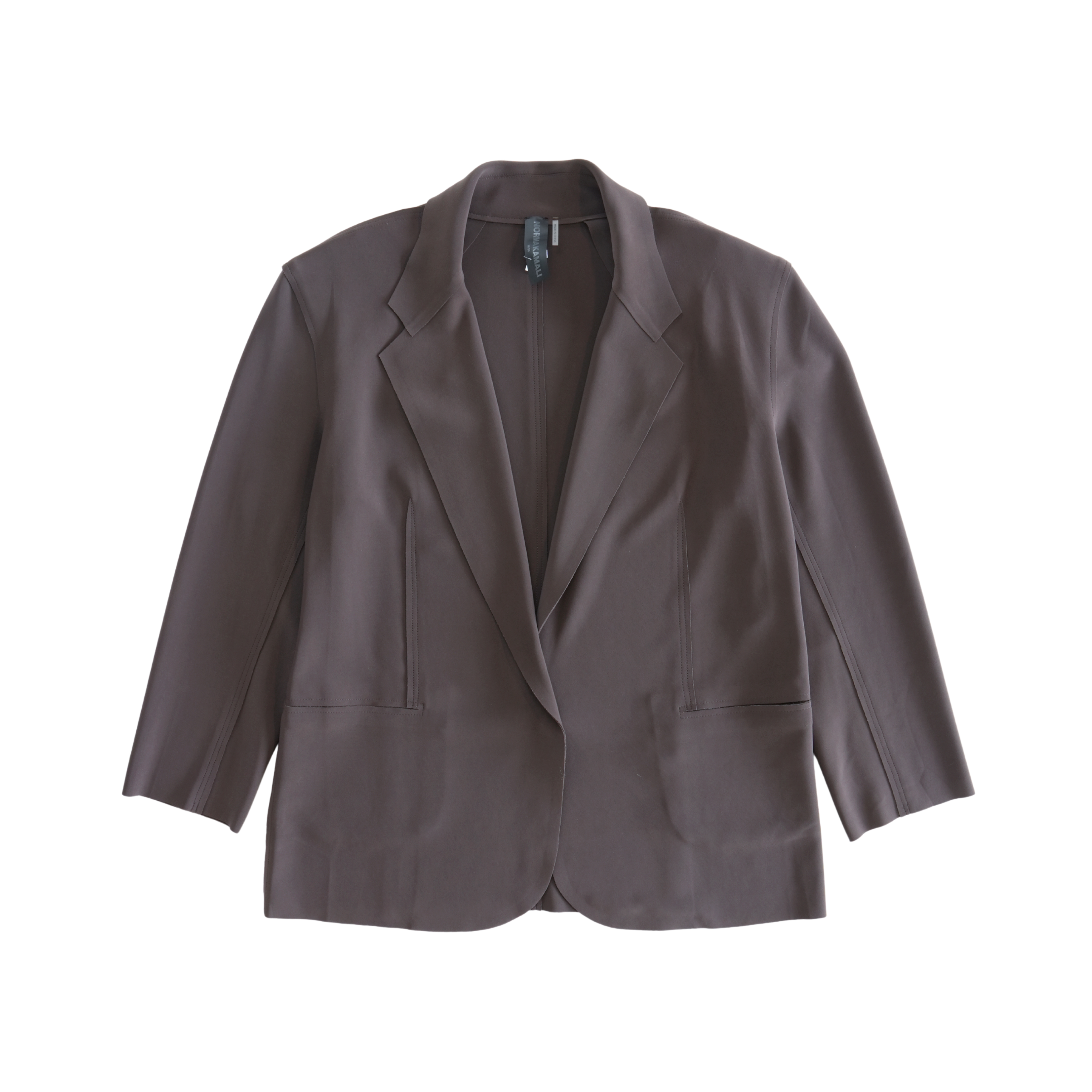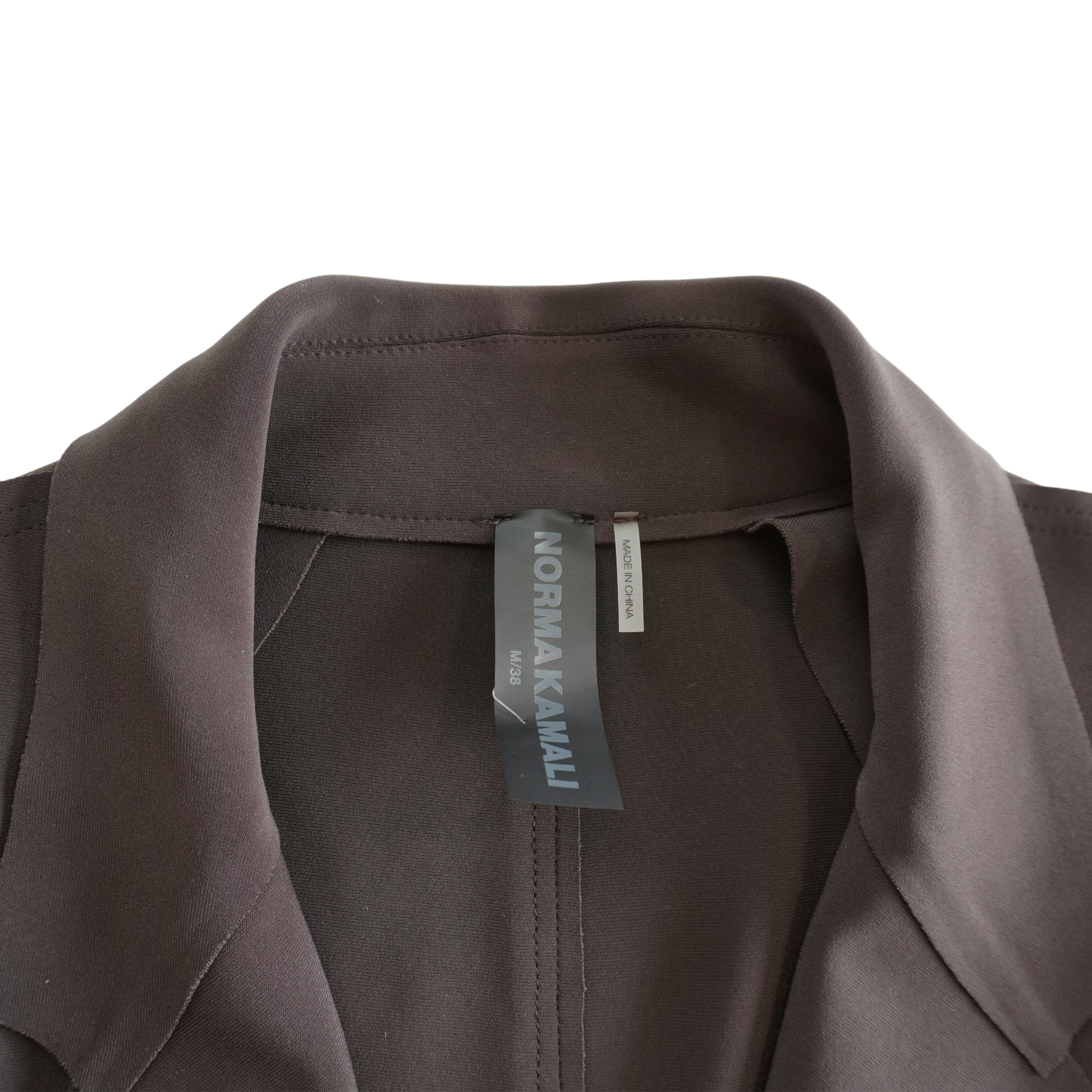 Norma Kamali oversized blazer jacket in brown jersey neoprene with a single velcro button closure, visible seam trim, raw hems, and slip pockets.