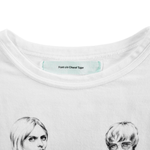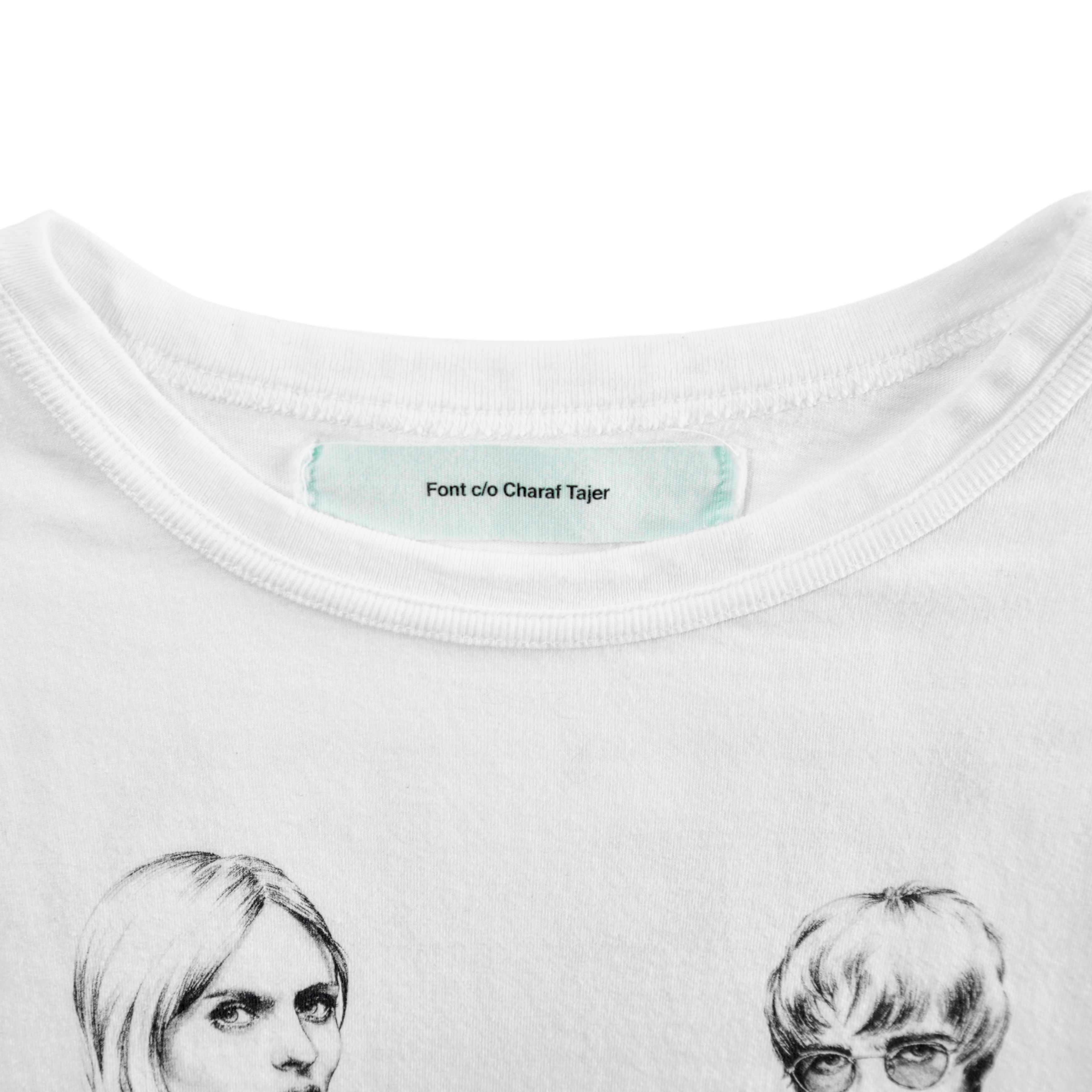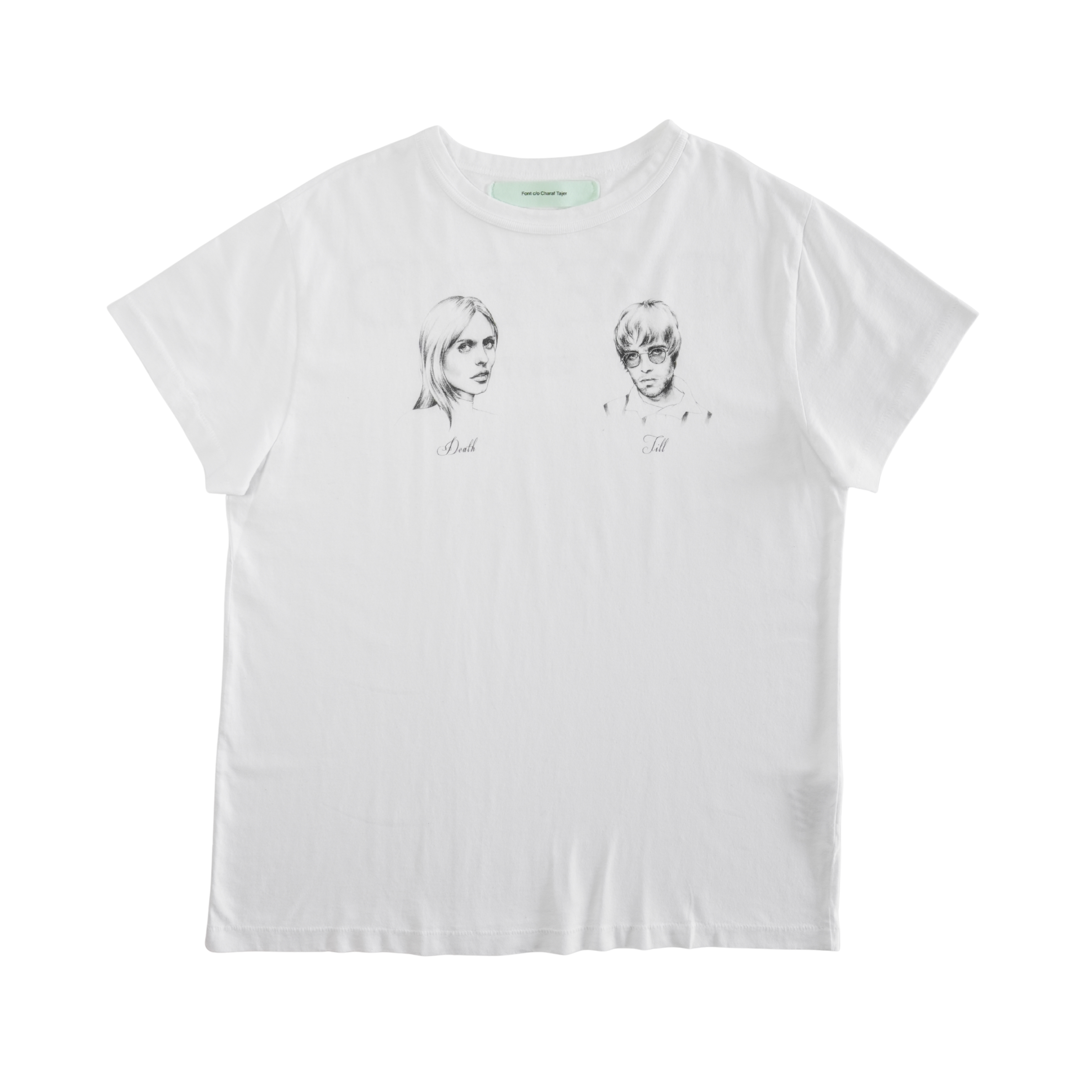 OFF-WHITE 'Death Till The End' t-shirt in white cotton with portrait graphics on the front and a large text graphic across the back.