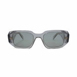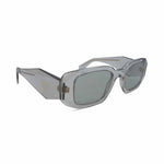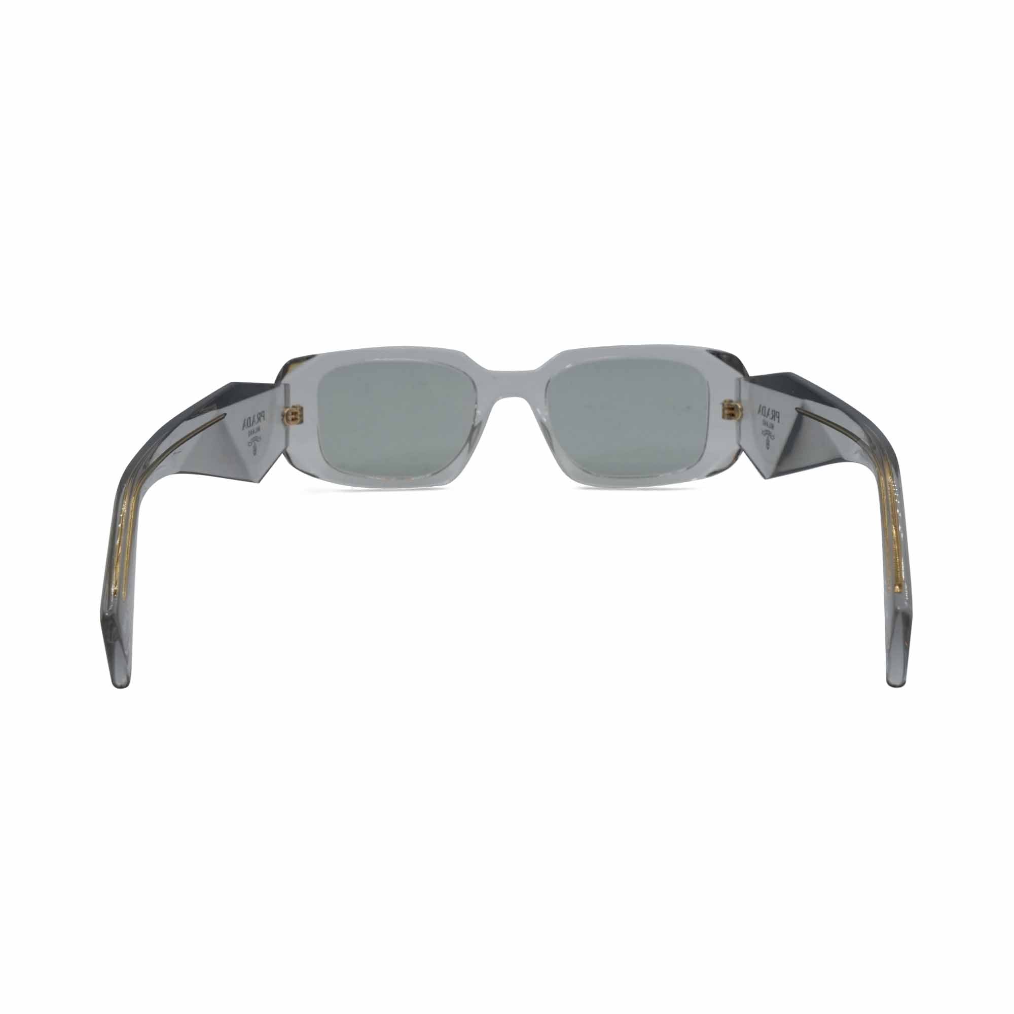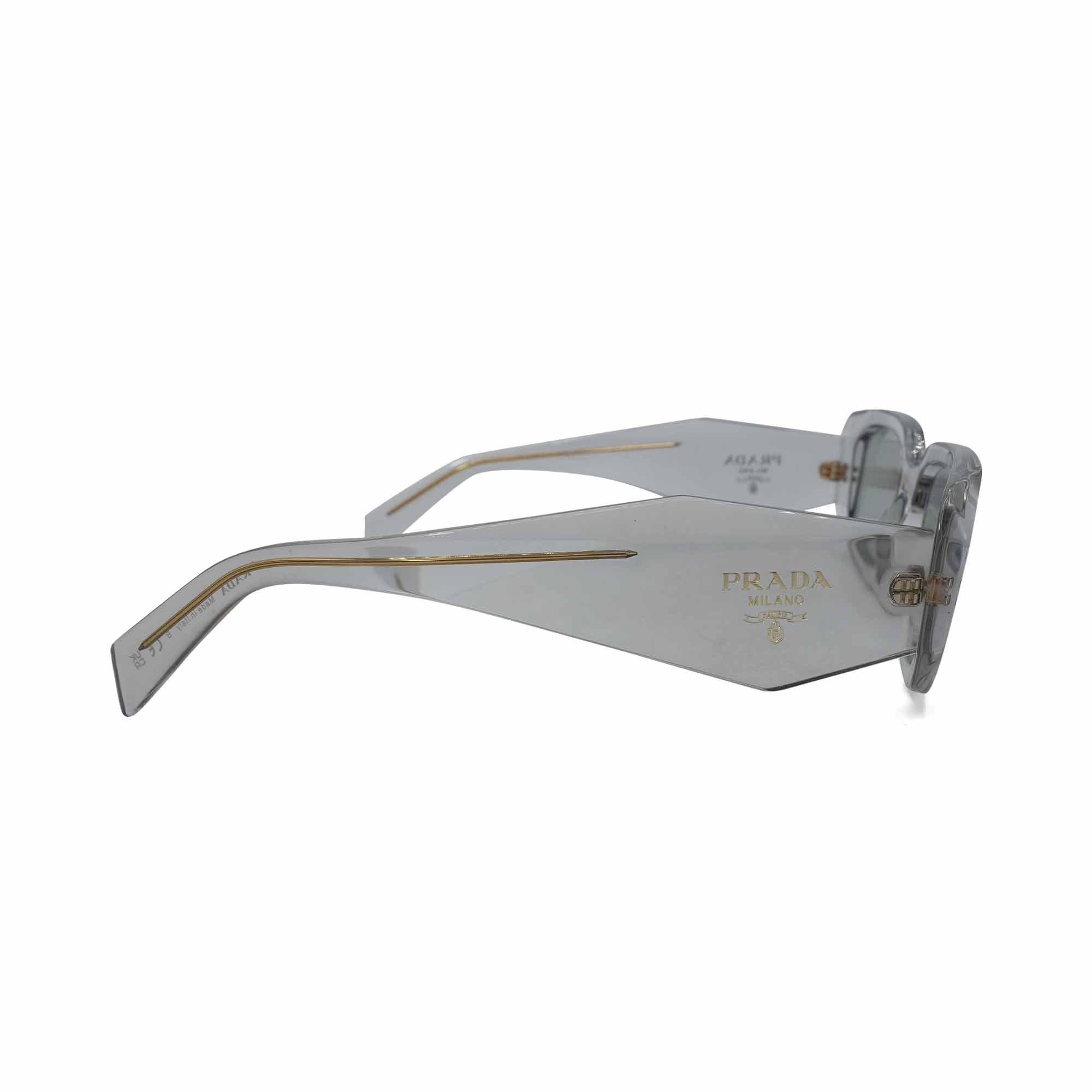 Prada angular sunglasses in clear acetate with gold hardware trim, rectangular lenses, faceted arms, and a gold logo on the sides.