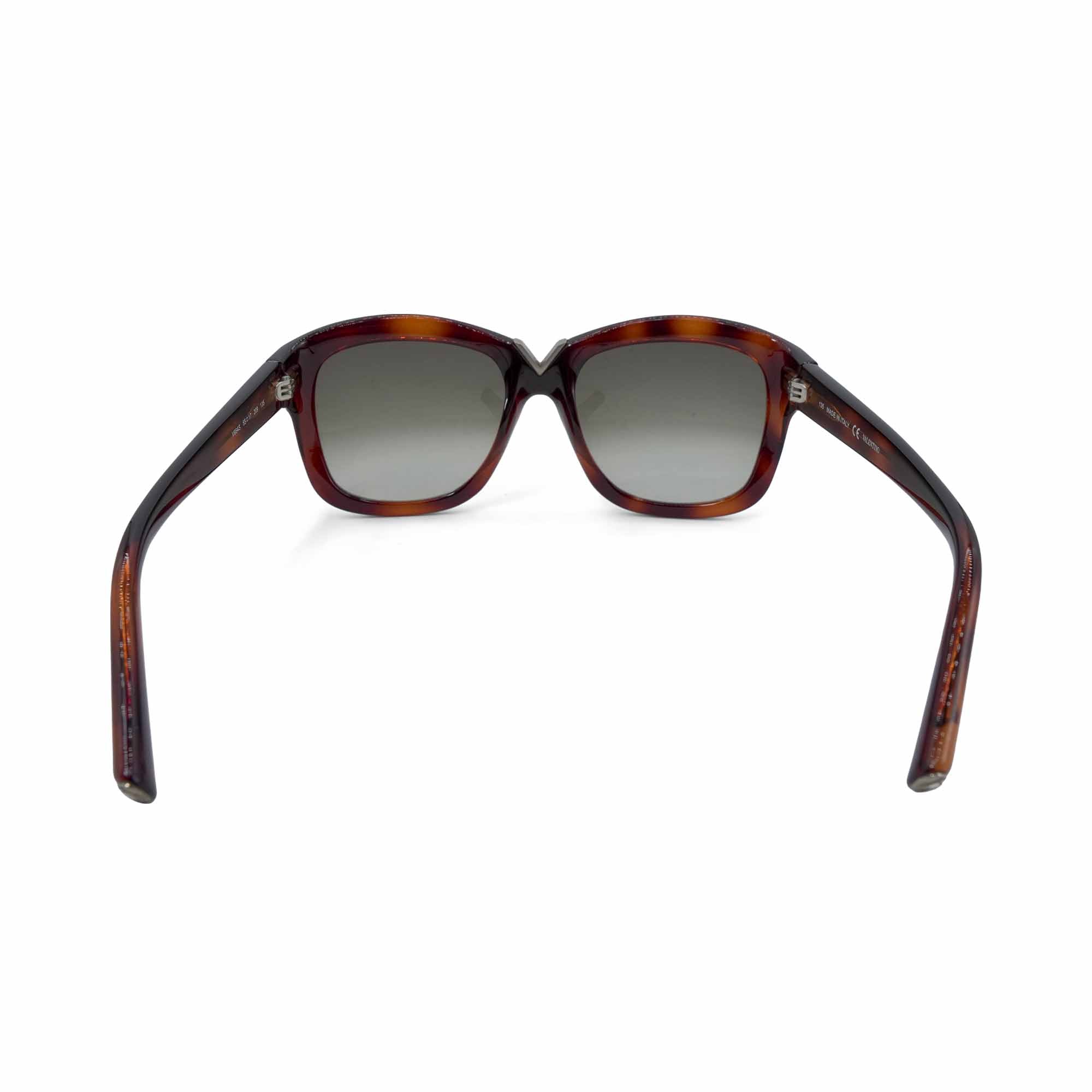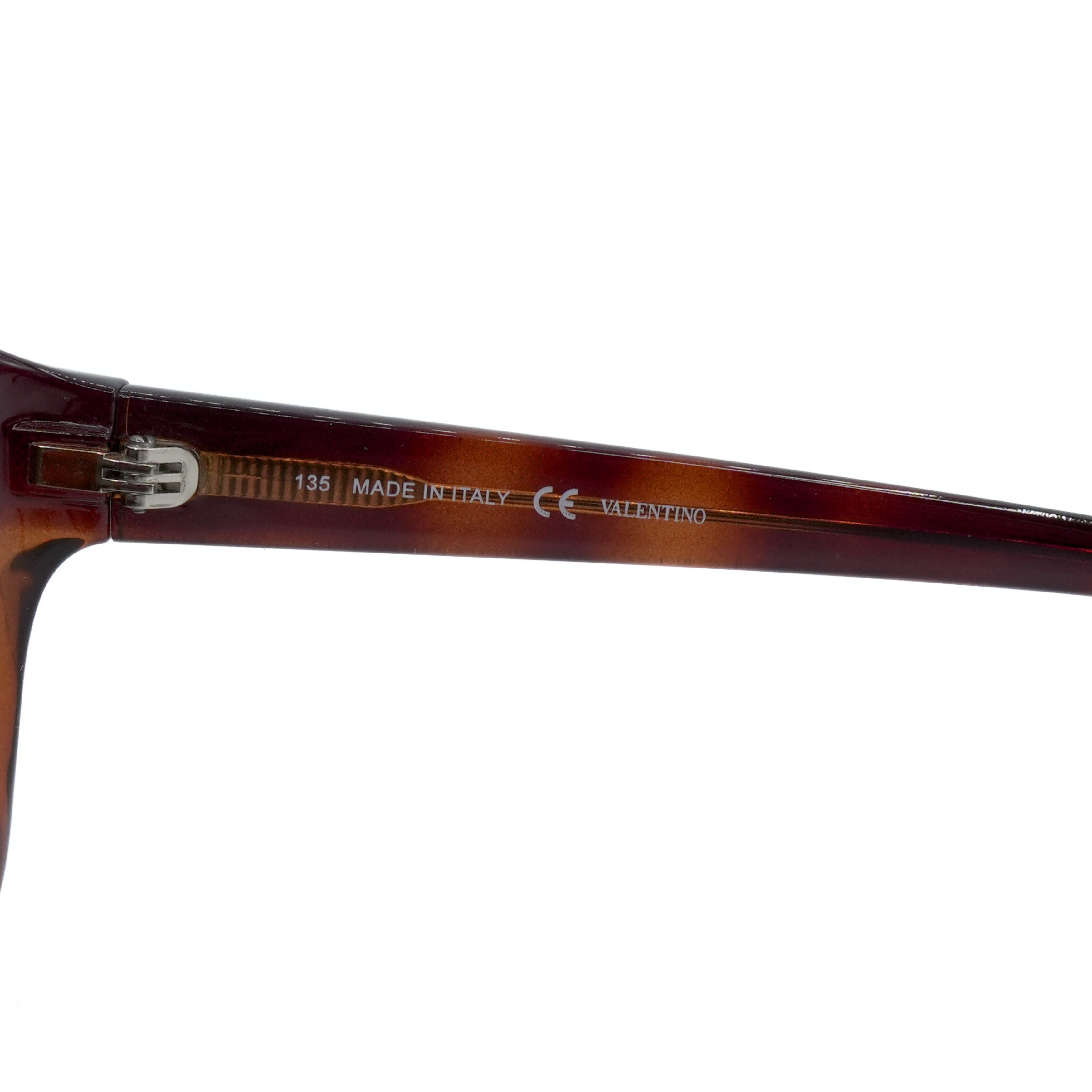Valentino sunglasses in brown tortoise acetate with large squared lenses and a silver metal 'V' cutout at the nose bridge.