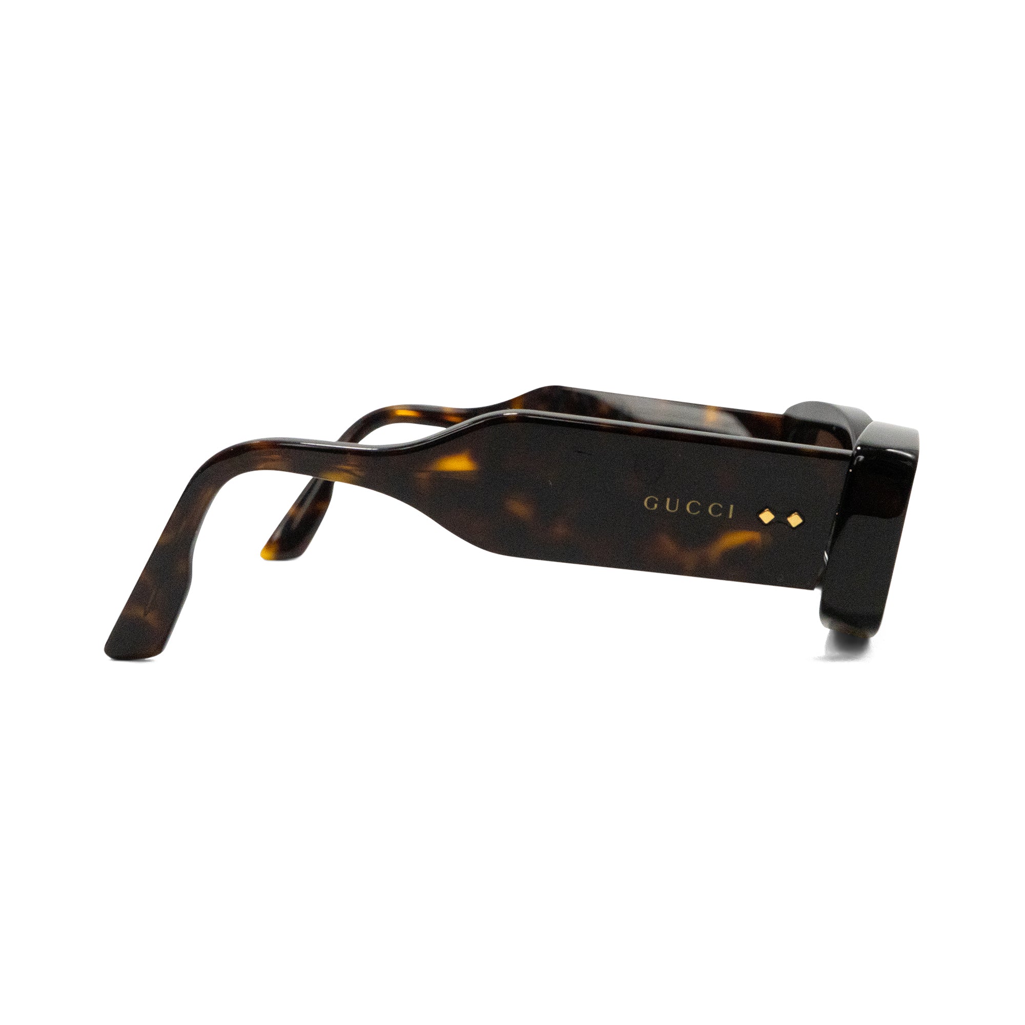 Gucci sunglasses in dark tortoise acetate with rectangular lenses, thick frames, and gold stud details on the arms.