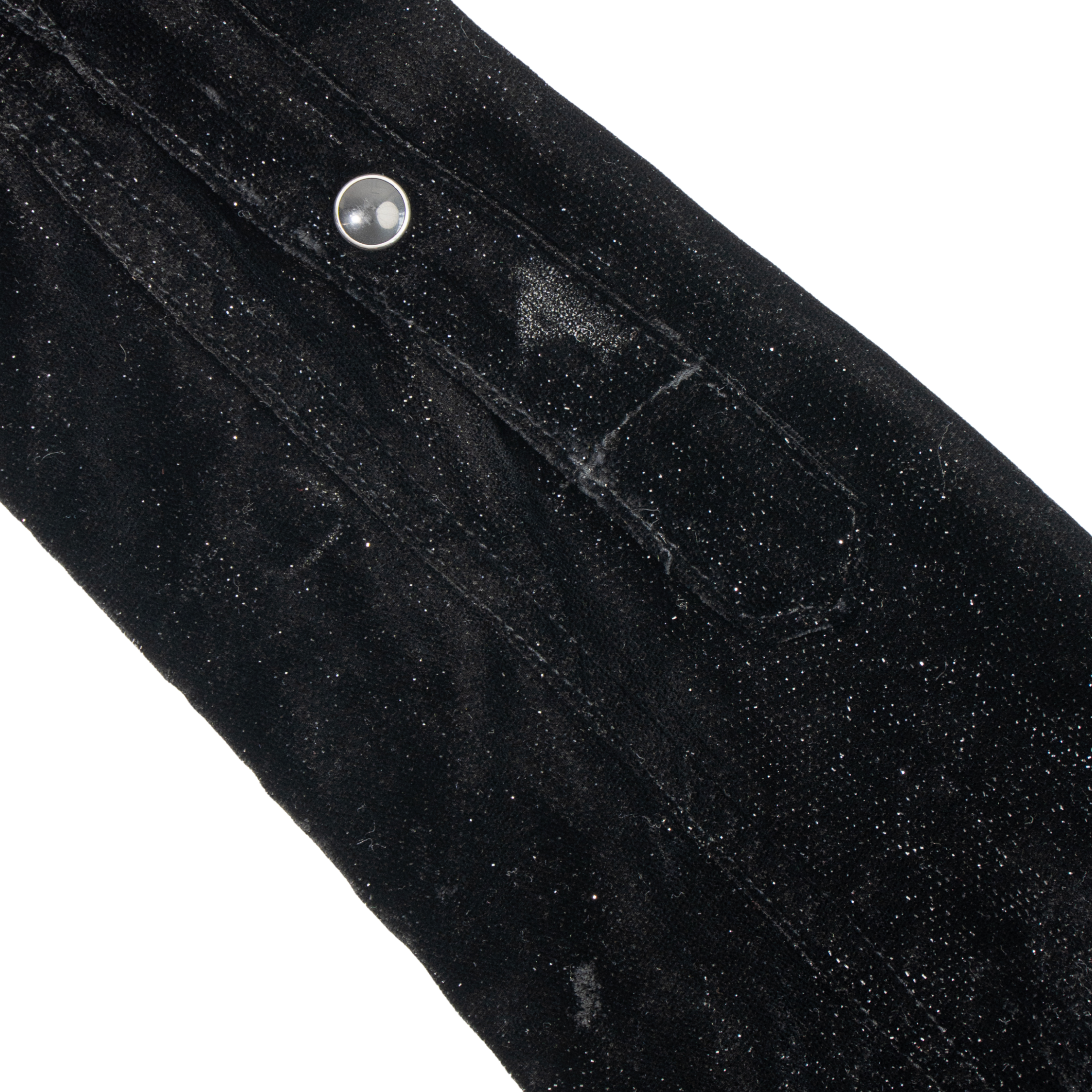 Saint Laurent western style button up shirt in a black velvet with sparkly silver threads running through it. Features black snap buttons down the front and on sleeve cuffs, snap closure flap pockets on the chest, and a spread collar. From Spring/Summer 2018 collection.