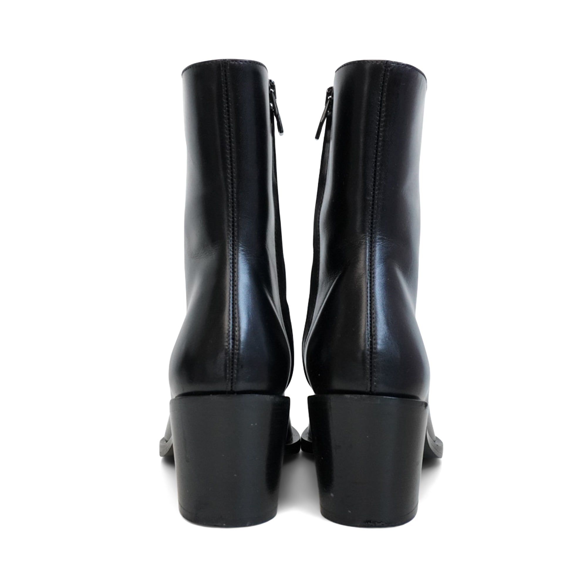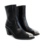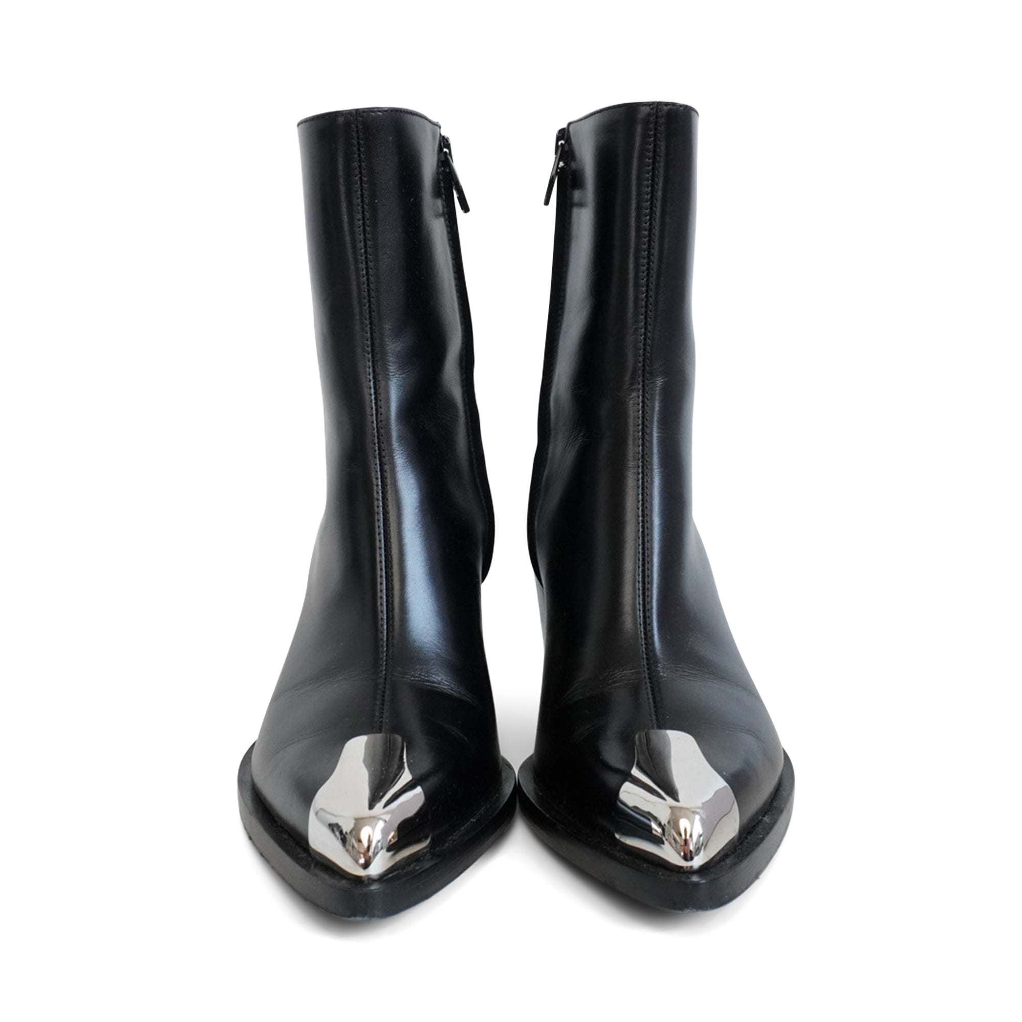 Alexander McQueen ankle boots in black calf leather with silver toe cap, angled stacked wood heel, and zip closure down the inner ankle..