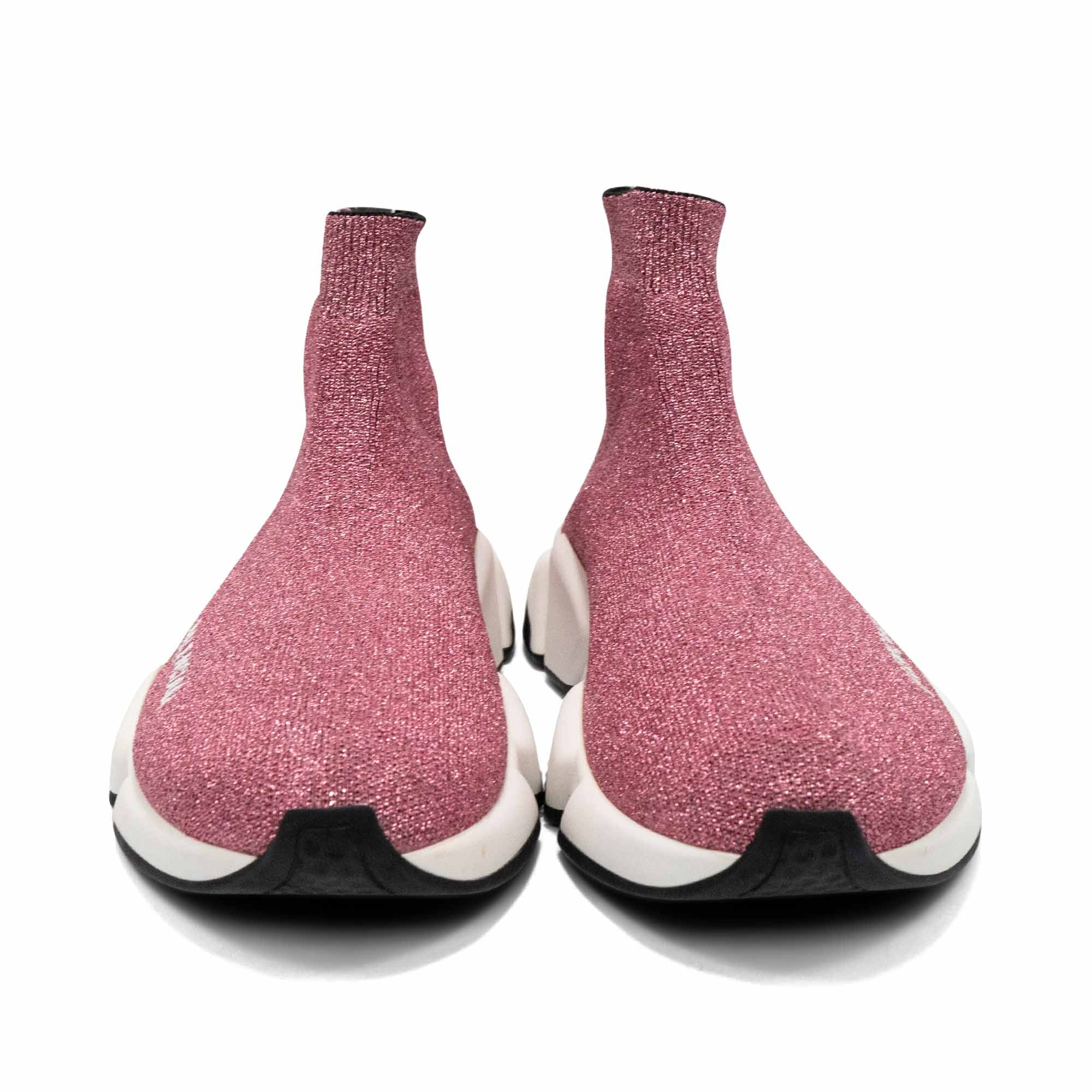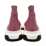 Balenciaga 'Speed Lurex Trainer' sock sneakers in metallic pink stretch knit with white chunky outsoles. Features white embroidered logo on outer side, black soles and interior, and ribbed detail around ankle.