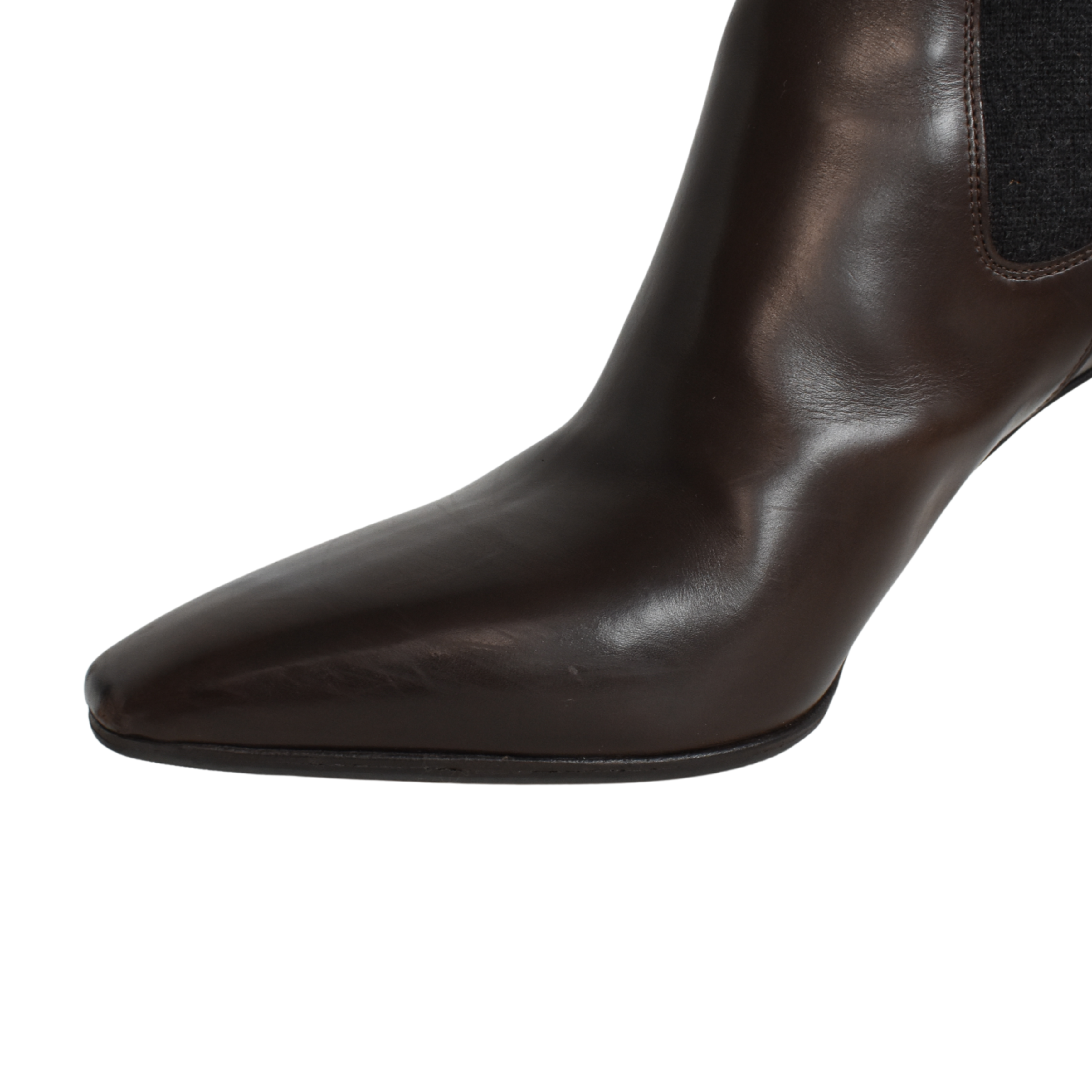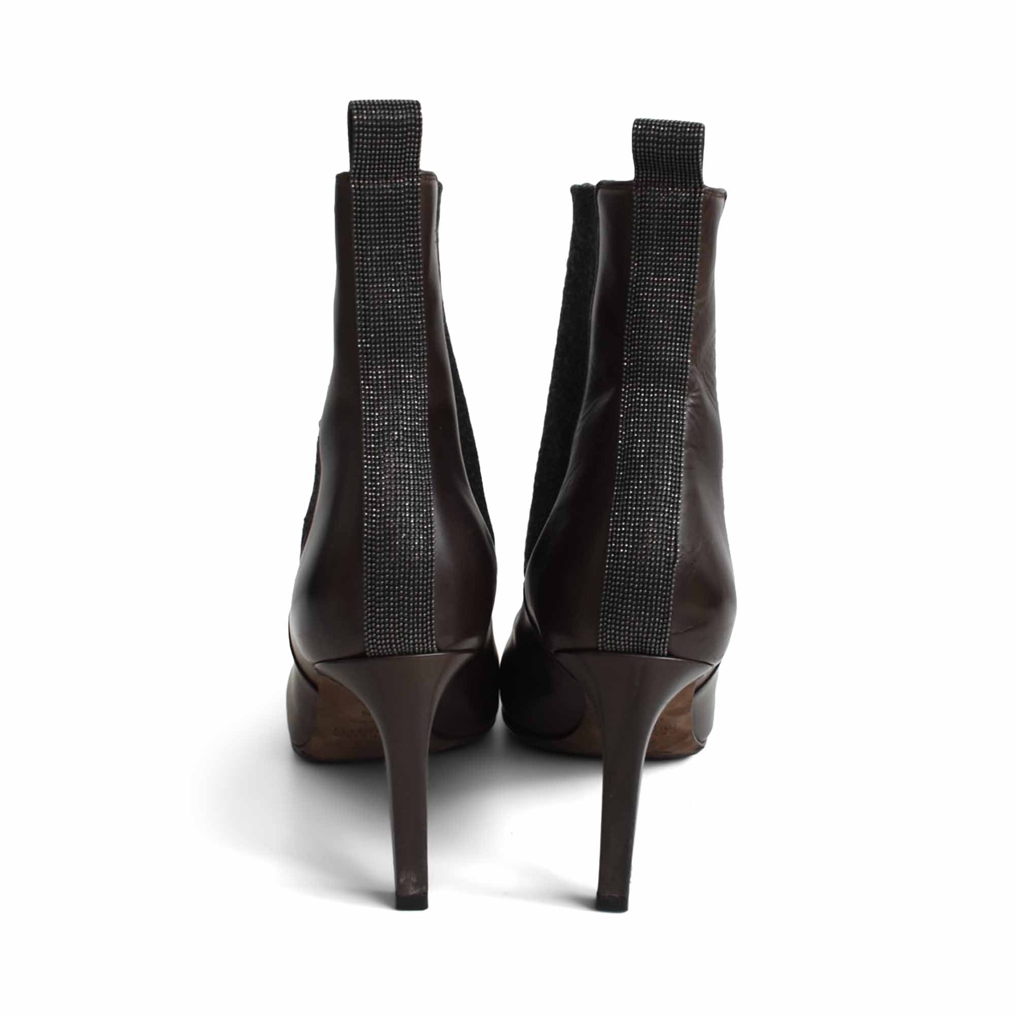 Brunello Cucinelli ankle boots in dark brown leather with charcoal grey elastic panels and signature gunmetal monili beading down the back of the ankle.