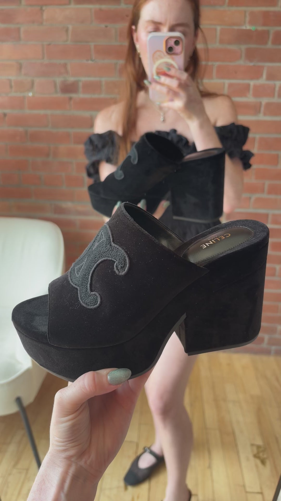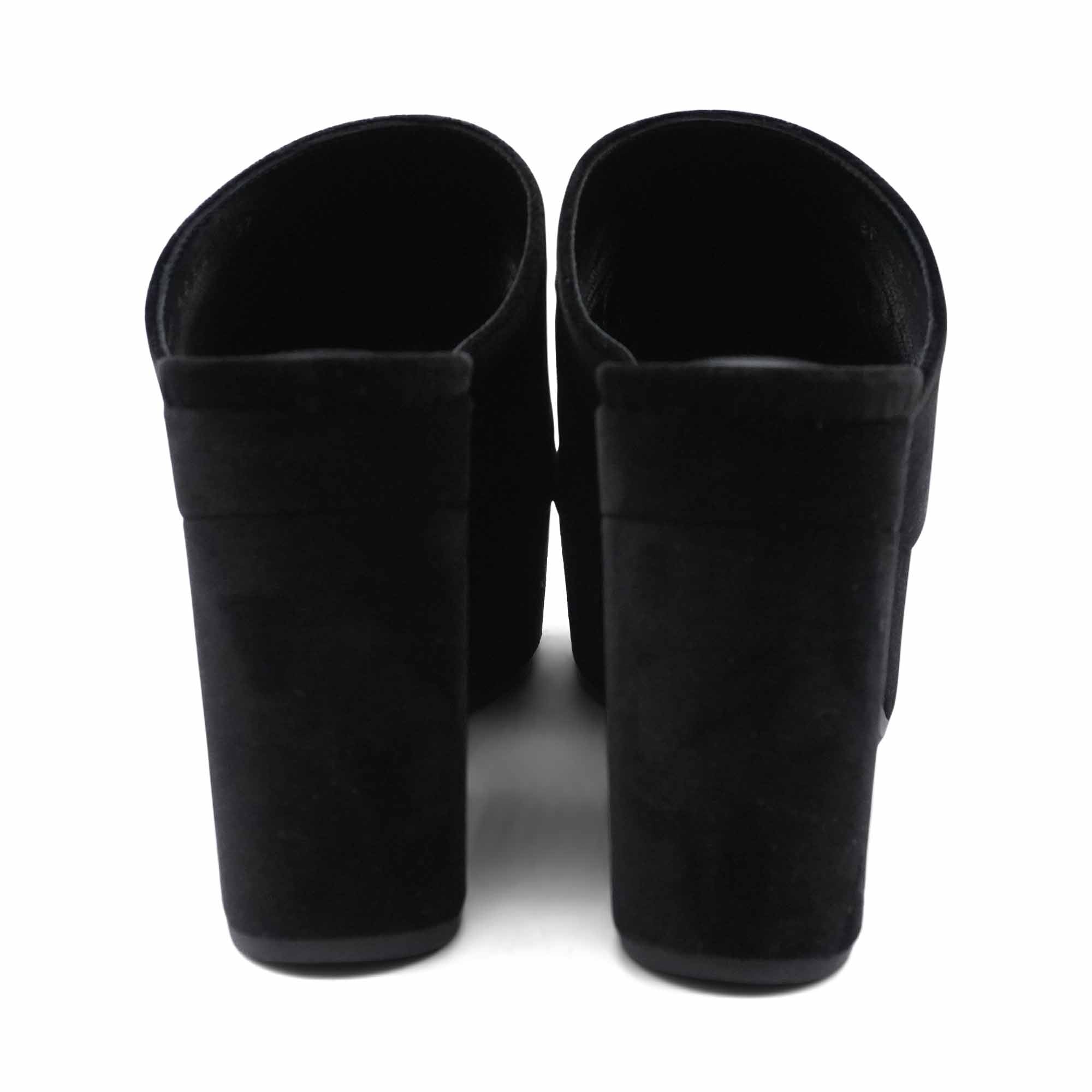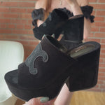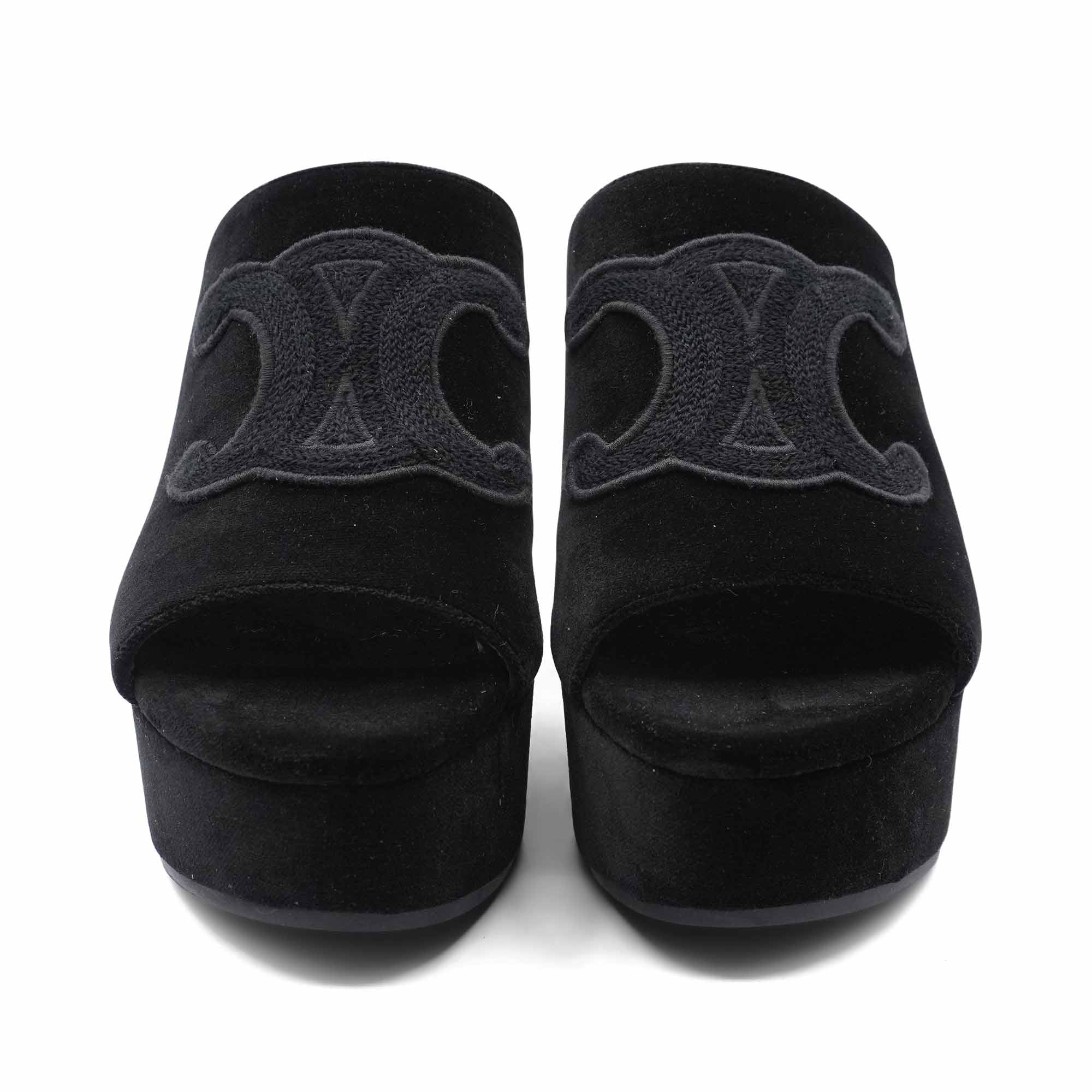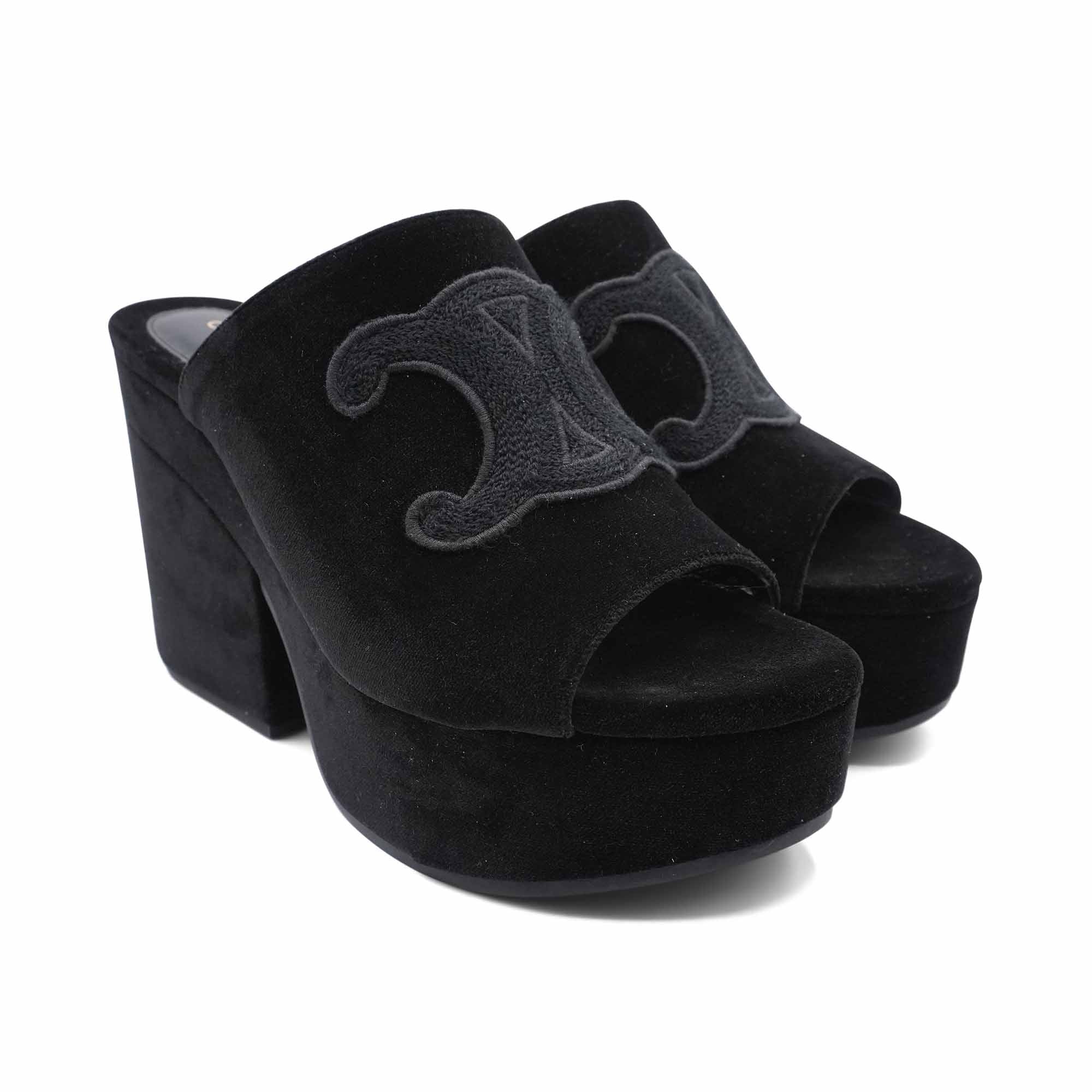 Celine 'Elena' mules in black velvet with a large embroidered triomphe logo on the top, a chunky platform heel, and a peep-toe.
