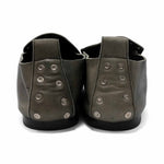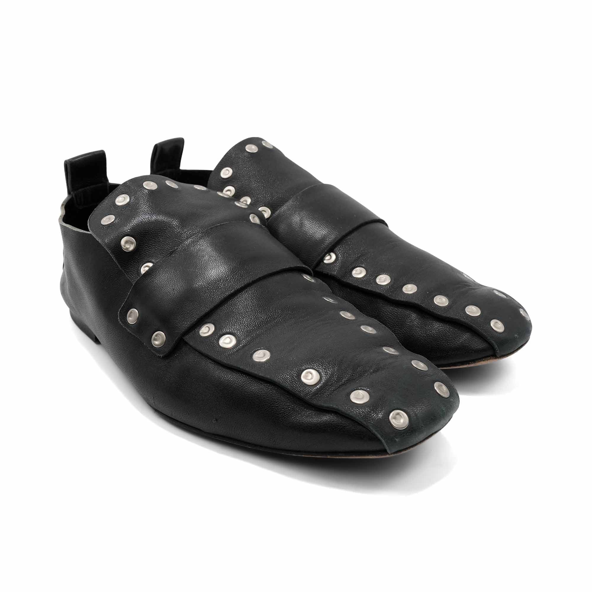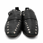 Celine loafers in black leather with round silver stud details. Features faded grey heel, leather pull tab at back and an oversized tongue.