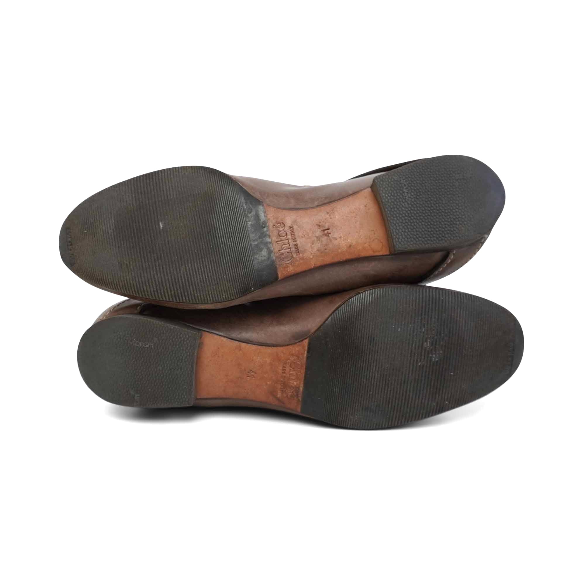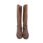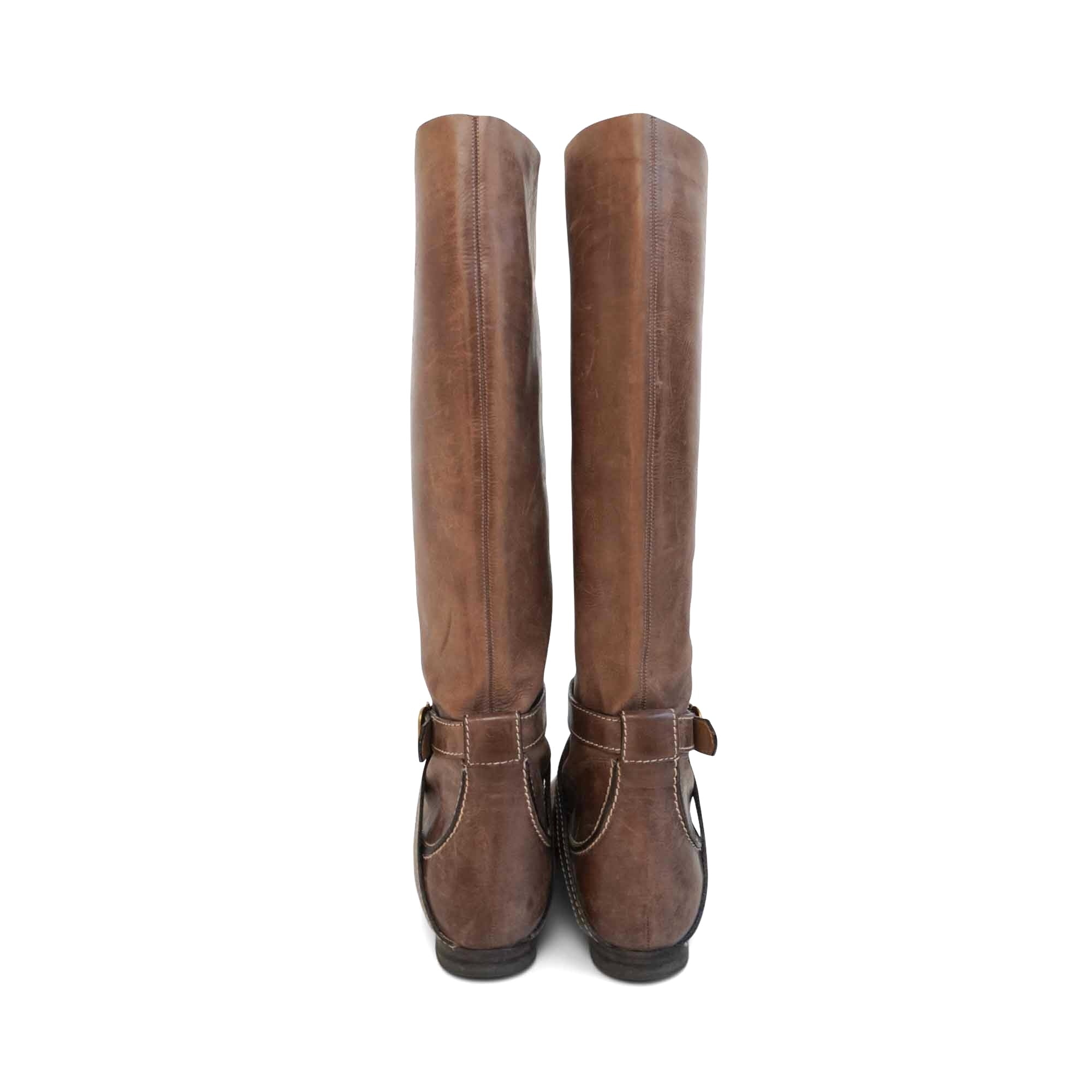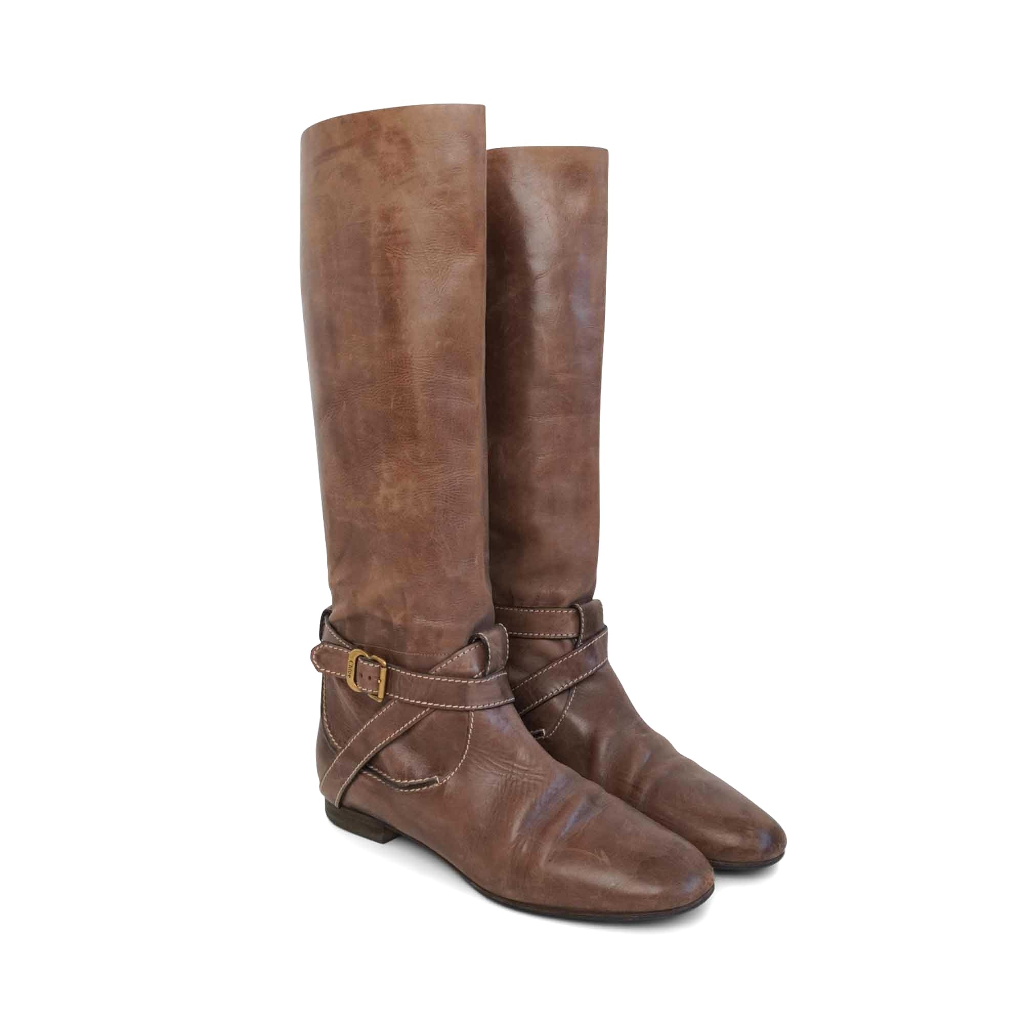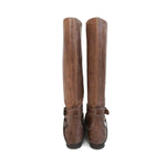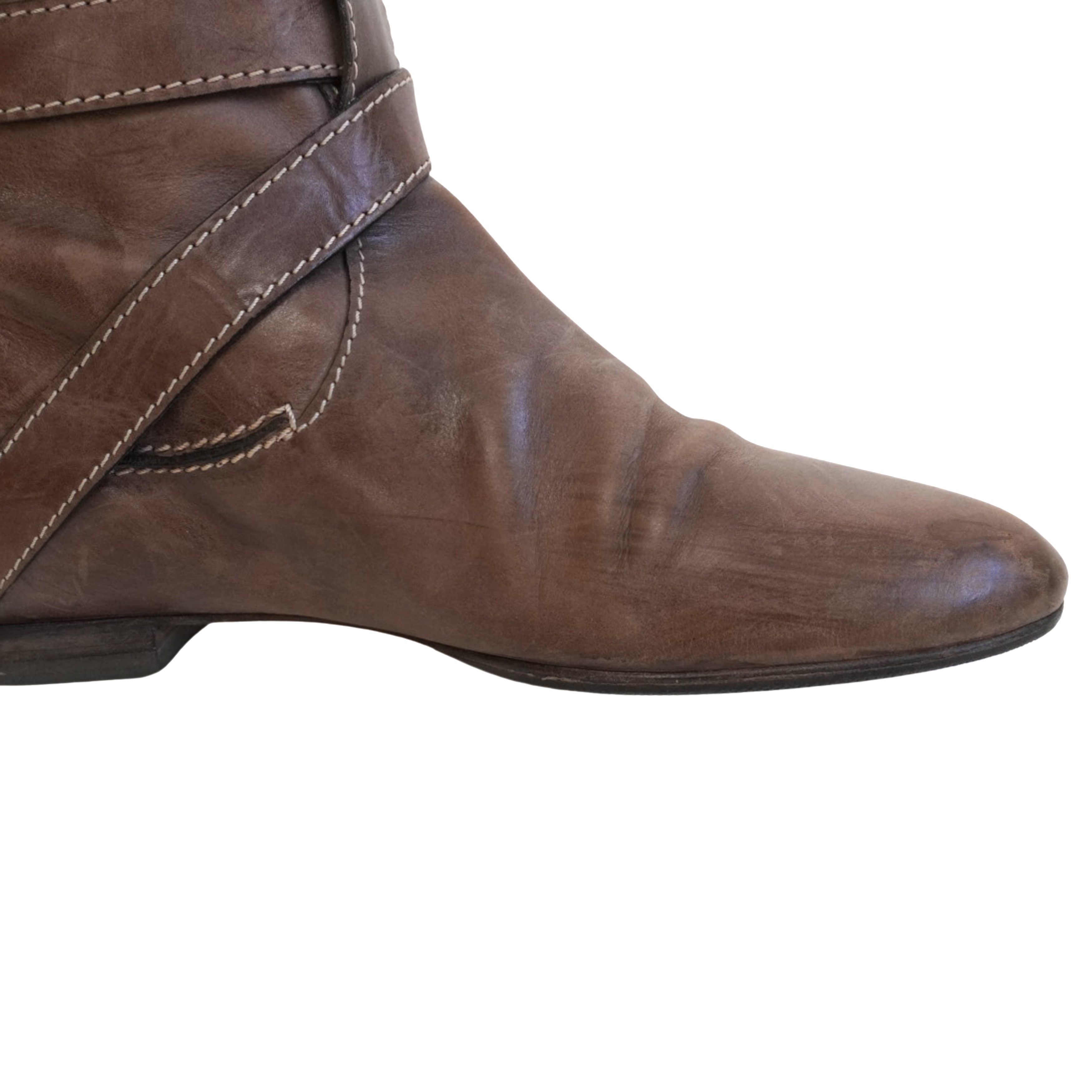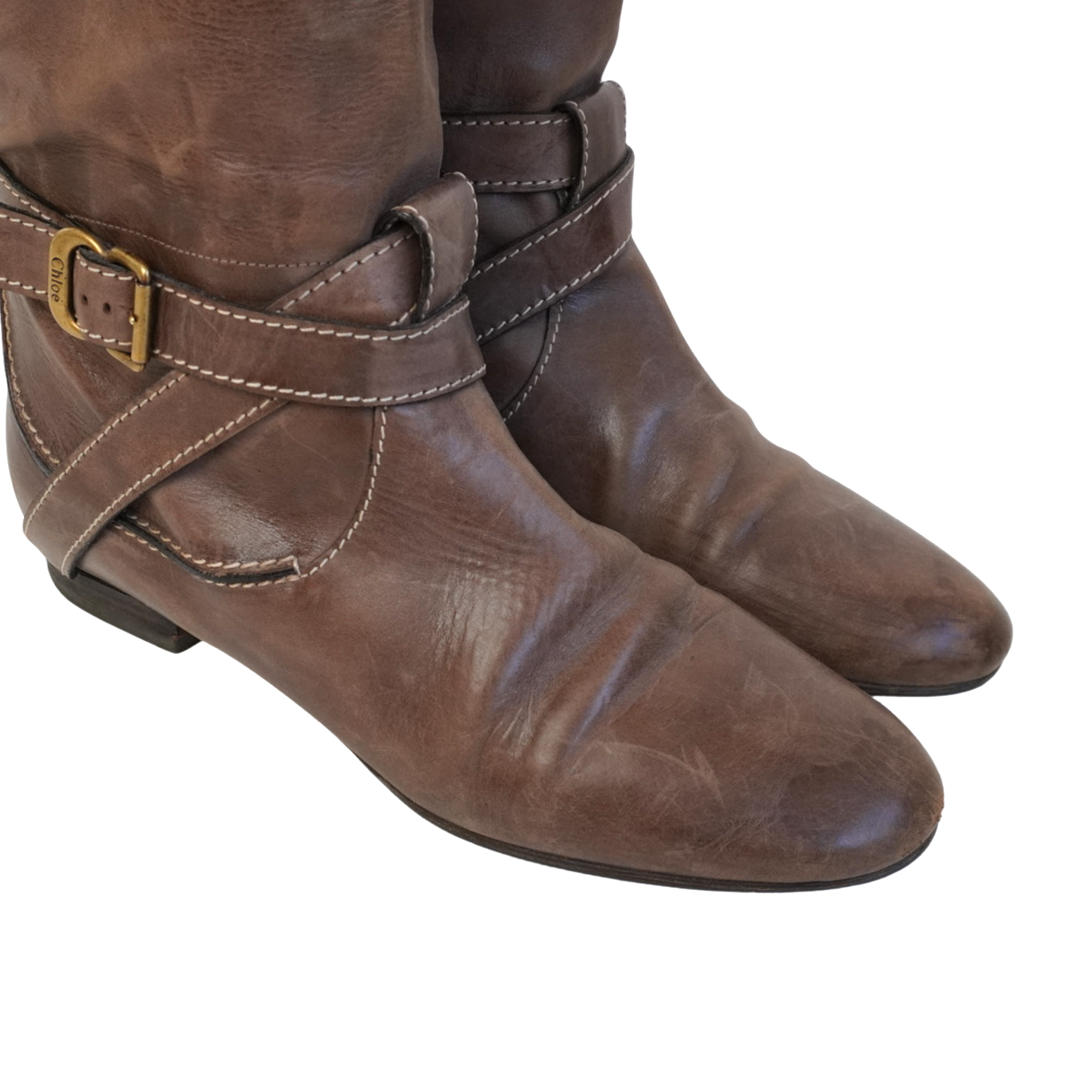 Chloe knee-high boots in faded brown leather with wrapped straps at the ankle and a gold buckle detail.