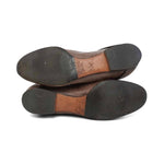 As is. Scratching and watermarks throughout leather, tarnishing in buckle hardware.