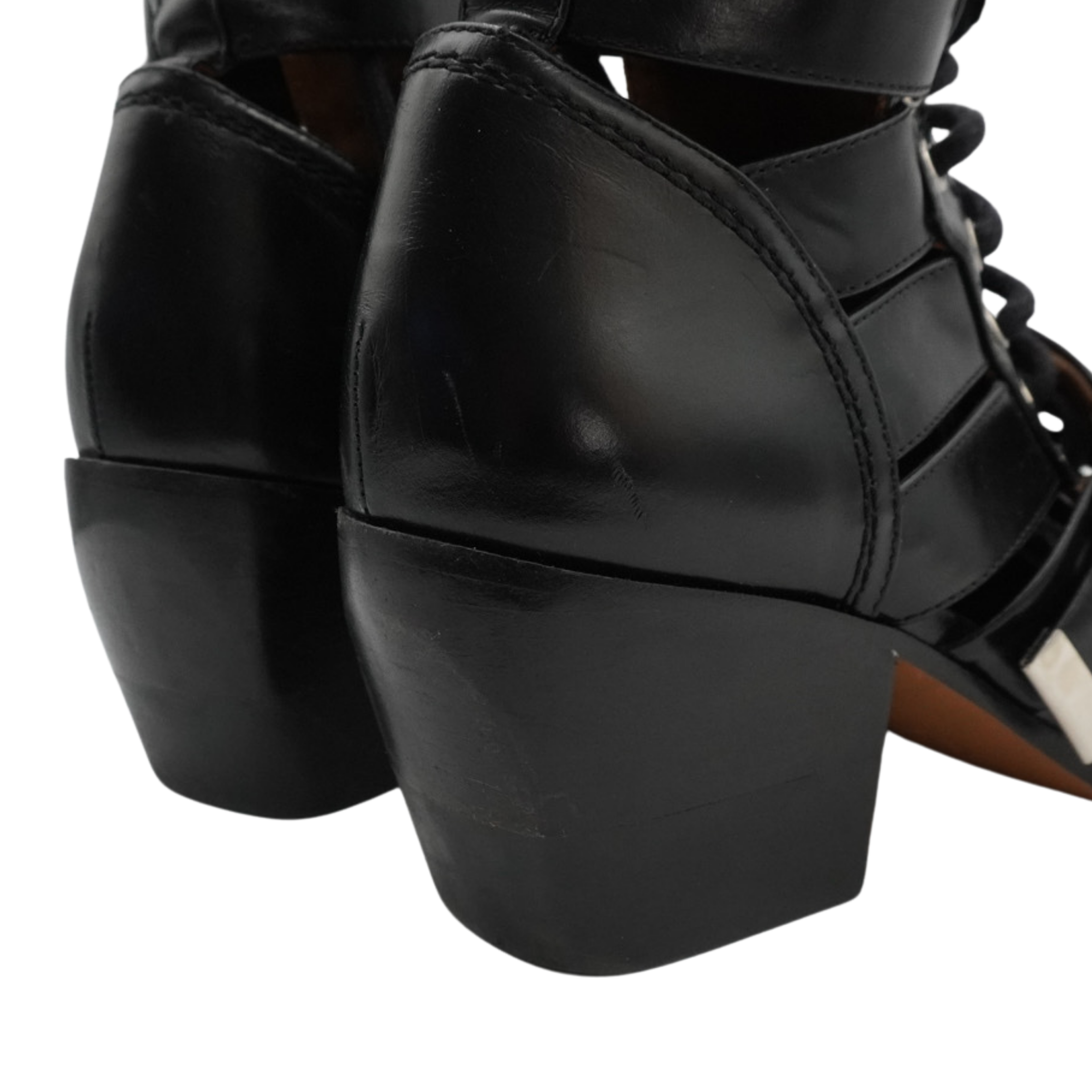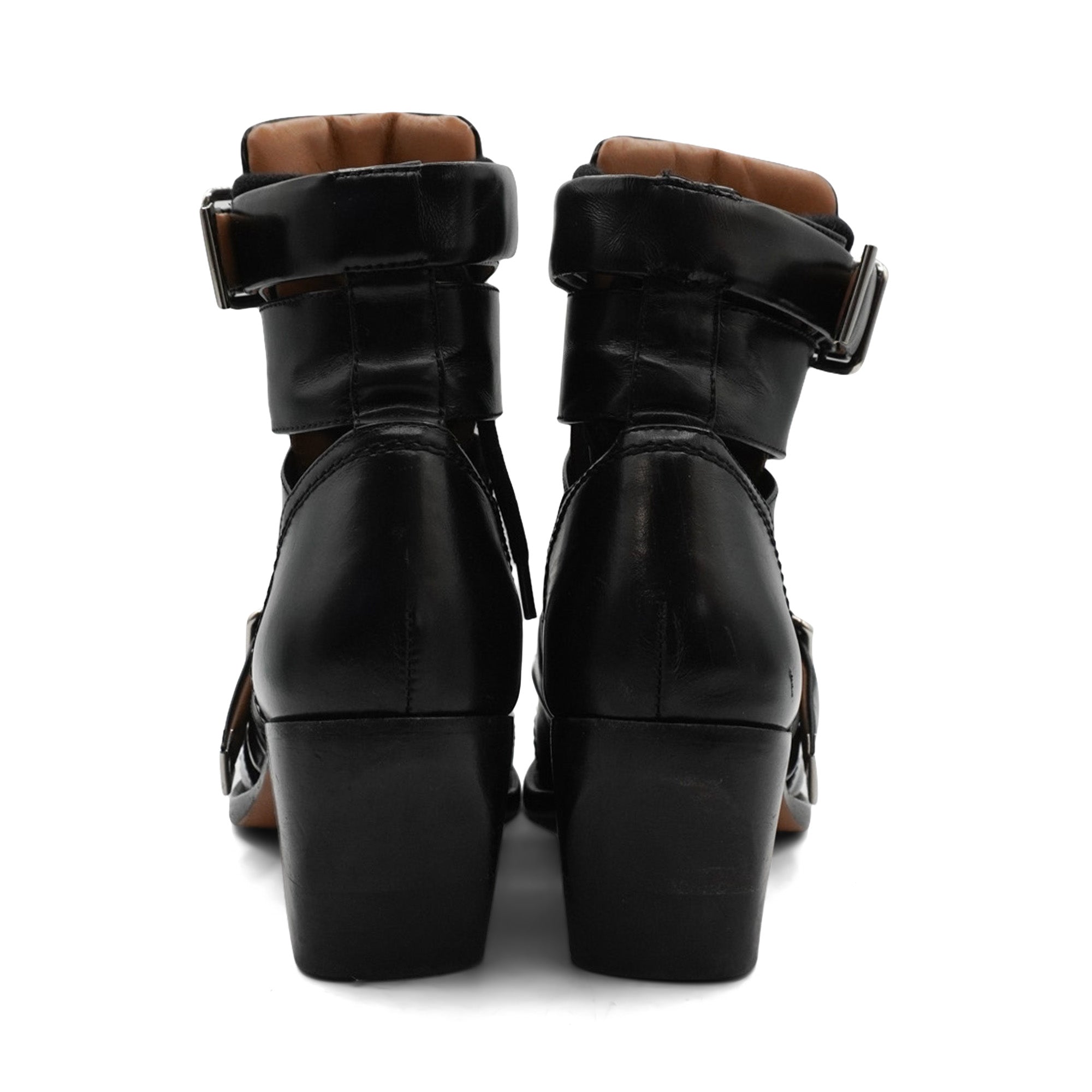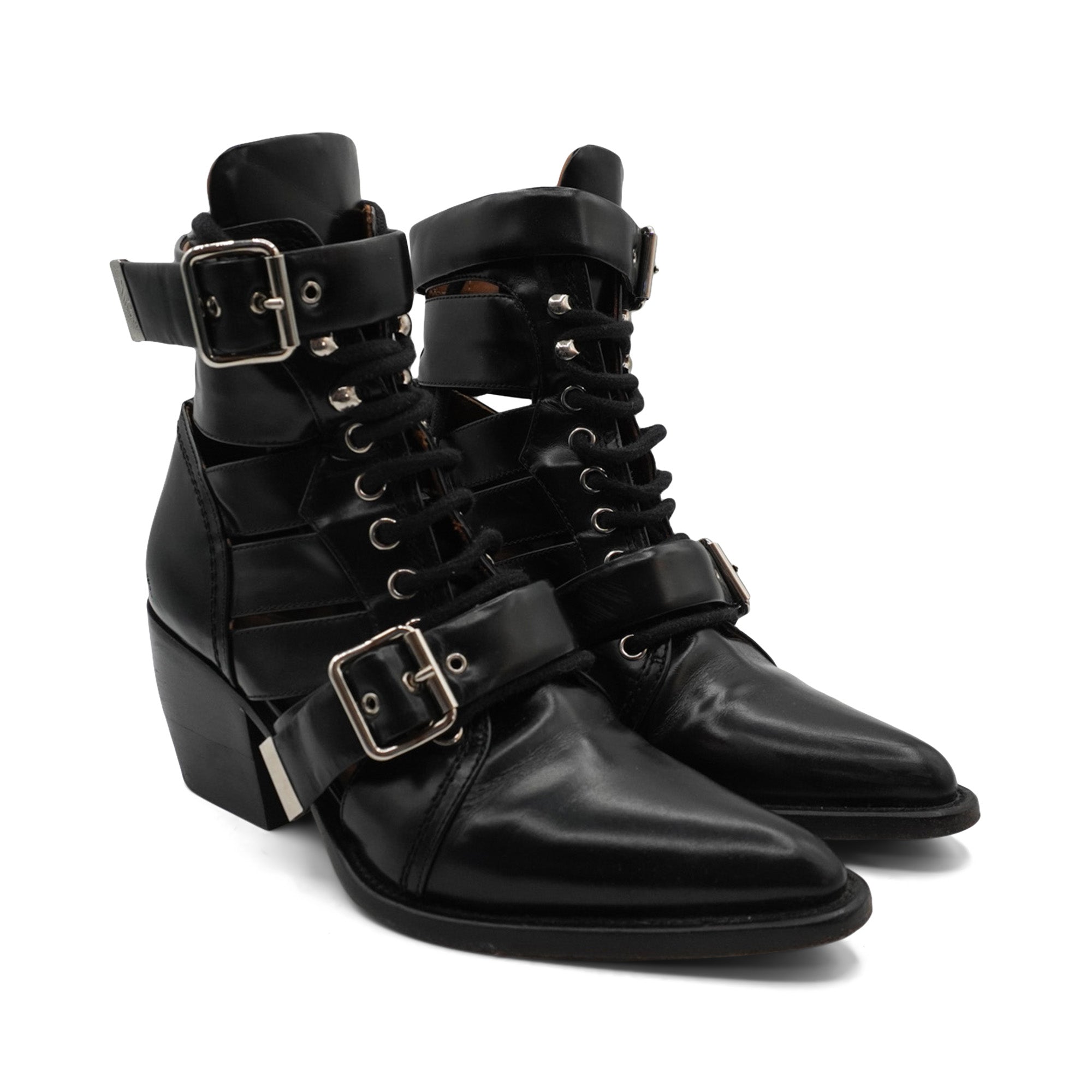Chloe 'Rylee' ankle boots in black leather with cutouts throughout, a lace up front, strap details with silver buckle hardware, a chunky wooden heel, and a pointed toe.