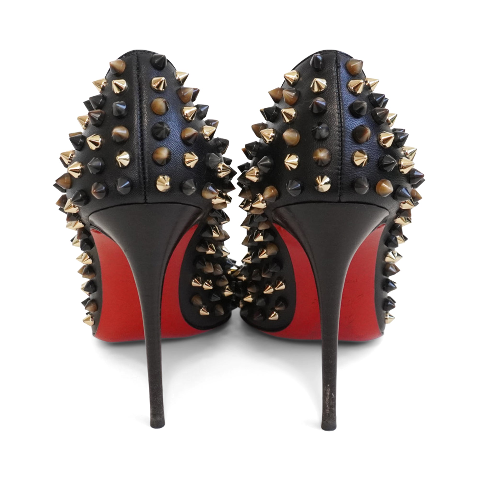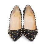 Christian Louboutin 'Pigalle Follies Spike' pointed toe pumps in black nappa leather with black, gold, and tortoiseshell spike studs throughout.