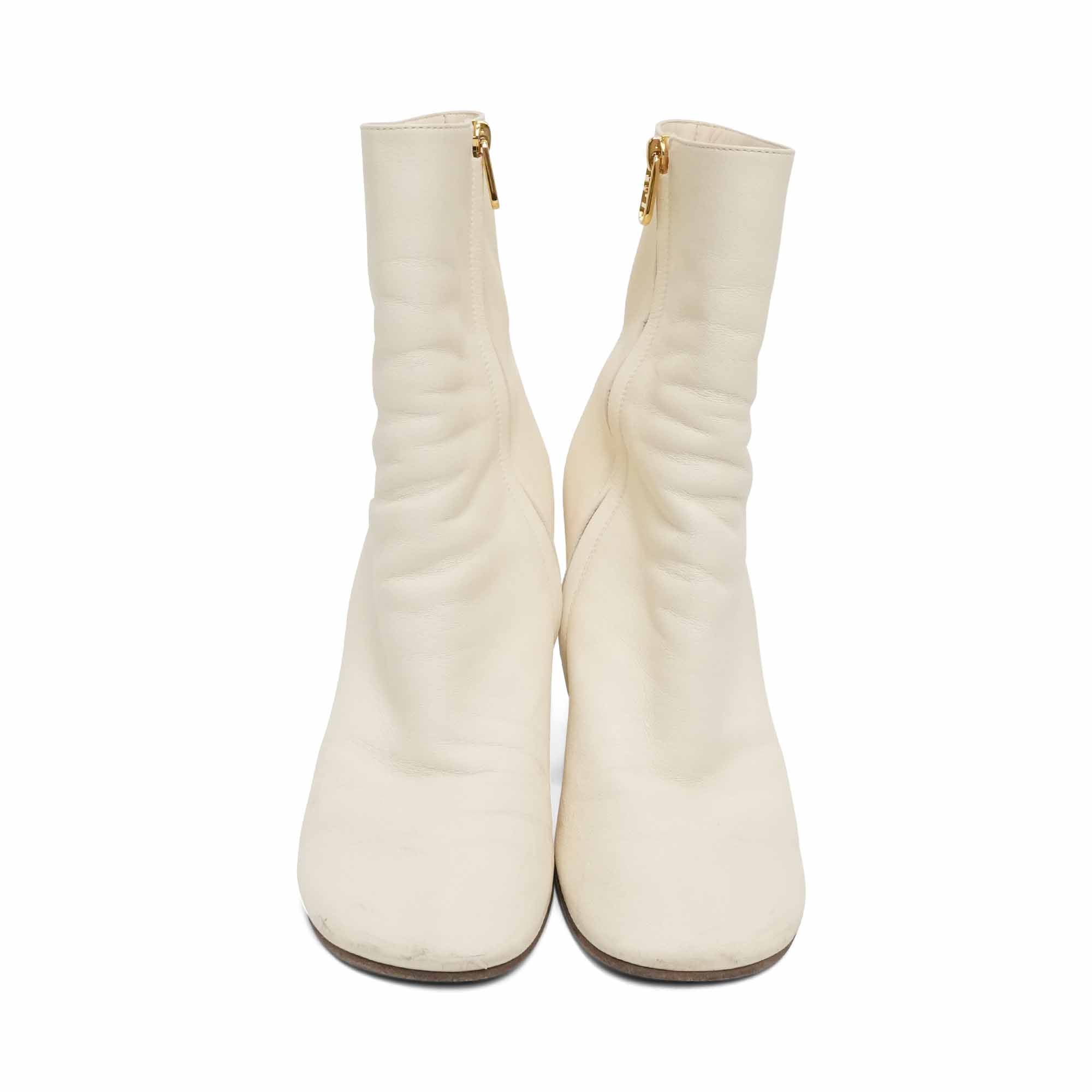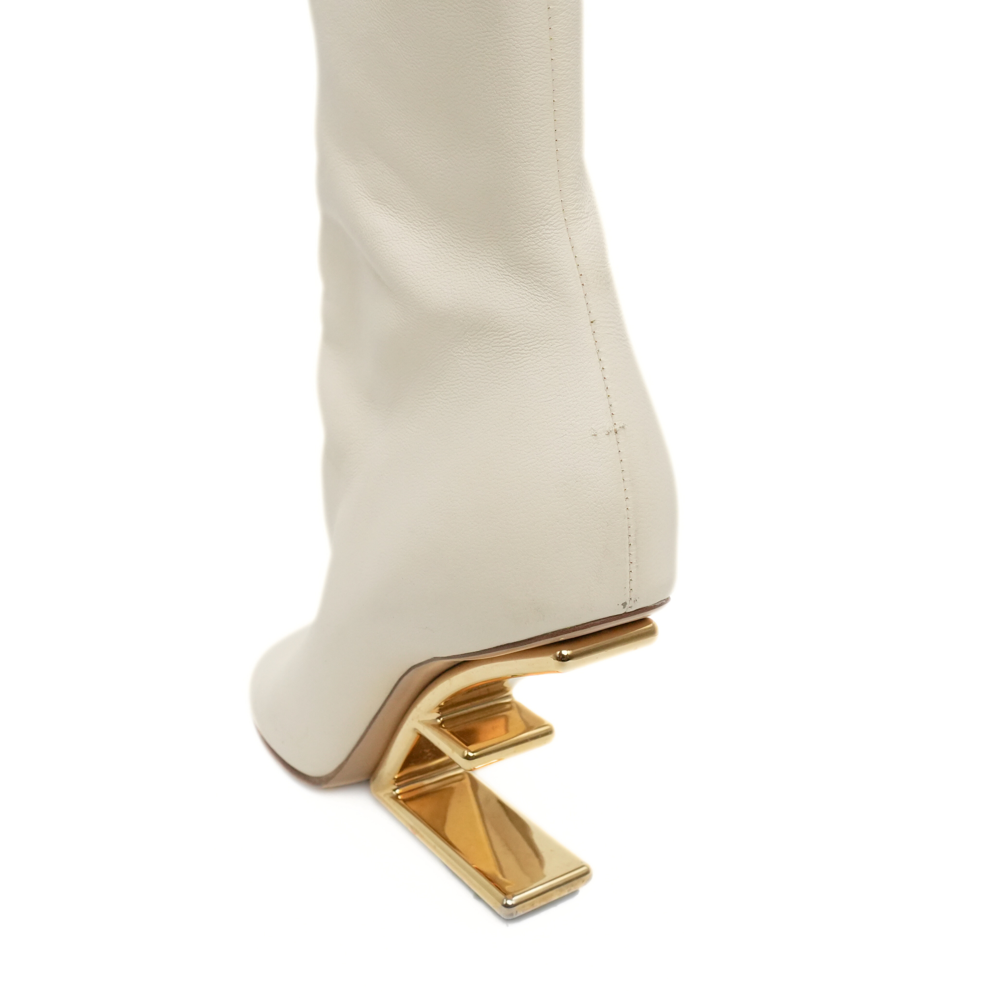 Fendi 'First' ankle boots in cream leather with an angular gold 'F' metal heel, a side zip opening with a large 'FF' pull tab, and an almond toe.
