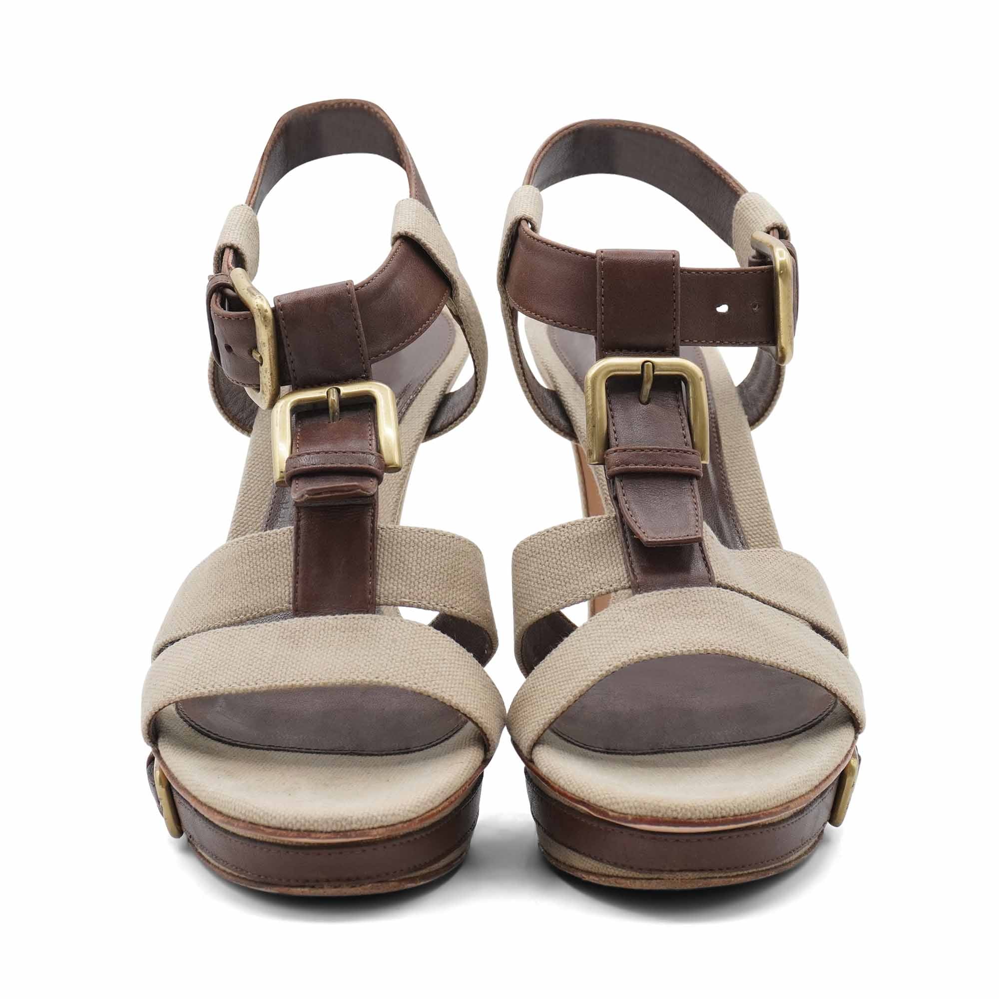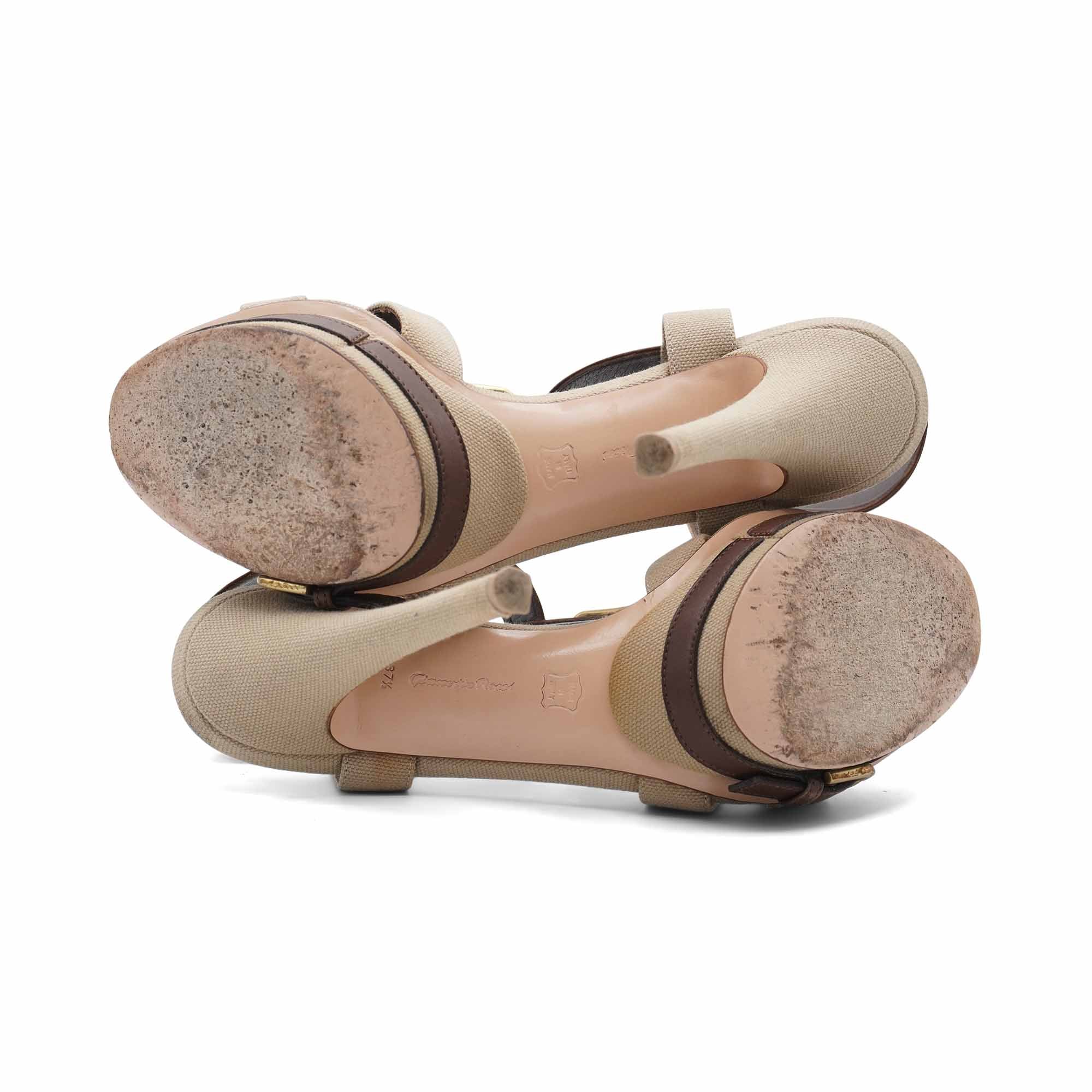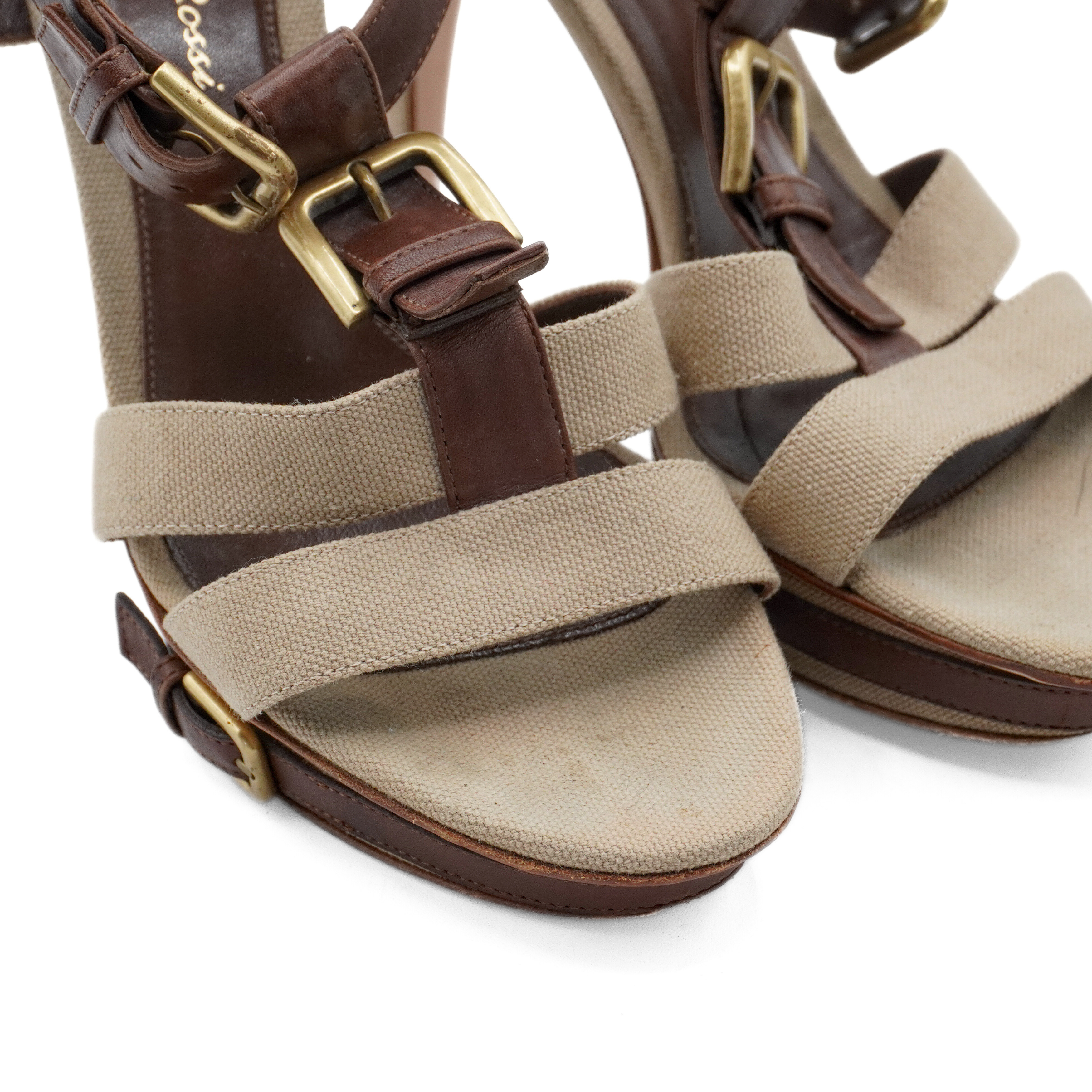 Gianvito Rossi strappy heels in beige canvas with brown leather ankle T-strap and decorative brushed gold buckle strap on the platform sole.