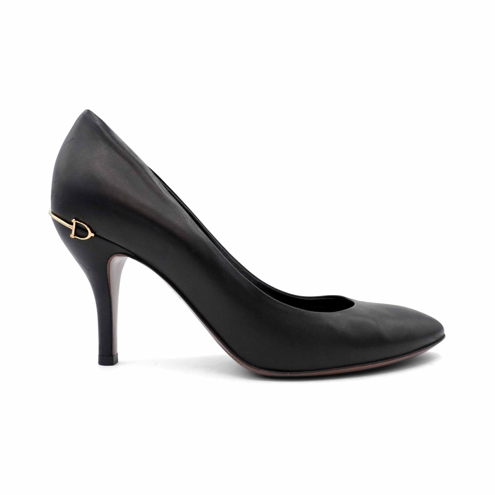 Gucci pumps in black leather with a curved heel, a gold metal horsebit detail on the back, and an almond toe.