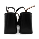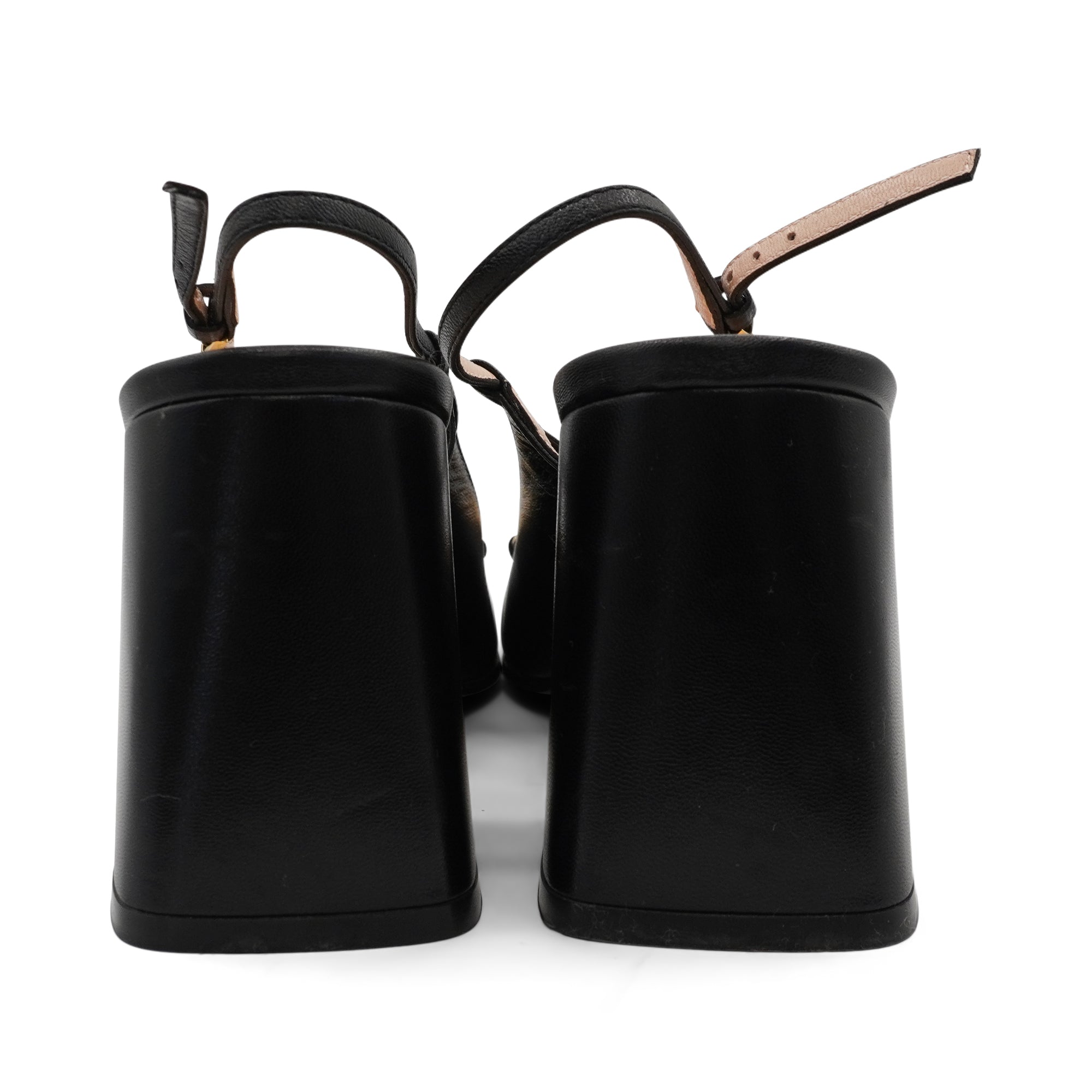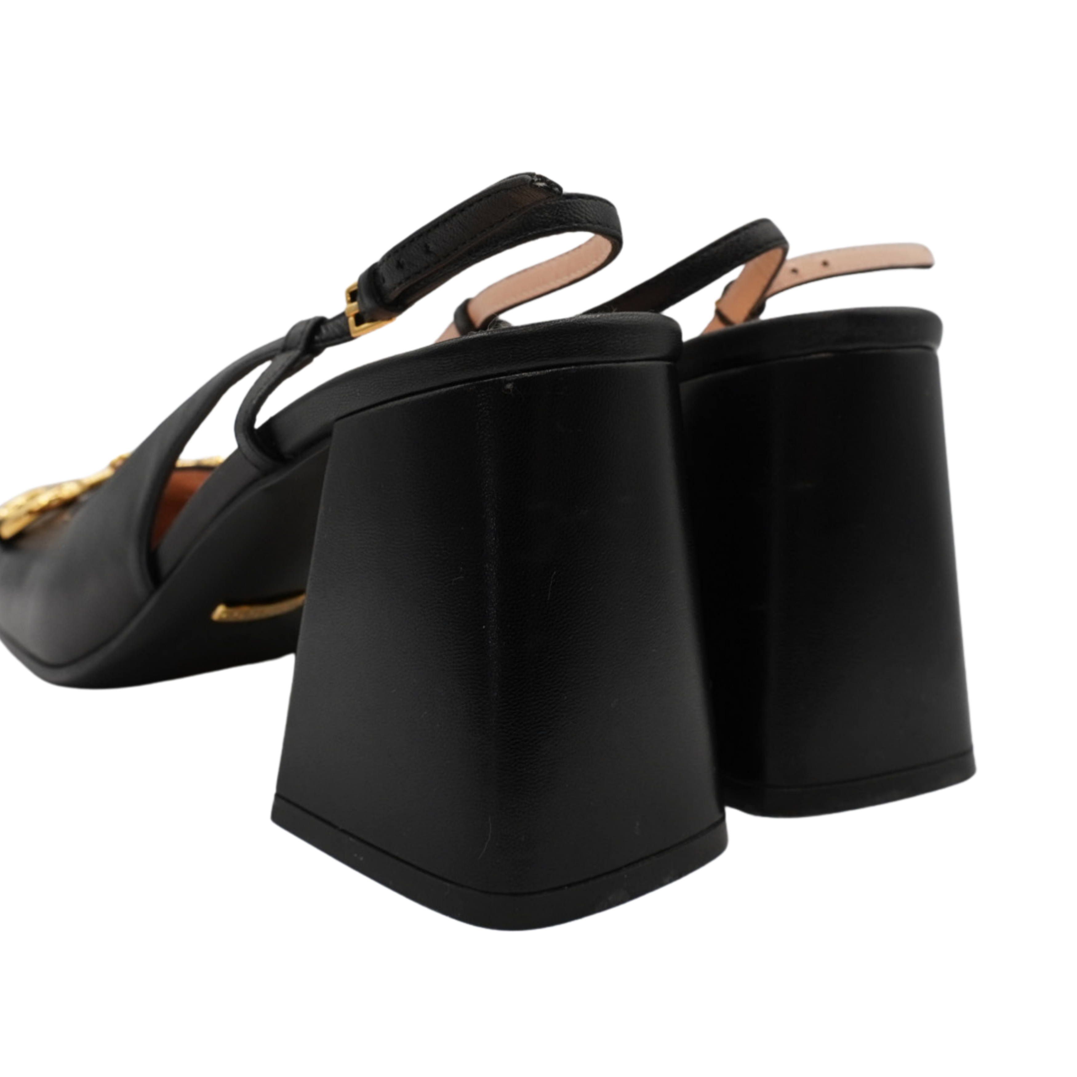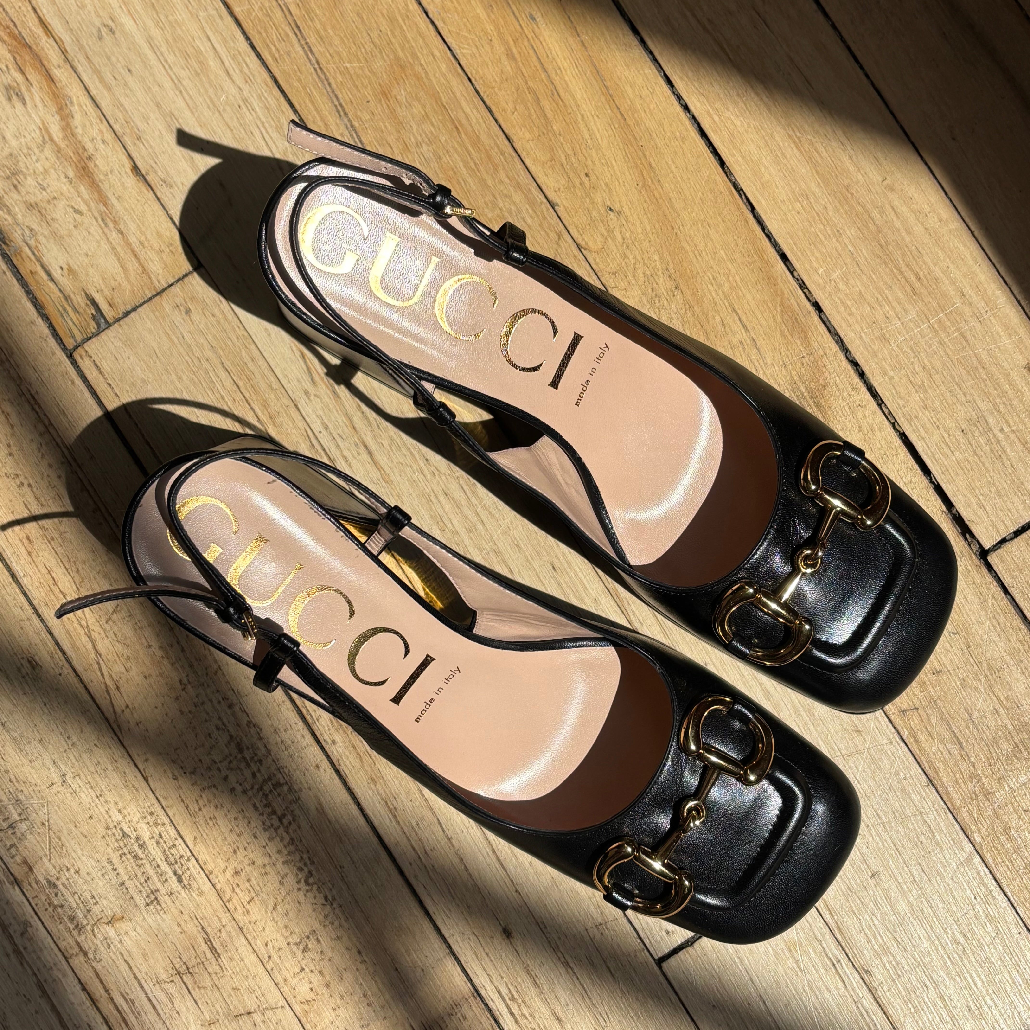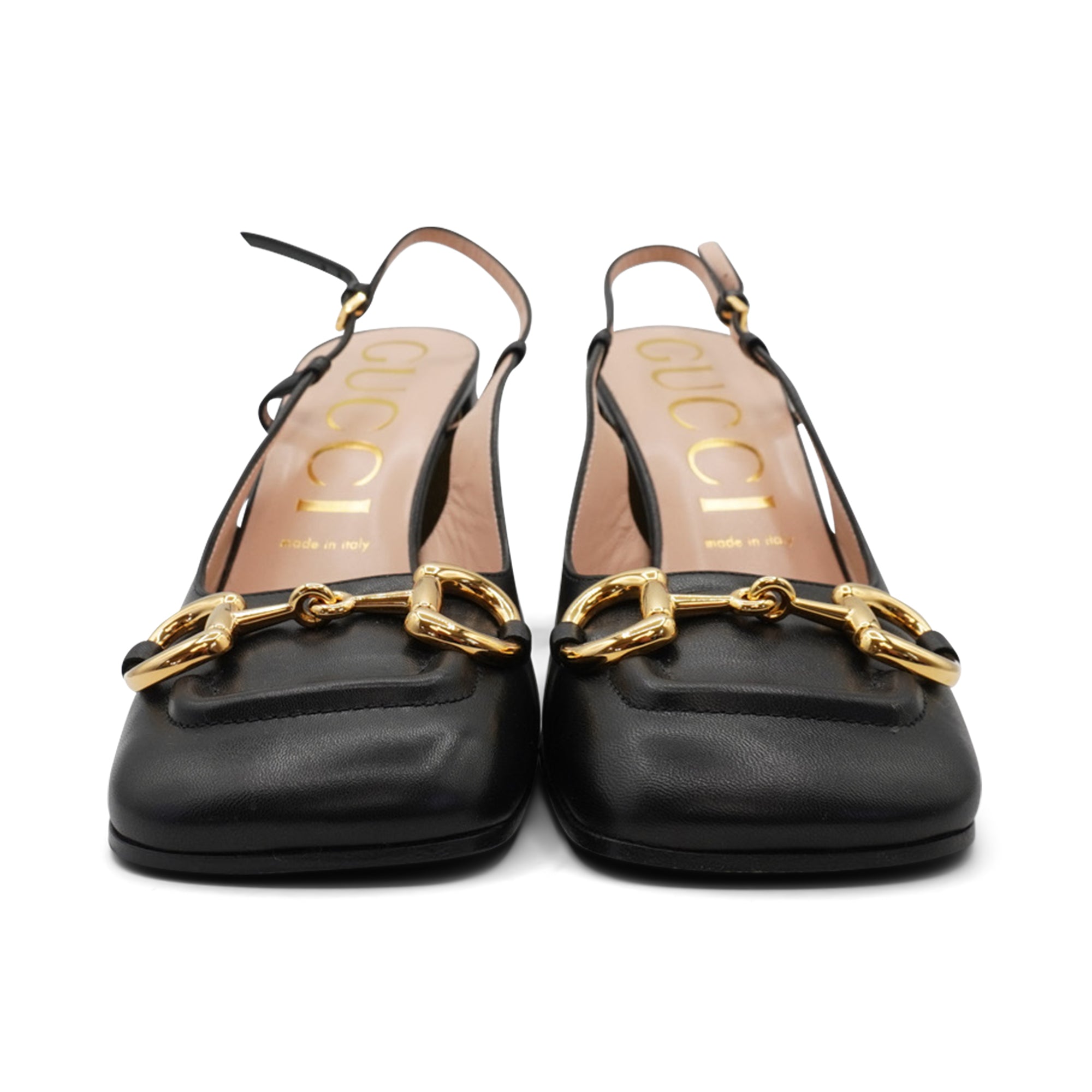 Gucci slingback heels in black leather with a block heel, a square toe, and a large gold Horsebit detail on the upper.
