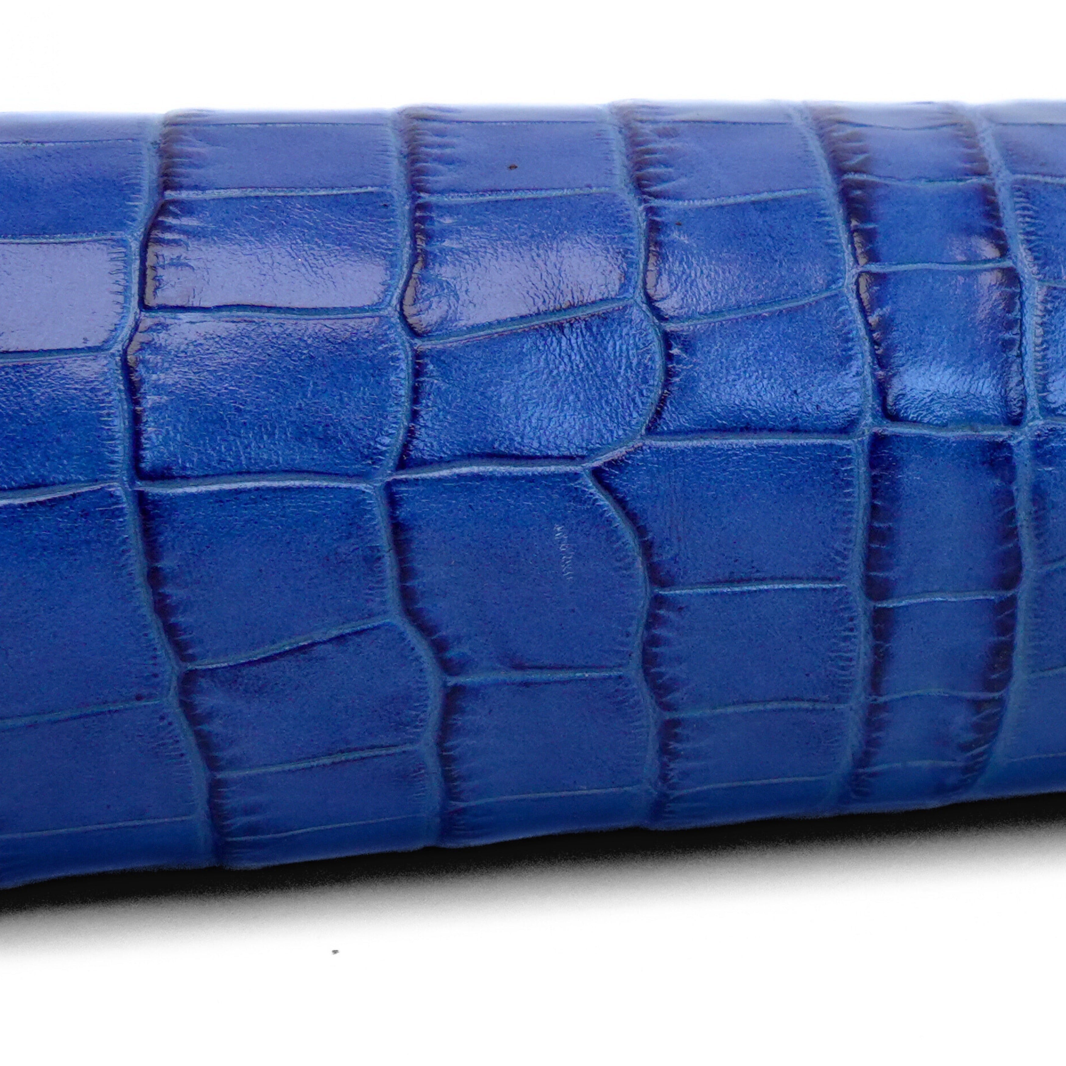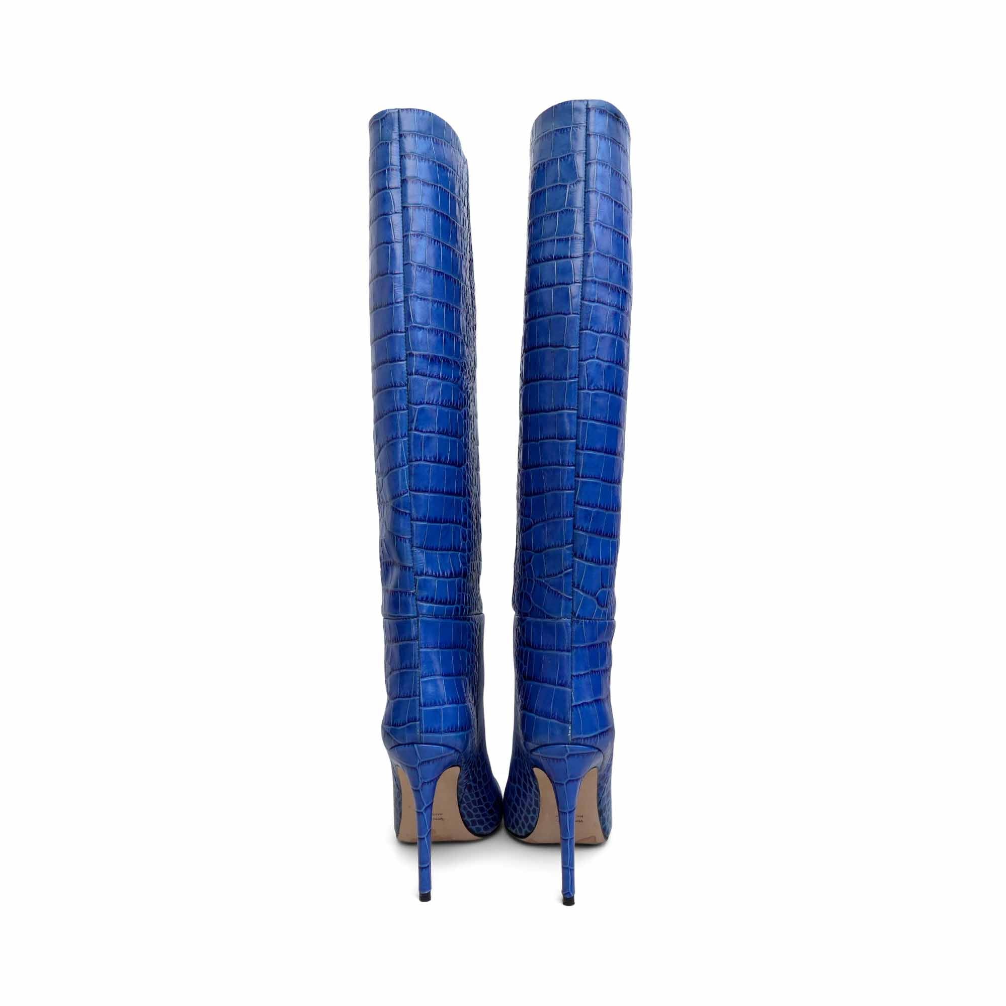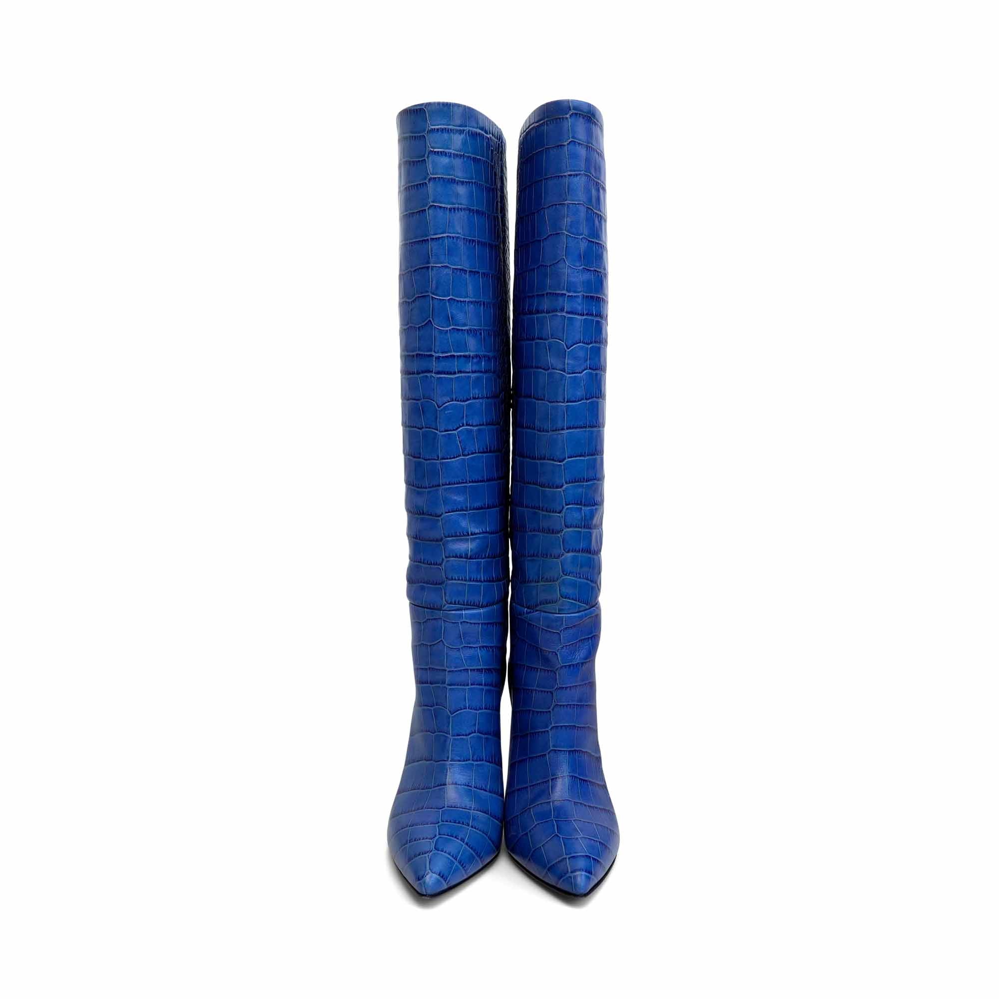 Paris Texas knee high boots in blue crocodile embossed leather with pointed toes and stiletto heels.
