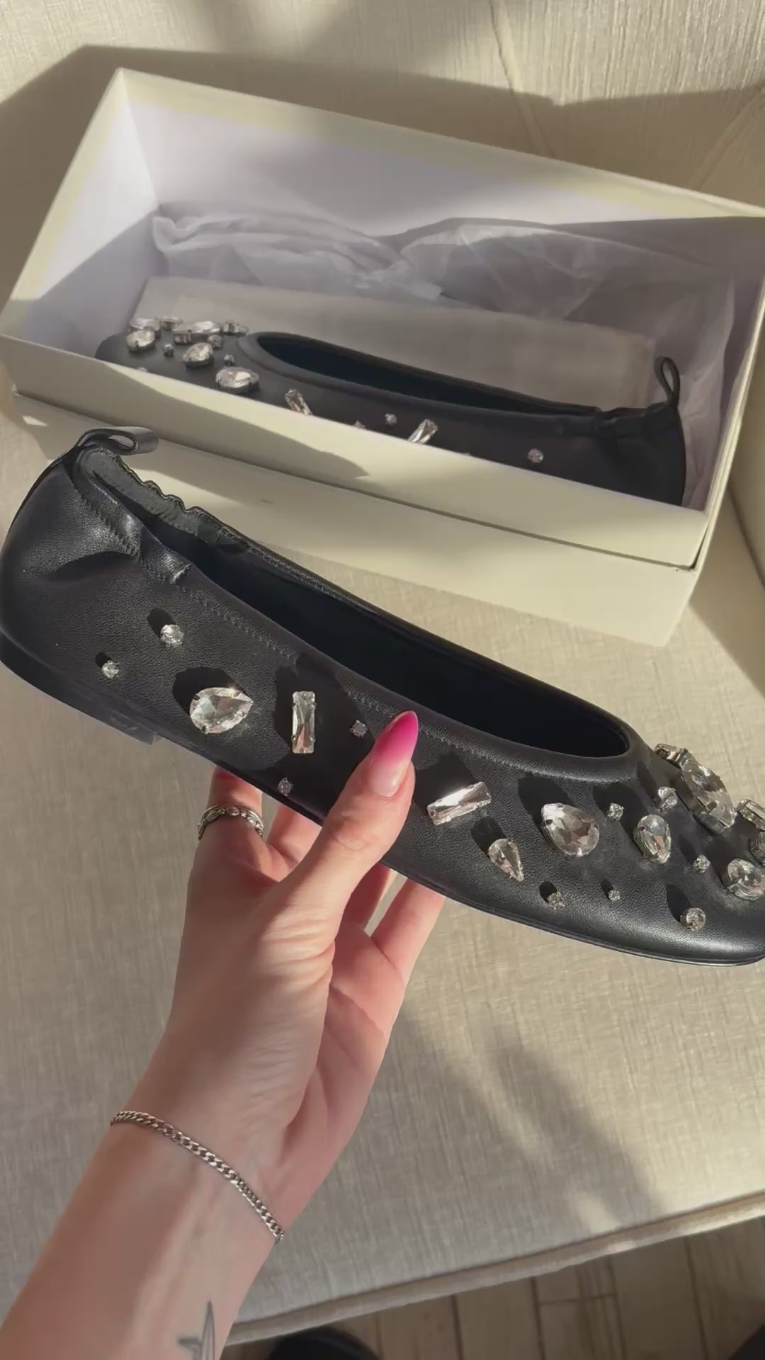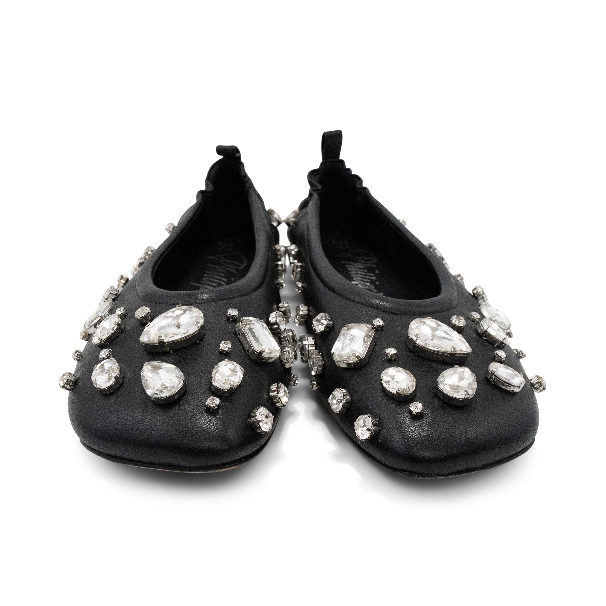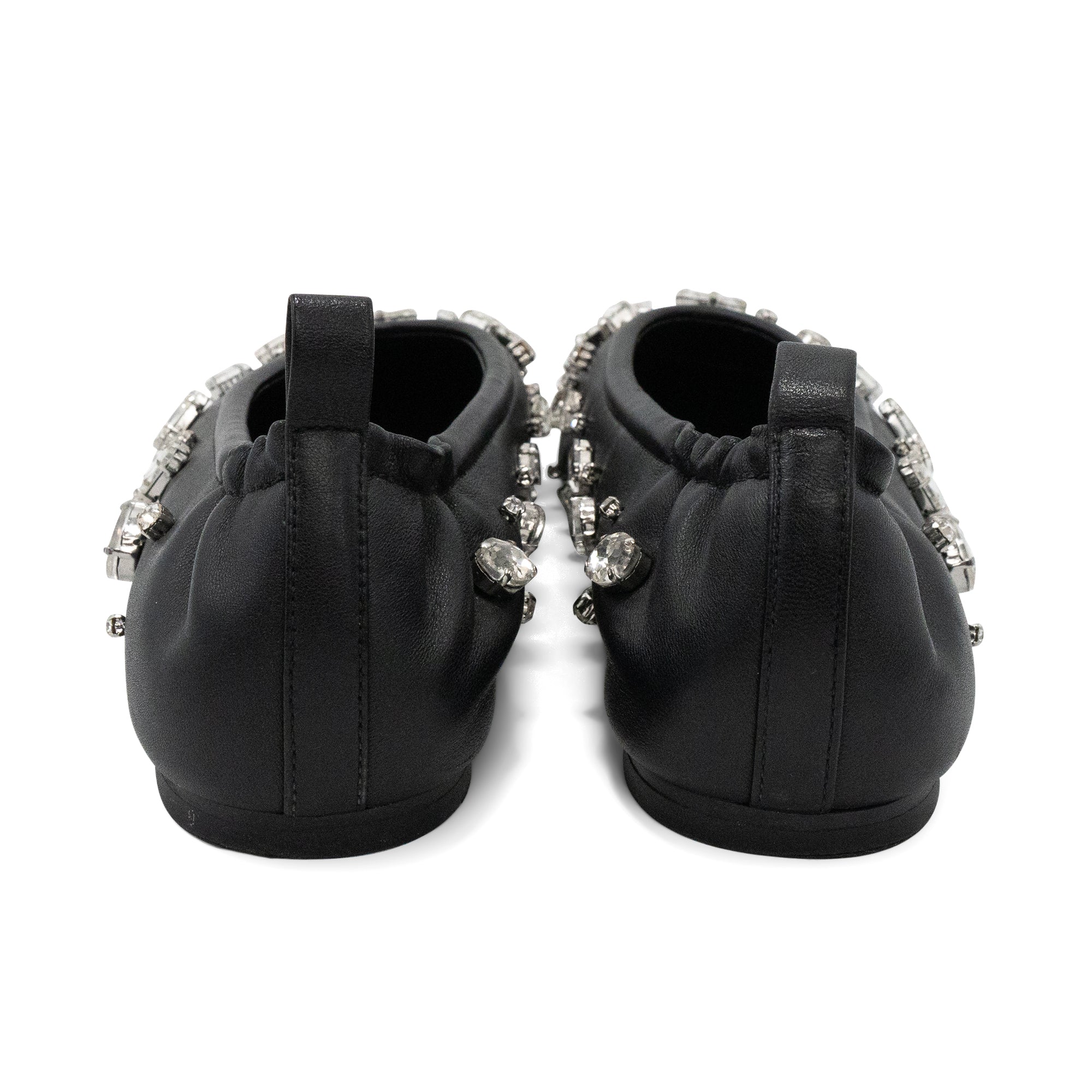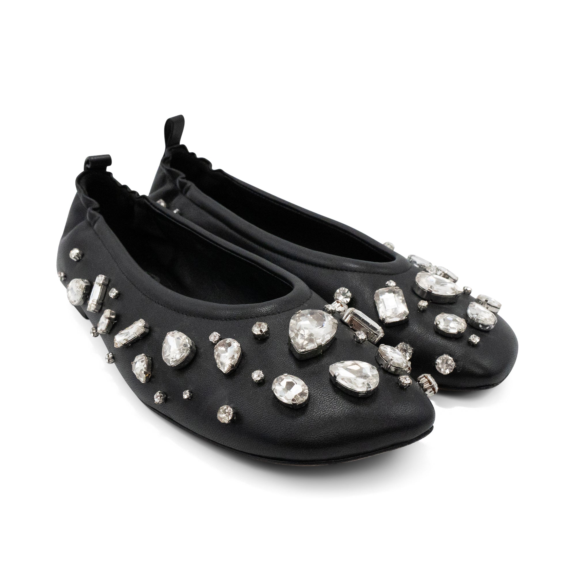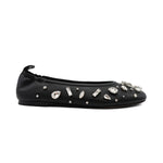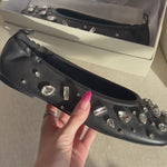 Phillip Lim 'ID Stretch' black soft leather ballet flats with large crystal gems all over. Features leather pull tab at the heel, an angular toe, and elastic in the back of the shoe for easy slip on.